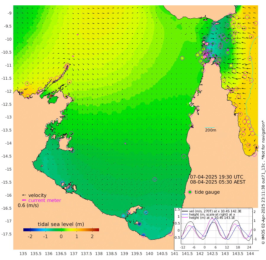 25cm/s 118T +3cm/s rms + 7cm/s -42T. ARA-GOC87 57m 24cm/s 160T +3cm/s rms + 2cm/s -2T. ARA-GOC87 60m 19cm/s 118T +2cm/s rms + 3cm/s 61T. ARA-GOC87 47m 12cm Daru 25cm Bobo Island 79cm Meer Island Barge 74cm Bramble Cay 47cm Unnamed Cay 44cm Pearce Cay 55cm Stephens Island 54cm Merrie England Shoals 22cm Mutacomal Reef 62cm Darnley Island Barge 85cm East Cay 38cm Yorke Island Barge 29cm Rennel Island 27cm Aureed Island 0cm Dungeness Reef -40cm Zagai Island -36cm Yam Island -54cm Dauan Island -44cm Saibai Island -67cm Phipi Reef -42cm Warrior Reef - West -39cm Mabuiag Island Barge 29cm Half Way Island 0cm Coconut Island 17cm Dugong Islet -19cm Poll Island -15cm Kirkcaldie Reef -52cm Suarji Island -15cm Sue Islet 35cm Hawkesbury Island -34cm Alert Patches -31cm Twin Island 4cm Badu Island -49cm St Pauls (Moa Island) 6cm Kubin (Moa Island) -28cm Ince Point -19cm Thursday Island -23cm Nardana Patches -2cm Turtle Head 7cm Round Island 30cm Goods Island 41cm Booby Island 34cm White Rocks Area 43cm Carpentaria -36cm Papou Point 47cm Bampfield Head 25cm Crab Island 37cm Red Wallis Island 22cm Packe Island 5cm Harrington Reef 36cm Herald Camp -28cm Sharp Point -1cm Red Island Point -22cm Possession Island -22cm Alpha Rock -15cm Frederick Point 16cm Wyborn Reef Light 6cm Tetley Island 62cm Triangle Reef 23cm Turtle Head Island 72cm Maclennan Cay 82cm Raine Island 45cm Mcsweeny Reef 54cm Collette Reef 71cm Shadwell Reef 62cm Hannibal Island 78cm Round Point 32cm Vrilya Point 76cm Cape Grenville 75cm Hicks Island 91cm Sir Charles Hardy Island 22cm Harvey Island 92cm Kay Reef 88cm Rocky Island 98cm Chapman Island 94cm Ham Reef 88cm Jubilee Reef 75cm Night Island 93cm Unnamed Reef No. 3 90cm Morris Island 83cm 1st 3 Mile Opening 88cm Creech Reef 89cm Fife Island 114cm Eden Reef 97cm Stanley Island 105cm Normanby River 79cm Yabooma Island 79cm Hutchison River 64cm Elcho Island 54cm North West Crocodile Island 80cm Cape Wessel 75cm Stevens Island 81cm Guluwuru Island 78cm Hopeful Bay 72cm Auster Point 78cm Two Island Bay 96cm Cadell Strait 201cm Mallison Island 65cm Melville Bay (Gove Harbour) 74cm Truant Island 41cm Cape Arnhem 2cm Cape Grey -15cm Hawk Island -56cm Milner Bay (Groote Eylandt) -62cm Cape Beatrice -98cm West Island -102cm Centre Island -101cm Mornington Island -94cm West Wellesley Islands -103cm Bountiful Island -155cm Albert River Mouth -160cm Sweers Island -149cm Karumba -49cm Nassau River Offshore -7cm Christmas Creek 26cm Archer River 34cm Boyd Point 38cm Weipa (Humbug Point) 22cm Pennefather River 35cm Cullen Point