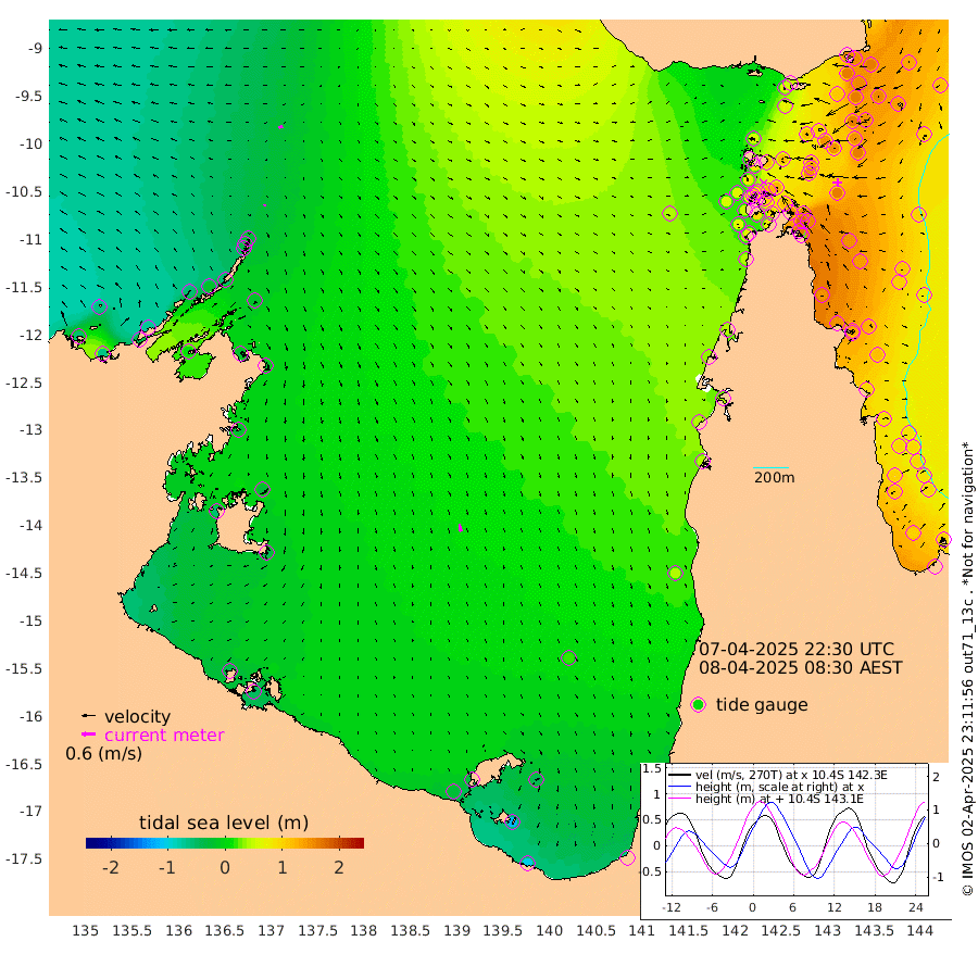 9cm/s -126T +3cm/s rms + 7cm/s -42T. ARA-GOC87 57m 35cm/s 168T +3cm/s rms + 2cm/s -2T. ARA-GOC87 60m 18cm/s -108T +2cm/s rms + 3cm/s 61T. ARA-GOC87 47m 156cm Daru 154cm Bobo Island 104cm Meer Island Barge 134cm Bramble Cay 155cm Unnamed Cay 162cm Pearce Cay 154cm Stephens Island 160cm Merrie England Shoals 163cm Mutacomal Reef 139cm Darnley Island Barge 120cm East Cay 144cm Yorke Island Barge 158cm Rennel Island 149cm Aureed Island 147cm Dungeness Reef 100cm Zagai Island 115cm Yam Island 56cm Dauan Island 49cm Saibai Island 69cm Phipi Reef 110cm Warrior Reef - West 58cm Mabuiag Island Barge 159cm Half Way Island 147cm Coconut Island 164cm Dugong Islet 136cm Poll Island 147cm Kirkcaldie Reef 116cm Suarji Island 125cm Sue Islet 82cm Hawkesbury Island 121cm Alert Patches 125cm Twin Island 59cm Badu Island 115cm St Pauls (Moa Island) 86cm Kubin (Moa Island) 102cm Ince Point 94cm Thursday Island 93cm Nardana Patches 86cm Turtle Head 67cm Round Island 70cm Goods Island 55cm Booby Island 64cm White Rocks Area 40cm Carpentaria 101cm Papou Point 52cm Bampfield Head 40cm Crab Island 65cm Red Wallis Island 91cm Packe Island 176cm Harrington Reef 71cm Herald Camp 27cm Sharp Point 81cm Red Island Point 93cm Possession Island 117cm Alpha Rock 145cm Frederick Point 157cm Wyborn Reef Light 153cm Tetley Island 100cm Triangle Reef 171cm Turtle Head Island 110cm Maclennan Cay 80cm Raine Island 149cm Mcsweeny Reef 135cm Collette Reef 100cm Shadwell Reef 147cm Hannibal Island 143cm Round Point 41cm Vrilya Point 130cm Cape Grenville 120cm Hicks Island 121cm Sir Charles Hardy Island 41cm Harvey Island 117cm Kay Reef 96cm Rocky Island 88cm Chapman Island 86cm Ham Reef 92cm Jubilee Reef 92cm Night Island 92cm Unnamed Reef No. 3 101cm Morris Island 86cm 1st 3 Mile Opening 97cm Creech Reef 107cm Fife Island 104cm Eden Reef 104cm Stanley Island 119cm Normanby River -59cm Yabooma Island -64cm Hutchison River -72cm Elcho Island -66cm North West Crocodile Island -29cm Cape Wessel -55cm Stevens Island -17cm Guluwuru Island -55cm Hopeful Bay -40cm Auster Point -35cm Two Island Bay -36cm Cadell Strait 14cm Mallison Island -21cm Melville Bay (Gove Harbour) -20cm Truant Island -17cm Cape Arnhem -25cm Cape Grey -28cm Hawk Island -54cm Milner Bay (Groote Eylandt) -40cm Cape Beatrice -39cm West Island -48cm Centre Island -30cm Mornington Island -27cm West Wellesley Islands -44cm Bountiful Island -104cm Albert River Mouth -114cm Sweers Island -81cm Karumba 16cm Nassau River Offshore 42cm Christmas Creek 40cm Archer River 44cm Boyd Point 39cm Weipa (Humbug Point) 35cm Pennefather River 38cm Cullen Point