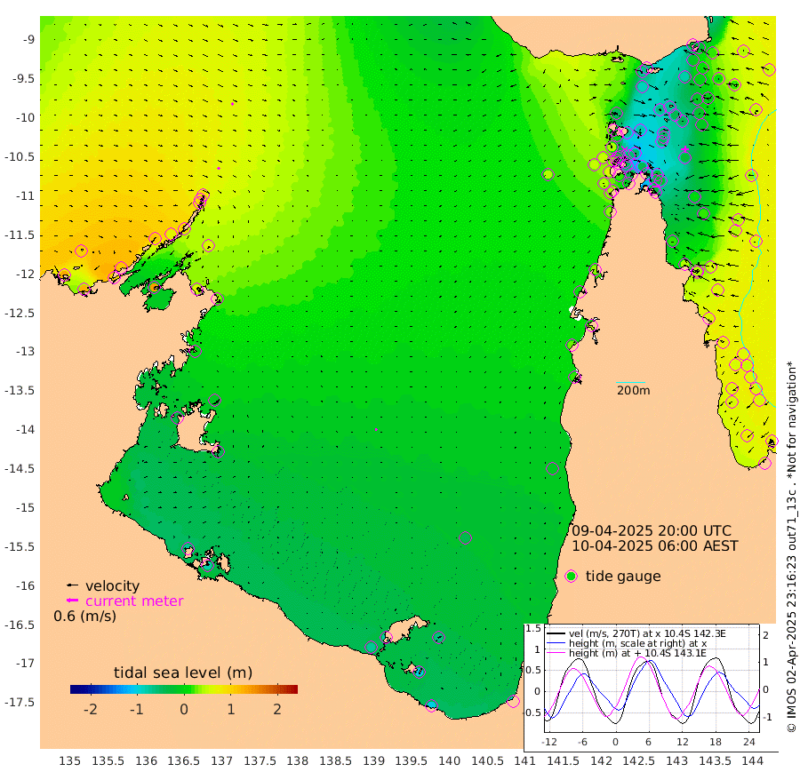 14cm/s 131T +3cm/s rms + 7cm/s -42T. ARA-GOC87 57m 11cm/s 165T +3cm/s rms + 2cm/s -2T. ARA-GOC87 60m 13cm/s 132T +2cm/s rms + 3cm/s 61T. ARA-GOC87 47m -29cm Daru -24cm Bobo Island 45cm Meer Island Barge 38cm Bramble Cay 10cm Unnamed Cay -6cm Pearce Cay 12cm Stephens Island 18cm Merrie England Shoals -14cm Mutacomal Reef 17cm Darnley Island Barge 49cm East Cay -7cm Yorke Island Barge -11cm Rennel Island -22cm Aureed Island -39cm Dungeness Reef -74cm Zagai Island -65cm Yam Island -71cm Dauan Island -65cm Saibai Island -86cm Phipi Reef -76cm Warrior Reef - West -47cm Mabuiag Island Barge -14cm Half Way Island -41cm Coconut Island -25cm Dugong Islet -54cm Poll Island -52cm Kirkcaldie Reef -79cm Suarji Island -51cm Sue Islet 39cm Hawkesbury Island -58cm Alert Patches -59cm Twin Island 6cm Badu Island -74cm St Pauls (Moa Island) 2cm Kubin (Moa Island) -44cm Ince Point -30cm Thursday Island -35cm Nardana Patches -7cm Turtle Head 14cm Round Island 35cm Goods Island 50cm Booby Island 46cm White Rocks Area 42cm Carpentaria -60cm Papou Point 60cm Bampfield Head 31cm Crab Island 44cm Red Wallis Island 20cm Packe Island -41cm Harrington Reef 44cm Herald Camp -35cm Sharp Point -12cm Red Island Point -37cm Possession Island -44cm Alpha Rock -50cm Frederick Point -21cm Wyborn Reef Light -29cm Tetley Island 31cm Triangle Reef -22cm Turtle Head Island 40cm Maclennan Cay 58cm Raine Island 5cm Mcsweeny Reef 17cm Collette Reef 42cm Shadwell Reef 22cm Hannibal Island 42cm Round Point 31cm Vrilya Point 43cm Cape Grenville 42cm Hicks Island 57cm Sir Charles Hardy Island 10cm Harvey Island 63cm Kay Reef 60cm Rocky Island 71cm Chapman Island 66cm Ham Reef 59cm Jubilee Reef 47cm Night Island 65cm Unnamed Reef No. 3 62cm Morris Island 58cm 1st 3 Mile Opening 58cm Creech Reef 57cm Fife Island 80cm Eden Reef 68cm Stanley Island 72cm Normanby River 129cm Yabooma Island 125cm Hutchison River 112cm Elcho Island 103cm North West Crocodile Island 85cm Cape Wessel 109cm Stevens Island 65cm Guluwuru Island 111cm Hopeful Bay 89cm Auster Point 92cm Two Island Bay 103cm Cadell Strait 137cm Mallison Island 60cm Melville Bay (Gove Harbour) 66cm Truant Island 32cm Cape Arnhem 3cm Cape Grey -9cm Hawk Island -35cm Milner Bay (Groote Eylandt) -42cm Cape Beatrice -73cm West Island -79cm Centre Island -82cm Mornington Island -74cm West Wellesley Islands -67cm Bountiful Island -98cm Albert River Mouth -103cm Sweers Island -101cm Karumba -42cm Nassau River Offshore -12cm Christmas Creek 21cm Archer River 27cm Boyd Point 39cm Weipa (Humbug Point) 15cm Pennefather River 37cm Cullen Point
