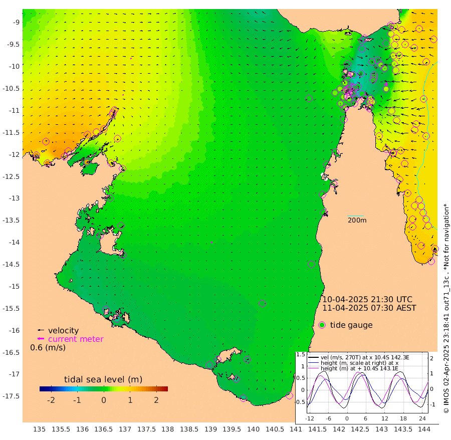 9cm/s 132T +3cm/s rms + 7cm/s -42T. ARA-GOC87 57m 14cm/s -180T +3cm/s rms + 2cm/s -2T. ARA-GOC87 60m 8cm/s 132T +2cm/s rms + 3cm/s 61T. ARA-GOC87 47m 40cm Daru 44cm Bobo Island 75cm Meer Island Barge 87cm Bramble Cay 73cm Unnamed Cay 60cm Pearce Cay 71cm Stephens Island 83cm Merrie England Shoals 59cm Mutacomal Reef 66cm Darnley Island Barge 87cm East Cay 48cm Yorke Island Barge 55cm Rennel Island 40cm Aureed Island 23cm Dungeness Reef -25cm Zagai Island -14cm Yam Island -48cm Dauan Island -47cm Saibai Island -50cm Phipi Reef -23cm Warrior Reef - West -31cm Mabuiag Island Barge 49cm Half Way Island 25cm Coconut Island 40cm Dugong Islet 6cm Poll Island 8cm Kirkcaldie Reef -25cm Suarji Island -1cm Sue Islet 33cm Hawkesbury Island -12cm Alert Patches -10cm Twin Island 5cm Badu Island -28cm St Pauls (Moa Island) 14cm Kubin (Moa Island) -12cm Ince Point -9cm Thursday Island -11cm Nardana Patches 6cm Turtle Head 16cm Round Island 28cm Goods Island 25cm Booby Island 34cm White Rocks Area 4cm Carpentaria -20cm Papou Point 35cm Bampfield Head 8cm Crab Island 27cm Red Wallis Island 28cm Packe Island 34cm Harrington Reef 30cm Herald Camp -22cm Sharp Point -1cm Red Island Point -10cm Possession Island 4cm Alpha Rock 10cm Frederick Point 49cm Wyborn Reef Light 39cm Tetley Island 62cm Triangle Reef 45cm Turtle Head Island 72cm Maclennan Cay 76cm Raine Island 64cm Mcsweeny Reef 68cm Collette Reef 72cm Shadwell Reef 79cm Hannibal Island 95cm Round Point 1cm Vrilya Point 87cm Cape Grenville 81cm Hicks Island 91cm Sir Charles Hardy Island 24cm Harvey Island 97cm Kay Reef 85cm Rocky Island 91cm Chapman Island 84cm Ham Reef 81cm Jubilee Reef 72cm Night Island 86cm Unnamed Reef No. 3 89cm Morris Island 76cm 1st 3 Mile Opening 81cm Creech Reef 89cm Fife Island 105cm Eden Reef 94cm Stanley Island 106cm Normanby River 145cm Yabooma Island 153cm Hutchison River 130cm Elcho Island 123cm North West Crocodile Island 96cm Cape Wessel 129cm Stevens Island 78cm Guluwuru Island 124cm Hopeful Bay 99cm Auster Point 102cm Two Island Bay 124cm Cadell Strait 138cm Mallison Island 75cm Melville Bay (Gove Harbour) 79cm Truant Island 41cm Cape Arnhem 13cm Cape Grey 4cm Hawk Island -29cm Milner Bay (Groote Eylandt) -30cm Cape Beatrice -64cm West Island -74cm Centre Island -57cm Mornington Island -50cm West Wellesley Islands -38cm Bountiful Island -63cm Albert River Mouth -71cm Sweers Island -65cm Karumba -20cm Nassau River Offshore 0cm Christmas Creek 14cm Archer River 13cm Boyd Point 25cm Weipa (Humbug Point) -4cm Pennefather River 10cm Cullen Point