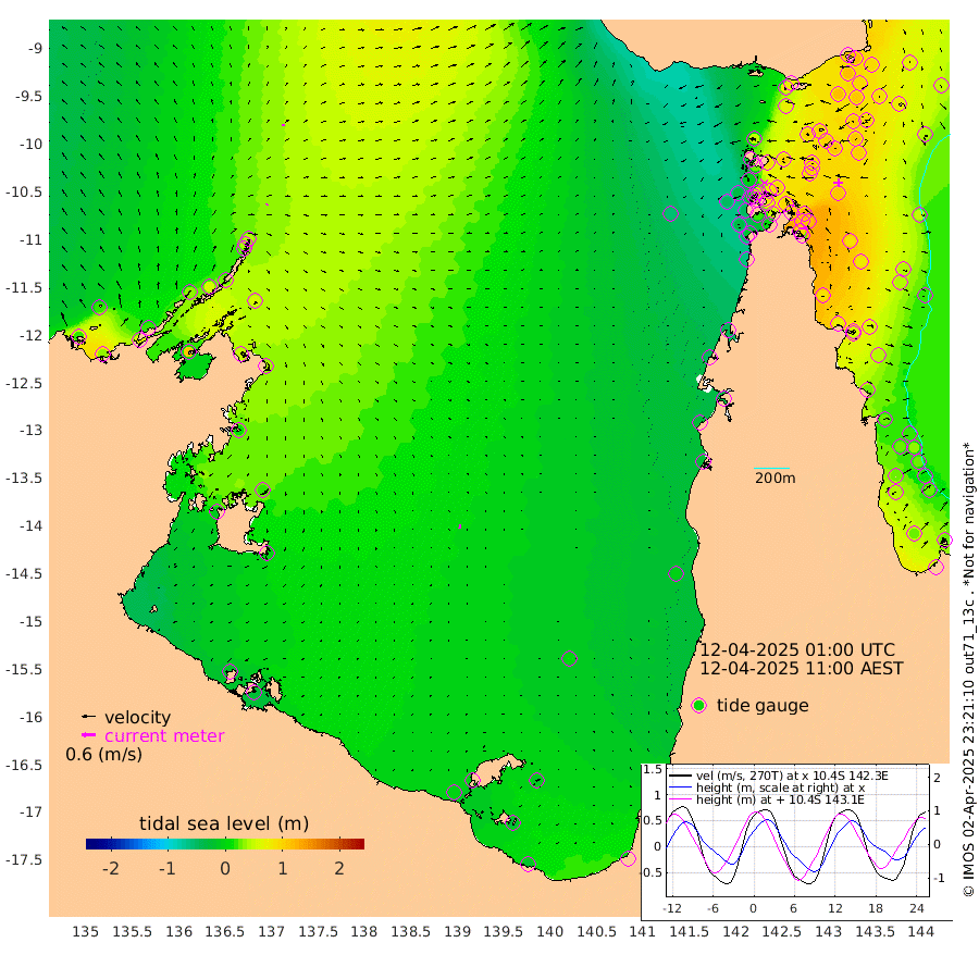 5cm/s 54T +3cm/s rms + 7cm/s -42T. ARA-GOC87 57m 16cm/s 180T +3cm/s rms + 2cm/s -2T. ARA-GOC87 60m 7cm/s -1T +2cm/s rms + 3cm/s 61T. ARA-GOC87 47m 113cm Daru 115cm Bobo Island 41cm Meer Island Barge 71cm Bramble Cay 95cm Unnamed Cay 106cm Pearce Cay 89cm Stephens Island 93cm Merrie England Shoals 116cm Mutacomal Reef 76cm Darnley Island Barge 50cm East Cay 93cm Yorke Island Barge 102cm Rennel Island 105cm Aureed Island 103cm Dungeness Reef 104cm Zagai Island 104cm Yam Island 76cm Dauan Island 73cm Saibai Island 74cm Phipi Reef 114cm Warrior Reef - West 47cm Mabuiag Island Barge 98cm Half Way Island 110cm Coconut Island 107cm Dugong Islet 108cm Poll Island 99cm Kirkcaldie Reef 99cm Suarji Island 96cm Sue Islet -7cm Hawkesbury Island 78cm Alert Patches 91cm Twin Island -2cm Badu Island 92cm St Pauls (Moa Island) 27cm Kubin (Moa Island) 61cm Ince Point 41cm Thursday Island 47cm Nardana Patches 20cm Turtle Head 5cm Round Island -19cm Goods Island -51cm Booby Island -34cm White Rocks Area -57cm Carpentaria 76cm Papou Point -47cm Bampfield Head -52cm Crab Island -30cm Red Wallis Island 17cm Packe Island 118cm Harrington Reef -18cm Herald Camp 28cm Sharp Point 12cm Red Island Point 46cm Possession Island 94cm Alpha Rock 105cm Frederick Point 119cm Wyborn Reef Light 120cm Tetley Island 52cm Triangle Reef 104cm Turtle Head Island 44cm Maclennan Cay 15cm Raine Island 90cm Mcsweeny Reef 76cm Collette Reef 40cm Shadwell Reef 83cm Hannibal Island 75cm Round Point -62cm Vrilya Point 59cm Cape Grenville 51cm Hicks Island 53cm Sir Charles Hardy Island 18cm Harvey Island 42cm Kay Reef 30cm Rocky Island 24cm Chapman Island 21cm Ham Reef 25cm Jubilee Reef 31cm Night Island 24cm Unnamed Reef No. 3 30cm Morris Island 12cm 1st 3 Mile Opening 24cm Creech Reef 40cm Fife Island 26cm Eden Reef 25cm Stanley Island 38cm Normanby River 16cm Yabooma Island 37cm Hutchison River 21cm Elcho Island 22cm North West Crocodile Island 45cm Cape Wessel 37cm Stevens Island 58cm Guluwuru Island 25cm Hopeful Bay 29cm Auster Point 38cm Two Island Bay 55cm Cadell Strait 108cm Mallison Island 50cm Melville Bay (Gove Harbour) 54cm Truant Island 38cm Cape Arnhem 14cm Cape Grey 20cm Hawk Island -10cm Milner Bay (Groote Eylandt) -4cm Cape Beatrice -19cm West Island -28cm Centre Island -3cm Mornington Island -7cm West Wellesley Islands -10cm Bountiful Island -16cm Albert River Mouth -24cm Sweers Island -14cm Karumba 3cm Nassau River Offshore -3cm Christmas Creek -28cm Archer River -26cm Boyd Point -35cm Weipa (Humbug Point) -46cm Pennefather River -44cm Cullen Point