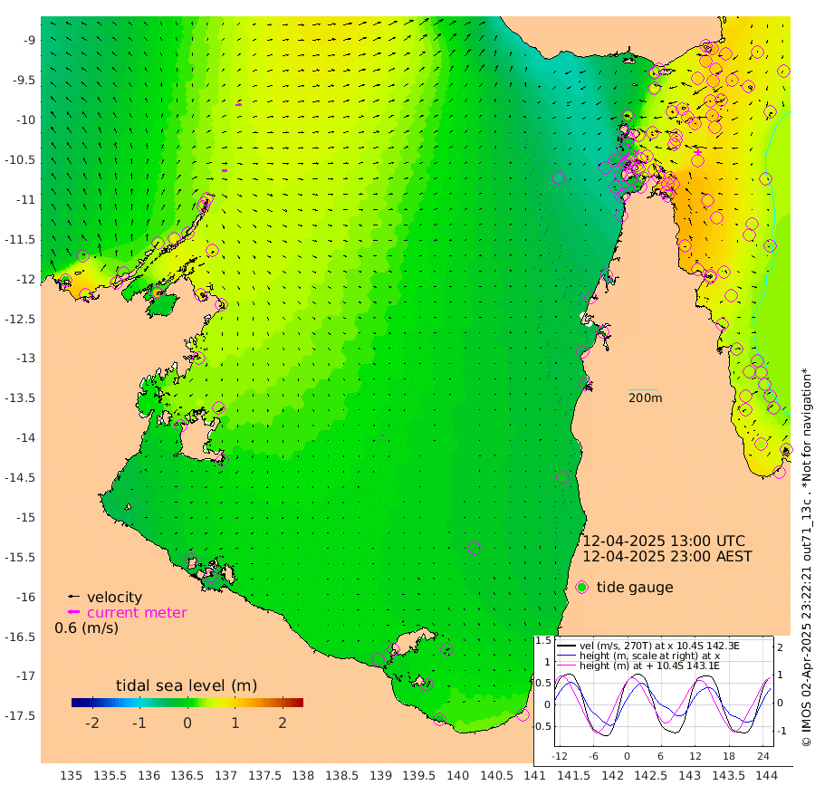 28cm/s 93T +3cm/s rms + 7cm/s -42T. ARA-GOC87 57m 6cm/s 23T +3cm/s rms + 2cm/s -2T. ARA-GOC87 60m 28cm/s 83T +2cm/s rms + 3cm/s 61T. ARA-GOC87 47m 112cm Daru 123cm Bobo Island 54cm Meer Island Barge 80cm Bramble Cay 97cm Unnamed Cay 112cm Pearce Cay 95cm Stephens Island 98cm Merrie England Shoals 108cm Mutacomal Reef 86cm Darnley Island Barge 65cm East Cay 97cm Yorke Island Barge 101cm Rennel Island 111cm Aureed Island 100cm Dungeness Reef 99cm Zagai Island 83cm Yam Island 46cm Dauan Island 52cm Saibai Island 71cm Phipi Reef 95cm Warrior Reef - West 32cm Mabuiag Island Barge 94cm Half Way Island 118cm Coconut Island 94cm Dugong Islet 97cm Poll Island 93cm Kirkcaldie Reef 96cm Suarji Island 90cm Sue Islet -36cm Hawkesbury Island 73cm Alert Patches 80cm Twin Island -5cm Badu Island 75cm St Pauls (Moa Island) -3cm Kubin (Moa Island) 44cm Ince Point 26cm Thursday Island 31cm Nardana Patches 6cm Turtle Head -9cm Round Island -32cm Goods Island -60cm Booby Island -44cm White Rocks Area -60cm Carpentaria 69cm Papou Point -38cm Bampfield Head -48cm Crab Island -52cm Red Wallis Island -15cm Packe Island 118cm Harrington Reef -51cm Herald Camp 22cm Sharp Point 14cm Red Island Point 47cm Possession Island 73cm Alpha Rock 97cm Frederick Point 115cm Wyborn Reef Light 112cm Tetley Island 57cm Triangle Reef 111cm Turtle Head Island 51cm Maclennan Cay 36cm Raine Island 94cm Mcsweeny Reef 86cm Collette Reef 53cm Shadwell Reef 94cm Hannibal Island 84cm Round Point -58cm Vrilya Point 66cm Cape Grenville 64cm Hicks Island 55cm Sir Charles Hardy Island 20cm Harvey Island 55cm Kay Reef 44cm Rocky Island 42cm Chapman Island 35cm Ham Reef 40cm Jubilee Reef 41cm Night Island 39cm Unnamed Reef No. 3 46cm Morris Island 34cm 1st 3 Mile Opening 40cm Creech Reef 50cm Fife Island 44cm Eden Reef 39cm Stanley Island 49cm Normanby River 13cm Yabooma Island 47cm Hutchison River 26cm Elcho Island 19cm North West Crocodile Island 53cm Cape Wessel 46cm Stevens Island 81cm Guluwuru Island 32cm Hopeful Bay 45cm Auster Point 30cm Two Island Bay 65cm Cadell Strait 127cm Mallison Island 69cm Melville Bay (Gove Harbour) 75cm Truant Island 56cm Cape Arnhem 43cm Cape Grey 33cm Hawk Island 12cm Milner Bay (Groote Eylandt) 4cm Cape Beatrice -17cm West Island -13cm Centre Island 5cm Mornington Island -3cm West Wellesley Islands -3cm Bountiful Island -8cm Albert River Mouth 4cm Sweers Island -6cm Karumba -9cm Nassau River Offshore -13cm Christmas Creek -24cm Archer River -32cm Boyd Point -41cm Weipa (Humbug Point) -33cm Pennefather River -57cm Cullen Point