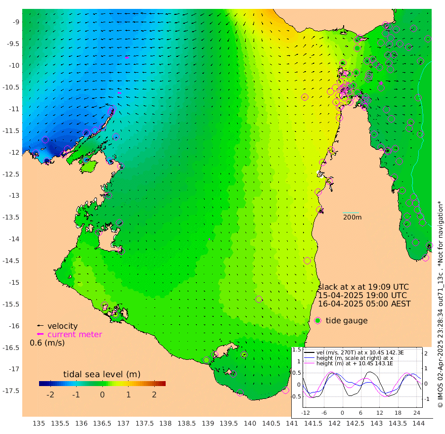 29cm/s -86T +3cm/s rms + 7cm/s -42T. ARA-GOC87 57m 15cm/s 157T +3cm/s rms + 2cm/s -2T. ARA-GOC87 60m 33cm/s -98T +2cm/s rms + 3cm/s 61T. ARA-GOC87 47m -36cm Daru -37cm Bobo Island -9cm Meer Island Barge -28cm Bramble Cay -33cm Unnamed Cay -31cm Pearce Cay -27cm Stephens Island -36cm Merrie England Shoals -38cm Mutacomal Reef -18cm Darnley Island Barge -10cm East Cay -22cm Yorke Island Barge -29cm Rennel Island -20cm Aureed Island -20cm Dungeness Reef -18cm Zagai Island -14cm Yam Island 7cm Dauan Island 14cm Saibai Island 2cm Phipi Reef -14cm Warrior Reef - West 19cm Mabuiag Island Barge -26cm Half Way Island -28cm Coconut Island -20cm Dugong Islet -19cm Poll Island -15cm Kirkcaldie Reef 3cm Suarji Island -9cm Sue Islet 47cm Hawkesbury Island 8cm Alert Patches 1cm Twin Island 35cm Badu Island 2cm St Pauls (Moa Island) 27cm Kubin (Moa Island) 16cm Ince Point 28cm Thursday Island 23cm Nardana Patches 36cm Turtle Head 34cm Round Island 52cm Goods Island 74cm Booby Island 62cm White Rocks Area 91cm Carpentaria -2cm Papou Point 69cm Bampfield Head 58cm Crab Island 67cm Red Wallis Island 41cm Packe Island -25cm Harrington Reef 67cm Herald Camp 2cm Sharp Point 36cm Red Island Point 17cm Possession Island -8cm Alpha Rock -13cm Frederick Point -41cm Wyborn Reef Light -38cm Tetley Island -7cm Triangle Reef -37cm Turtle Head Island -1cm Maclennan Cay -1cm Raine Island -25cm Mcsweeny Reef -22cm Collette Reef -8cm Shadwell Reef -28cm Hannibal Island -28cm Round Point 68cm Vrilya Point -13cm Cape Grenville -13cm Hicks Island 0cm Sir Charles Hardy Island -3cm Harvey Island -8cm Kay Reef -1cm Rocky Island 5cm Chapman Island 6cm Ham Reef 0cm Jubilee Reef -2cm Night Island 6cm Unnamed Reef No. 3 -4cm Morris Island 4cm 1st 3 Mile Opening 4cm Creech Reef -6cm Fife Island -4cm Eden Reef 0cm Stanley Island -8cm Normanby River -167cm Yabooma Island -208cm Hutchison River -179cm Elcho Island -171cm North West Crocodile Island -120cm Cape Wessel -177cm Stevens Island -127cm Guluwuru Island -149cm Hopeful Bay -132cm Auster Point -139cm Two Island Bay -189cm Cadell Strait -139cm Mallison Island -116cm Melville Bay (Gove Harbour) -121cm Truant Island -77cm Cape Arnhem -50cm Cape Grey -45cm Hawk Island -20cm Milner Bay (Groote Eylandt) -12cm Cape Beatrice 31cm West Island 33cm Centre Island 17cm Mornington Island 26cm West Wellesley Islands 25cm Bountiful Island -28cm Albert River Mouth -21cm Sweers Island -13cm Karumba 37cm Nassau River Offshore 51cm Christmas Creek 55cm Archer River 59cm Boyd Point 61cm Weipa (Humbug Point) 48cm Pennefather River 70cm Cullen Point