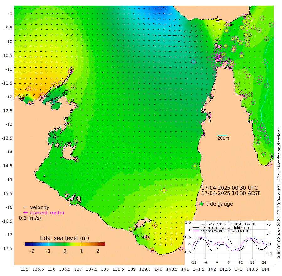 9cm/s -81T +3cm/s rms + 7cm/s -42T. ARA-GOC87 57m 14cm/s -110T +3cm/s rms + 2cm/s -2T. ARA-GOC87 60m 6cm/s -60T +2cm/s rms + 3cm/s 61T. ARA-GOC87 47m 43cm Daru 37cm Bobo Island 17cm Meer Island Barge 30cm Bramble Cay 37cm Unnamed Cay 40cm Pearce Cay 33cm Stephens Island 33cm Merrie England Shoals 39cm Mutacomal Reef 25cm Darnley Island Barge 21cm East Cay 30cm Yorke Island Barge 38cm Rennel Island 31cm Aureed Island 44cm Dungeness Reef 33cm Zagai Island 39cm Yam Island 42cm Dauan Island 25cm Saibai Island 61cm Phipi Reef 45cm Warrior Reef - West 19cm Mabuiag Island Barge 35cm Half Way Island 32cm Coconut Island 38cm Dugong Islet 35cm Poll Island 38cm Kirkcaldie Reef 35cm Suarji Island 27cm Sue Islet 7cm Hawkesbury Island 25cm Alert Patches 24cm Twin Island 18cm Badu Island 28cm St Pauls (Moa Island) 15cm Kubin (Moa Island) 19cm Ince Point 12cm Thursday Island 15cm Nardana Patches 15cm Turtle Head 3cm Round Island 4cm Goods Island -19cm Booby Island -9cm White Rocks Area -71cm Carpentaria 24cm Papou Point -38cm Bampfield Head -24cm Crab Island -22cm Red Wallis Island 1cm Packe Island 36cm Harrington Reef -12cm Herald Camp 6cm Sharp Point 15cm Red Island Point 13cm Possession Island 16cm Alpha Rock 29cm Frederick Point 33cm Wyborn Reef Light 31cm Tetley Island 14cm Triangle Reef 37cm Turtle Head Island 17cm Maclennan Cay 11cm Raine Island 30cm Mcsweeny Reef 25cm Collette Reef 15cm Shadwell Reef 29cm Hannibal Island 28cm Round Point -44cm Vrilya Point 19cm Cape Grenville 24cm Hicks Island 20cm Sir Charles Hardy Island 7cm Harvey Island 14cm Kay Reef 16cm Rocky Island 7cm Chapman Island 5cm Ham Reef 12cm Jubilee Reef 10cm Night Island 4cm Unnamed Reef No. 3 16cm Morris Island 13cm 1st 3 Mile Opening 10cm Creech Reef 11cm Fife Island 16cm Eden Reef 11cm Stanley Island 19cm Normanby River 113cm Yabooma Island 141cm Hutchison River 115cm Elcho Island 119cm North West Crocodile Island 35cm Cape Wessel 85cm Stevens Island 41cm Guluwuru Island 74cm Hopeful Bay 55cm Auster Point 58cm Two Island Bay 102cm Cadell Strait -73cm Mallison Island 45cm Melville Bay (Gove Harbour) 35cm Truant Island 21cm Cape Arnhem 32cm Cape Grey 28cm Hawk Island 19cm Milner Bay (Groote Eylandt) 28cm Cape Beatrice 16cm West Island 6cm Centre Island 60cm Mornington Island 55cm West Wellesley Islands 111cm Bountiful Island 133cm Albert River Mouth 126cm Sweers Island 130cm Karumba 59cm Nassau River Offshore 33cm Christmas Creek 3cm Archer River -14cm Boyd Point 0cm Weipa (Humbug Point) -30cm Pennefather River -37cm Cullen Point