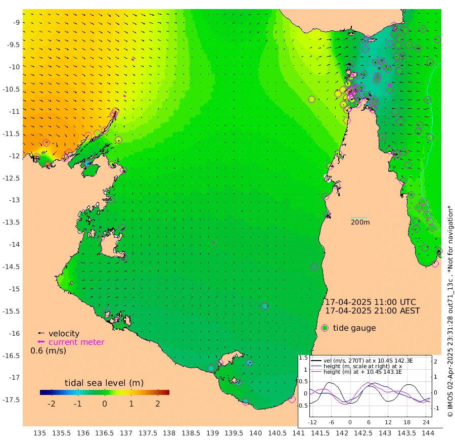 19cm/s 130T +3cm/s rms + 7cm/s -42T. ARA-GOC87 57m 20cm/s 2T +3cm/s rms + 2cm/s -2T. ARA-GOC87 60m 24cm/s 124T +2cm/s rms + 3cm/s 61T. ARA-GOC87 47m -21cm Daru -15cm Bobo Island 6cm Meer Island Barge 2cm Bramble Cay -10cm Unnamed Cay -4cm Pearce Cay 1cm Stephens Island -5cm Merrie England Shoals -21cm Mutacomal Reef -10cm Darnley Island Barge 9cm East Cay -19cm Yorke Island Barge -5cm Rennel Island -18cm Aureed Island -18cm Dungeness Reef -45cm Zagai Island -35cm Yam Island -64cm Dauan Island -78cm Saibai Island -59cm Phipi Reef -57cm Warrior Reef - West -30cm Mabuiag Island Barge -2cm Half Way Island -15cm Coconut Island -12cm Dugong Islet -22cm Poll Island -16cm Kirkcaldie Reef -30cm Suarji Island -39cm Sue Islet 45cm Hawkesbury Island -17cm Alert Patches -16cm Twin Island 27cm Badu Island -24cm St Pauls (Moa Island) 31cm Kubin (Moa Island) -5cm Ince Point 7cm Thursday Island 2cm Nardana Patches 21cm Turtle Head 41cm Round Island 51cm Goods Island 66cm Booby Island 68cm White Rocks Area 52cm Carpentaria -8cm Papou Point 78cm Bampfield Head 63cm Crab Island 60cm Red Wallis Island 39cm Packe Island -6cm Harrington Reef 50cm Herald Camp -20cm Sharp Point 20cm Red Island Point 11cm Possession Island -25cm Alpha Rock -15cm Frederick Point -15cm Wyborn Reef Light -18cm Tetley Island -4cm Triangle Reef 11cm Turtle Head Island 7cm Maclennan Cay 16cm Raine Island -8cm Mcsweeny Reef -10cm Collette Reef -2cm Shadwell Reef -8cm Hannibal Island 7cm Round Point 58cm Vrilya Point 3cm Cape Grenville 10cm Hicks Island -4cm Sir Charles Hardy Island 2cm Harvey Island 5cm Kay Reef 7cm Rocky Island 4cm Chapman Island 5cm Ham Reef 8cm Jubilee Reef 10cm Night Island 7cm Unnamed Reef No. 3 13cm Morris Island 17cm 1st 3 Mile Opening 11cm Creech Reef 12cm Fife Island 15cm Eden Reef 12cm Stanley Island 17cm Normanby River 149cm Yabooma Island 161cm Hutchison River 144cm Elcho Island 138cm North West Crocodile Island 74cm Cape Wessel 118cm Stevens Island 33cm Guluwuru Island 103cm Hopeful Bay 96cm Auster Point 101cm Two Island Bay 109cm Cadell Strait -106cm Mallison Island 39cm Melville Bay (Gove Harbour) 46cm Truant Island 18cm Cape Arnhem 2cm Cape Grey -8cm Hawk Island -12cm Milner Bay (Groote Eylandt) -21cm Cape Beatrice -46cm West Island -42cm Centre Island -74cm Mornington Island -78cm West Wellesley Islands -96cm Bountiful Island -77cm Albert River Mouth -84cm Sweers Island -77cm Karumba -68cm Nassau River Offshore -50cm Christmas Creek -10cm Archer River 3cm Boyd Point 9cm Weipa (Humbug Point) 30cm Pennefather River 37cm Cullen Point