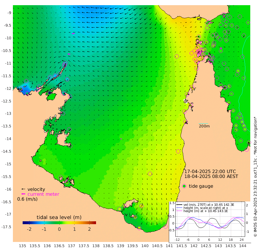 42cm/s -90T +3cm/s rms + 7cm/s -42T. ARA-GOC87 57m 16cm/s -161T +3cm/s rms + 2cm/s -2T. ARA-GOC87 60m 43cm/s -99T +2cm/s rms + 3cm/s 61T. ARA-GOC87 47m 7cm Daru 4cm Bobo Island 14cm Meer Island Barge 12cm Bramble Cay 10cm Unnamed Cay 17cm Pearce Cay 16cm Stephens Island 10cm Merrie England Shoals 8cm Mutacomal Reef 8cm Darnley Island Barge 22cm East Cay 6cm Yorke Island Barge 18cm Rennel Island 13cm Aureed Island 22cm Dungeness Reef -2cm Zagai Island 14cm Yam Island 17cm Dauan Island 4cm Saibai Island 34cm Phipi Reef 11cm Warrior Reef - West 29cm Mabuiag Island Barge 16cm Half Way Island 10cm Coconut Island 21cm Dugong Islet 16cm Poll Island 24cm Kirkcaldie Reef 35cm Suarji Island 8cm Sue Islet 87cm Hawkesbury Island 39cm Alert Patches 31cm Twin Island 67cm Badu Island 29cm St Pauls (Moa Island) 65cm Kubin (Moa Island) 44cm Ince Point 54cm Thursday Island 50cm Nardana Patches 70cm Turtle Head 71cm Round Island 88cm Goods Island 95cm Booby Island 95cm White Rocks Area 61cm Carpentaria 24cm Papou Point 87cm Bampfield Head 73cm Crab Island 90cm Red Wallis Island 81cm Packe Island 22cm Harrington Reef 98cm Herald Camp 3cm Sharp Point 68cm Red Island Point 49cm Possession Island 14cm Alpha Rock 24cm Frederick Point 2cm Wyborn Reef Light 3cm Tetley Island 15cm Triangle Reef 13cm Turtle Head Island 24cm Maclennan Cay 20cm Raine Island 13cm Mcsweeny Reef 11cm Collette Reef 13cm Shadwell Reef 9cm Hannibal Island 18cm Round Point 65cm Vrilya Point 21cm Cape Grenville 21cm Hicks Island 23cm Sir Charles Hardy Island 7cm Harvey Island 21cm Kay Reef 24cm Rocky Island 23cm Chapman Island 21cm Ham Reef 18cm Jubilee Reef 20cm Night Island 23cm Unnamed Reef No. 3 24cm Morris Island 23cm 1st 3 Mile Opening 24cm Creech Reef 23cm Fife Island 22cm Eden Reef 23cm Stanley Island 26cm Normanby River -45cm Yabooma Island -66cm Hutchison River -58cm Elcho Island -47cm North West Crocodile Island -85cm Cape Wessel -85cm Stevens Island -116cm Guluwuru Island -65cm Hopeful Bay -73cm Auster Point -78cm Two Island Bay -101cm Cadell Strait -253cm Mallison Island -89cm Melville Bay (Gove Harbour) -100cm Truant Island -71cm Cape Arnhem -42cm Cape Grey -30cm Hawk Island -18cm Milner Bay (Groote Eylandt) 0cm Cape Beatrice 28cm West Island 25cm Centre Island 48cm Mornington Island 48cm West Wellesley Islands 80cm Bountiful Island 47cm Albert River Mouth 50cm Sweers Island 70cm Karumba 75cm Nassau River Offshore 76cm Christmas Creek 68cm Archer River 60cm Boyd Point 76cm Weipa (Humbug Point) 47cm Pennefather River 68cm Cullen Point