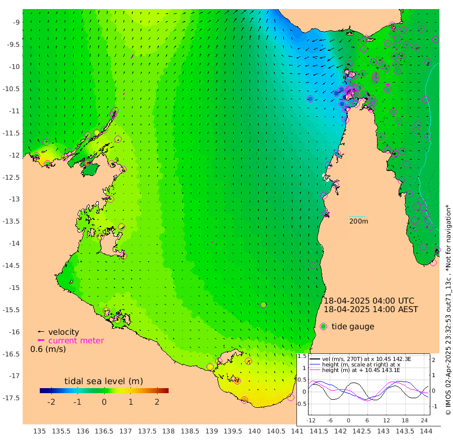 18cm/s 36T +3cm/s rms + 7cm/s -42T. ARA-GOC87 57m 11cm/s -43T +3cm/s rms + 2cm/s -2T. ARA-GOC87 60m 24cm/s 33T +2cm/s rms + 3cm/s 61T. ARA-GOC87 47m -16cm Daru -17cm Bobo Island -31cm Meer Island Barge -28cm Bramble Cay -25cm Unnamed Cay -30cm Pearce Cay -32cm Stephens Island -28cm Merrie England Shoals -20cm Mutacomal Reef -23cm Darnley Island Barge -39cm East Cay -18cm Yorke Island Barge -32cm Rennel Island -23cm Aureed Island -27cm Dungeness Reef -1cm Zagai Island -16cm Yam Island -1cm Dauan Island 11cm Saibai Island -6cm Phipi Reef 0cm Warrior Reef - West -35cm Mabuiag Island Barge -32cm Half Way Island -28cm Coconut Island -31cm Dugong Islet -26cm Poll Island -33cm Kirkcaldie Reef -36cm Suarji Island -13cm Sue Islet -134cm Hawkesbury Island -53cm Alert Patches -49cm Twin Island -105cm Badu Island -41cm St Pauls (Moa Island) -106cm Kubin (Moa Island) -65cm Ince Point -83cm Thursday Island -76cm Nardana Patches -102cm Turtle Head -121cm Round Island -137cm Goods Island -160cm Booby Island -155cm White Rocks Area -144cm Carpentaria -42cm Papou Point -181cm Bampfield Head -135cm Crab Island -153cm Red Wallis Island -130cm Packe Island -39cm Harrington Reef -155cm Herald Camp 1cm Sharp Point -91cm Red Island Point -79cm Possession Island -31cm Alpha Rock -41cm Frederick Point -24cm Wyborn Reef Light -24cm Tetley Island -31cm Triangle Reef -44cm Turtle Head Island -40cm Maclennan Cay -41cm Raine Island -28cm Mcsweeny Reef -25cm Collette Reef -29cm Shadwell Reef -26cm Hannibal Island -38cm Round Point -131cm Vrilya Point -39cm Cape Grenville -39cm Hicks Island -39cm Sir Charles Hardy Island -12cm Harvey Island -39cm Kay Reef -38cm Rocky Island -41cm Chapman Island -39cm Ham Reef -36cm Jubilee Reef -38cm Night Island -42cm Unnamed Reef No. 3 -41cm Morris Island -45cm 1st 3 Mile Opening -43cm Creech Reef -41cm Fife Island -42cm Eden Reef -43cm Stanley Island -43cm Normanby River -2cm Yabooma Island 16cm Hutchison River 15cm Elcho Island 16cm North West Crocodile Island 24cm Cape Wessel 28cm Stevens Island 63cm Guluwuru Island 19cm Hopeful Bay 16cm Auster Point 19cm Two Island Bay 48cm Cadell Strait 153cm Mallison Island 48cm Melville Bay (Gove Harbour) 44cm Truant Island 40cm Cape Arnhem 47cm Cape Grey 47cm Hawk Island 53cm Milner Bay (Groote Eylandt) 53cm Cape Beatrice 53cm West Island 48cm Centre Island 73cm Mornington Island 74cm West Wellesley Islands 93cm Bountiful Island 138cm Albert River Mouth 144cm Sweers Island 116cm Karumba 29cm Nassau River Offshore -16cm Christmas Creek -59cm Archer River -76cm Boyd Point -85cm Weipa (Humbug Point) -86cm Pennefather River -119cm Cullen Point