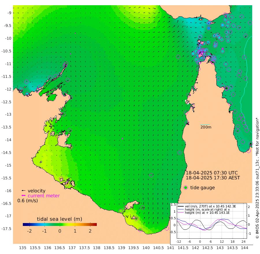 15cm/s -14T +3cm/s rms + 7cm/s -42T. ARA-GOC87 57m 25cm/s 9T +3cm/s rms + 2cm/s -2T. ARA-GOC87 60m 10cm/s 0T +2cm/s rms + 3cm/s 61T. ARA-GOC87 47m -86cm Daru -78cm Bobo Island -53cm Meer Island Barge -62cm Bramble Cay -75cm Unnamed Cay -81cm Pearce Cay -71cm Stephens Island -66cm Merrie England Shoals -77cm Mutacomal Reef -66cm Darnley Island Barge -55cm East Cay -73cm Yorke Island Barge -77cm Rennel Island -74cm Aureed Island -94cm Dungeness Reef -90cm Zagai Island -95cm Yam Island -118cm Dauan Island -93cm Saibai Island -137cm Phipi Reef -105cm Warrior Reef - West -87cm Mabuiag Island Barge -74cm Half Way Island -82cm Coconut Island -80cm Dugong Islet -87cm Poll Island -89cm Kirkcaldie Reef -98cm Suarji Island -79cm Sue Islet -115cm Hawkesbury Island -96cm Alert Patches -91cm Twin Island -116cm Badu Island -98cm St Pauls (Moa Island) -112cm Kubin (Moa Island) -94cm Ince Point -95cm Thursday Island -96cm Nardana Patches -107cm Turtle Head -112cm Round Island -109cm Goods Island -94cm Booby Island -89cm White Rocks Area -33cm Carpentaria -84cm Papou Point -107cm Bampfield Head -72cm Crab Island -83cm Red Wallis Island -107cm Packe Island -80cm Harrington Reef -119cm Herald Camp -20cm Sharp Point -88cm Red Island Point -99cm Possession Island -69cm Alpha Rock -87cm Frederick Point -80cm Wyborn Reef Light -81cm Tetley Island -54cm Triangle Reef -92cm Turtle Head Island -54cm Maclennan Cay -45cm Raine Island -68cm Mcsweeny Reef -62cm Collette Reef -52cm Shadwell Reef -66cm Hannibal Island -63cm Round Point -48cm Vrilya Point -54cm Cape Grenville -60cm Hicks Island -63cm Sir Charles Hardy Island -18cm Harvey Island -46cm Kay Reef -49cm Rocky Island -43cm Chapman Island -39cm Ham Reef -45cm Jubilee Reef -43cm Night Island -37cm Unnamed Reef No. 3 -49cm Morris Island -52cm 1st 3 Mile Opening -47cm Creech Reef -40cm Fife Island -51cm Eden Reef -44cm Stanley Island -45cm Normanby River -76cm Yabooma Island -100cm Hutchison River -68cm Elcho Island -66cm North West Crocodile Island -22cm Cape Wessel -50cm Stevens Island -42cm Guluwuru Island -47cm Hopeful Bay -40cm Auster Point -44cm Two Island Bay -78cm Cadell Strait 21cm Mallison Island -42cm Melville Bay (Gove Harbour) -41cm Truant Island -24cm Cape Arnhem -7cm Cape Grey -2cm Hawk Island 38cm Milner Bay (Groote Eylandt) 37cm Cape Beatrice 68cm West Island 68cm Centre Island 18cm Mornington Island 30cm West Wellesley Islands -7cm Bountiful Island 19cm Albert River Mouth 29cm Sweers Island 2cm Karumba -24cm Nassau River Offshore -48cm Christmas Creek -52cm Archer River -52cm Boyd Point -67cm Weipa (Humbug Point) -38cm Pennefather River -54cm Cullen Point