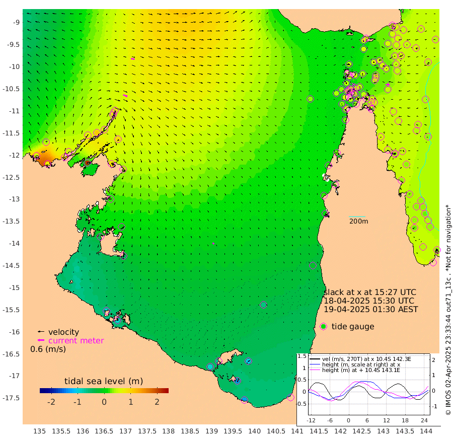 41cm/s 111T +3cm/s rms + 7cm/s -42T. ARA-GOC87 57m 15cm/s 149T +3cm/s rms + 2cm/s -2T. ARA-GOC87 60m 33cm/s 104T +2cm/s rms + 3cm/s 61T. ARA-GOC87 47m 61cm Daru 57cm Bobo Island 45cm Meer Island Barge 48cm Bramble Cay 58cm Unnamed Cay 52cm Pearce Cay 51cm Stephens Island 52cm Merrie England Shoals 56cm Mutacomal Reef 55cm Darnley Island Barge 38cm East Cay 58cm Yorke Island Barge 50cm Rennel Island 51cm Aureed Island 56cm Dungeness Reef 67cm Zagai Island 60cm Yam Island 74cm Dauan Island 67cm Saibai Island 67cm Phipi Reef 66cm Warrior Reef - West 51cm Mabuiag Island Barge 51cm Half Way Island 57cm Coconut Island 51cm Dugong Islet 55cm Poll Island 53cm Kirkcaldie Reef 47cm Suarji Island 57cm Sue Islet 51cm Hawkesbury Island 50cm Alert Patches 52cm Twin Island 58cm Badu Island 56cm St Pauls (Moa Island) 56cm Kubin (Moa Island) 49cm Ince Point 47cm Thursday Island 49cm Nardana Patches 48cm Turtle Head 56cm Round Island 47cm Goods Island 41cm Booby Island 31cm White Rocks Area 31cm Carpentaria 50cm Papou Point 64cm Bampfield Head 34cm Crab Island 34cm Red Wallis Island 48cm Packe Island 48cm Harrington Reef 54cm Herald Camp 11cm Sharp Point 31cm Red Island Point 50cm Possession Island 49cm Alpha Rock 52cm Frederick Point 63cm Wyborn Reef Light 64cm Tetley Island 43cm Triangle Reef 67cm Turtle Head Island 38cm Maclennan Cay 35cm Raine Island 51cm Mcsweeny Reef 50cm Collette Reef 44cm Shadwell Reef 54cm Hannibal Island 46cm Round Point 28cm Vrilya Point 40cm Cape Grenville 43cm Hicks Island 49cm Sir Charles Hardy Island 13cm Harvey Island 37cm Kay Reef 35cm Rocky Island 34cm Chapman Island 32cm Ham Reef 37cm Jubilee Reef 33cm Night Island 30cm Unnamed Reef No. 3 35cm Morris Island 41cm 1st 3 Mile Opening 36cm Creech Reef 29cm Fife Island 42cm Eden Reef 36cm Stanley Island 32cm Normanby River 55cm Yabooma Island 77cm Hutchison River 53cm Elcho Island 40cm North West Crocodile Island 68cm Cape Wessel 71cm Stevens Island 107cm Guluwuru Island 57cm Hopeful Bay 66cm Auster Point 72cm Two Island Bay 99cm Cadell Strait 211cm Mallison Island 84cm Melville Bay (Gove Harbour) 95cm Truant Island 63cm Cape Arnhem 21cm Cape Grey 4cm Hawk Island -38cm Milner Bay (Groote Eylandt) -53cm Cape Beatrice -97cm West Island -94cm Centre Island -89cm Mornington Island -94cm West Wellesley Islands -109cm Bountiful Island -128cm Albert River Mouth -141cm Sweers Island -129cm Karumba -60cm Nassau River Offshore -21cm Christmas Creek 4cm Archer River 20cm Boyd Point 17cm Weipa (Humbug Point) 21cm Pennefather River 27cm Cullen Point