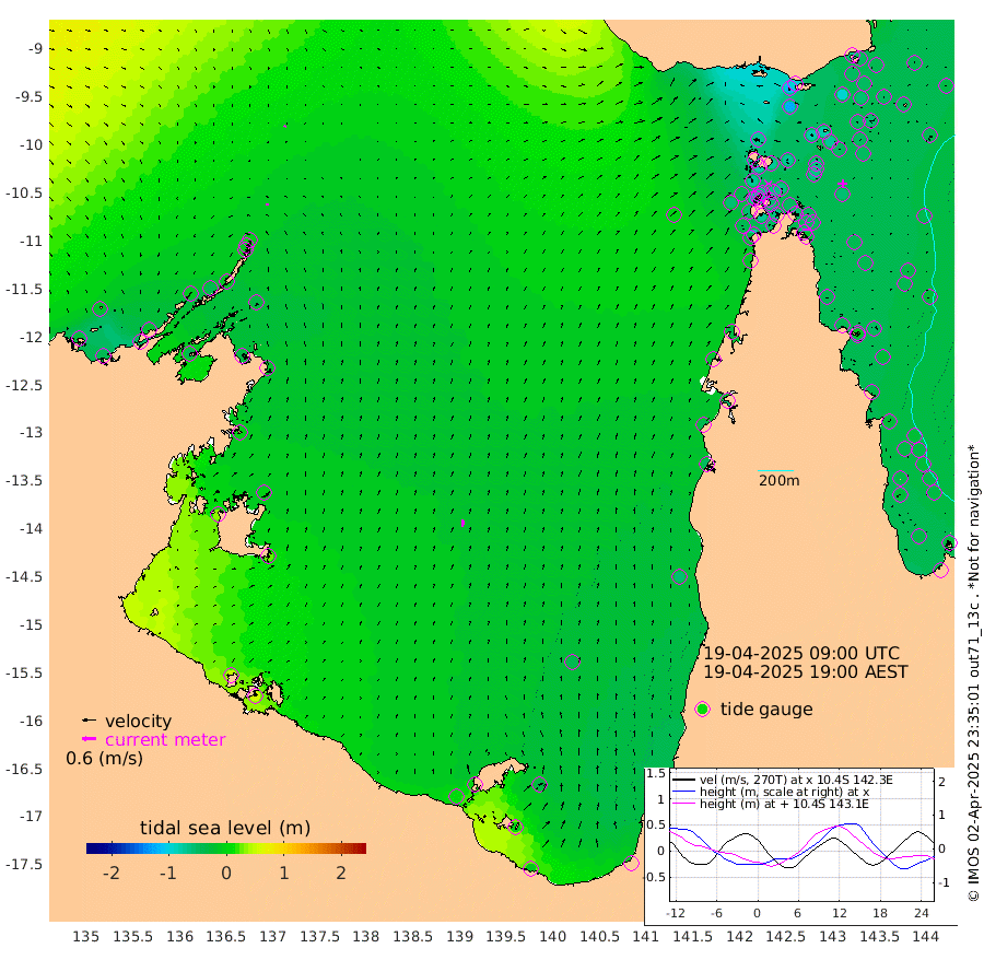 10cm/s -16T +3cm/s rms + 7cm/s -42T. ARA-GOC87 57m 31cm/s 9T +3cm/s rms + 2cm/s -2T. ARA-GOC87 60m 5cm/s 38T +2cm/s rms + 3cm/s 61T. ARA-GOC87 47m -61cm Daru -51cm Bobo Island -39cm Meer Island Barge -41cm Bramble Cay -50cm Unnamed Cay -53cm Pearce Cay -46cm Stephens Island -40cm Merrie England Shoals -50cm Mutacomal Reef -49cm Darnley Island Barge -34cm East Cay -54cm Yorke Island Barge -49cm Rennel Island -52cm Aureed Island -69cm Dungeness Reef -76cm Zagai Island -75cm Yam Island -118cm Dauan Island -96cm Saibai Island -126cm Phipi Reef -94cm Warrior Reef - West -70cm Mabuiag Island Barge -48cm Half Way Island -52cm Coconut Island -54cm Dugong Islet -62cm Poll Island -61cm Kirkcaldie Reef -70cm Suarji Island -61cm Sue Islet -74cm Hawkesbury Island -65cm Alert Patches -61cm Twin Island -80cm Badu Island -72cm St Pauls (Moa Island) -76cm Kubin (Moa Island) -65cm Ince Point -63cm Thursday Island -65cm Nardana Patches -73cm Turtle Head -71cm Round Island -69cm Goods Island -53cm Booby Island -43cm White Rocks Area -5cm Carpentaria -55cm Papou Point -55cm Bampfield Head -37cm Crab Island -44cm Red Wallis Island -69cm Packe Island -45cm Harrington Reef -80cm Herald Camp -17cm Sharp Point -52cm Red Island Point -63cm Possession Island -47cm Alpha Rock -56cm Frederick Point -50cm Wyborn Reef Light -52cm Tetley Island -40cm Triangle Reef -54cm Turtle Head Island -37cm Maclennan Cay -30cm Raine Island -45cm Mcsweeny Reef -42cm Collette Reef -39cm Shadwell Reef -45cm Hannibal Island -38cm Round Point -19cm Vrilya Point -34cm Cape Grenville -39cm Hicks Island -48cm Sir Charles Hardy Island -12cm Harvey Island -27cm Kay Reef -34cm Rocky Island -30cm Chapman Island -27cm Ham Reef -32cm Jubilee Reef -30cm Night Island -23cm Unnamed Reef No. 3 -32cm Morris Island -37cm 1st 3 Mile Opening -32cm Creech Reef -25cm Fife Island -37cm Eden Reef -29cm Stanley Island -26cm Normanby River -26cm Yabooma Island -44cm Hutchison River -22cm Elcho Island -20cm North West Crocodile Island -1cm Cape Wessel -14cm Stevens Island -38cm Guluwuru Island -15cm Hopeful Bay -10cm Auster Point -18cm Two Island Bay -48cm Cadell Strait -45cm Mallison Island -33cm Melville Bay (Gove Harbour) -30cm Truant Island -22cm Cape Arnhem -6cm Cape Grey -6cm Hawk Island 32cm Milner Bay (Groote Eylandt) 28cm Cape Beatrice 52cm West Island 53cm Centre Island -6cm Mornington Island 3cm West Wellesley Islands -31cm Bountiful Island -12cm Albert River Mouth -1cm Sweers Island -23cm Karumba -42cm Nassau River Offshore -58cm Christmas Creek -47cm Archer River -44cm Boyd Point -56cm Weipa (Humbug Point) -23cm Pennefather River -34cm Cullen Point