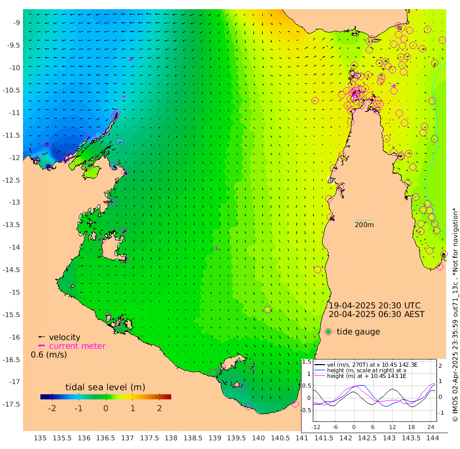 28cm/s -92T +3cm/s rms + 7cm/s -42T. ARA-GOC87 57m 32cm/s 168T +3cm/s rms + 2cm/s -2T. ARA-GOC87 60m 38cm/s -98T +2cm/s rms + 3cm/s 61T. ARA-GOC87 47m 66cm Daru 55cm Bobo Island 44cm Meer Island Barge 57cm Bramble Cay 69cm Unnamed Cay 58cm Pearce Cay 61cm Stephens Island 76cm Merrie England Shoals 80cm Mutacomal Reef 57cm Darnley Island Barge 54cm East Cay 59cm Yorke Island Barge 67cm Rennel Island 60cm Aureed Island 63cm Dungeness Reef 45cm Zagai Island 57cm Yam Island 45cm Dauan Island 47cm Saibai Island 48cm Phipi Reef 56cm Warrior Reef - West 54cm Mabuiag Island Barge 64cm Half Way Island 65cm Coconut Island 70cm Dugong Islet 63cm Poll Island 68cm Kirkcaldie Reef 66cm Suarji Island 63cm Sue Islet 86cm Hawkesbury Island 79cm Alert Patches 73cm Twin Island 67cm Badu Island 66cm St Pauls (Moa Island) 74cm Kubin (Moa Island) 73cm Ince Point 76cm Thursday Island 74cm Nardana Patches 80cm Turtle Head 78cm Round Island 82cm Goods Island 87cm Booby Island 85cm White Rocks Area 86cm Carpentaria 51cm Papou Point 95cm Bampfield Head 70cm Crab Island 93cm Red Wallis Island 96cm Packe Island 74cm Harrington Reef 101cm Herald Camp 19cm Sharp Point 66cm Red Island Point 67cm Possession Island 74cm Alpha Rock 73cm Frederick Point 73cm Wyborn Reef Light 73cm Tetley Island 51cm Triangle Reef 63cm Turtle Head Island 51cm Maclennan Cay 41cm Raine Island 66cm Mcsweeny Reef 65cm Collette Reef 53cm Shadwell Reef 68cm Hannibal Island 66cm Round Point 75cm Vrilya Point 67cm Cape Grenville 53cm Hicks Island 64cm Sir Charles Hardy Island 18cm Harvey Island 64cm Kay Reef 50cm Rocky Island 54cm Chapman Island 50cm Ham Reef 46cm Jubilee Reef 48cm Night Island 54cm Unnamed Reef No. 3 50cm Morris Island 43cm 1st 3 Mile Opening 50cm Creech Reef 55cm Fife Island 49cm Eden Reef 56cm Stanley Island 54cm Normanby River -155cm Yabooma Island -191cm Hutchison River -169cm Elcho Island -163cm North West Crocodile Island -105cm Cape Wessel -145cm Stevens Island -106cm Guluwuru Island -124cm Hopeful Bay -120cm Auster Point -127cm Two Island Bay -169cm Cadell Strait -3cm Mallison Island -94cm Melville Bay (Gove Harbour) -97cm Truant Island -64cm Cape Arnhem -58cm Cape Grey -43cm Hawk Island -45cm Milner Bay (Groote Eylandt) -31cm Cape Beatrice -5cm West Island -7cm Centre Island 2cm Mornington Island 8cm West Wellesley Islands -8cm Bountiful Island -67cm Albert River Mouth -70cm Sweers Island -45cm Karumba 44cm Nassau River Offshore 71cm Christmas Creek 70cm Archer River 72cm Boyd Point 74cm Weipa (Humbug Point) 61cm Pennefather River 80cm Cullen Point