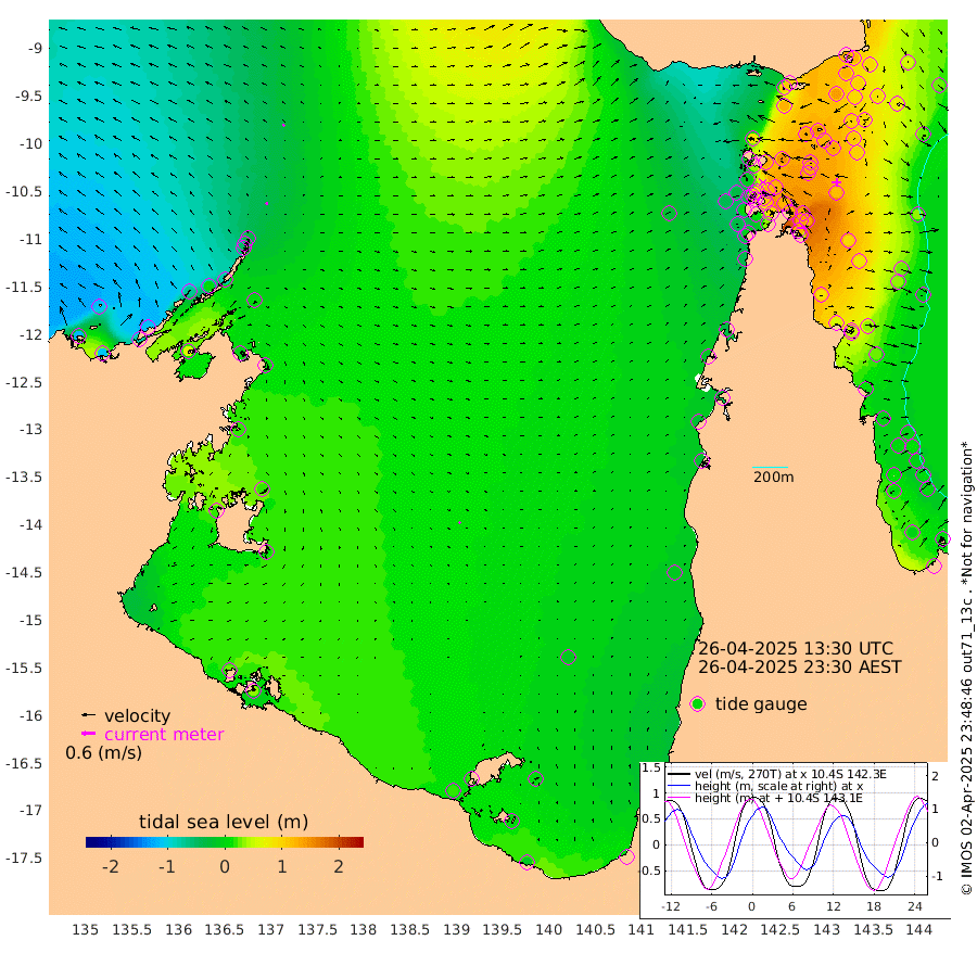 11cm/s 58T +3cm/s rms + 7cm/s -42T. ARA-GOC87 57m 9cm/s 46T +3cm/s rms + 2cm/s -2T. ARA-GOC87 60m 10cm/s 41T +2cm/s rms + 3cm/s 61T. ARA-GOC87 47m 128cm Daru 120cm Bobo Island 27cm Meer Island Barge 55cm Bramble Cay 100cm Unnamed Cay 95cm Pearce Cay 83cm Stephens Island 94cm Merrie England Shoals 125cm Mutacomal Reef 75cm Darnley Island Barge 29cm East Cay 102cm Yorke Island Barge 105cm Rennel Island 110cm Aureed Island 121cm Dungeness Reef 144cm Zagai Island 133cm Yam Island 102cm Dauan Island 107cm Saibai Island 124cm Phipi Reef 138cm Warrior Reef - West 84cm Mabuiag Island Barge 102cm Half Way Island 135cm Coconut Island 114cm Dugong Islet 131cm Poll Island 129cm Kirkcaldie Reef 149cm Suarji Island 132cm Sue Islet -14cm Hawkesbury Island 124cm Alert Patches 126cm Twin Island 16cm Badu Island 134cm St Pauls (Moa Island) 31cm Kubin (Moa Island) 93cm Ince Point 71cm Thursday Island 78cm Nardana Patches 39cm Turtle Head 33cm Round Island -15cm Goods Island -41cm Booby Island -31cm White Rocks Area -23cm Carpentaria 112cm Papou Point 1cm Bampfield Head -34cm Crab Island -36cm Red Wallis Island 9cm Packe Island 137cm Harrington Reef -6cm Herald Camp 49cm Sharp Point 30cm Red Island Point 95cm Possession Island 123cm Alpha Rock 131cm Frederick Point 134cm Wyborn Reef Light 138cm Tetley Island 37cm Triangle Reef 127cm Turtle Head Island 28cm Maclennan Cay -1cm Raine Island 91cm Mcsweeny Reef 79cm Collette Reef 34cm Shadwell Reef 83cm Hannibal Island 54cm Round Point -39cm Vrilya Point 47cm Cape Grenville 38cm Hicks Island 31cm Sir Charles Hardy Island 15cm Harvey Island 24cm Kay Reef 9cm Rocky Island -3cm Chapman Island -3cm Ham Reef 6cm Jubilee Reef 12cm Night Island -2cm Unnamed Reef No. 3 8cm Morris Island 6cm 1st 3 Mile Opening 6cm Creech Reef 4cm Fife Island -6cm Eden Reef 5cm Stanley Island 4cm Normanby River -115cm Yabooma Island -105cm Hutchison River -105cm Elcho Island -109cm North West Crocodile Island -37cm Cape Wessel -72cm Stevens Island 5cm Guluwuru Island -77cm Hopeful Bay -49cm Auster Point -61cm Two Island Bay -78cm Cadell Strait 62cm Mallison Island -3cm Melville Bay (Gove Harbour) 0cm Truant Island 12cm Cape Arnhem 18cm Cape Grey 21cm Hawk Island 22cm Milner Bay (Groote Eylandt) 13cm Cape Beatrice 24cm West Island 32cm Centre Island 22cm Mornington Island 16cm West Wellesley Islands 3cm Bountiful Island -13cm Albert River Mouth 3cm Sweers Island -9cm Karumba -8cm Nassau River Offshore -11cm Christmas Creek -29cm Archer River -24cm Boyd Point -41cm Weipa (Humbug Point) -22cm Pennefather River -36cm Cullen Point