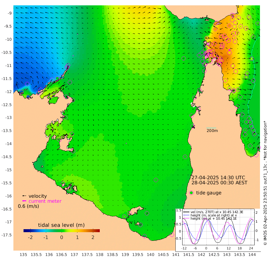 7cm/s 55T +3cm/s rms + 7cm/s -42T. ARA-GOC87 57m 9cm/s 111T +3cm/s rms + 2cm/s -2T. ARA-GOC87 60m 6cm/s 5T +2cm/s rms + 3cm/s 61T. ARA-GOC87 47m 117cm Daru 106cm Bobo Island 21cm Meer Island Barge 42cm Bramble Cay 86cm Unnamed Cay 81cm Pearce Cay 70cm Stephens Island 78cm Merrie England Shoals 111cm Mutacomal Reef 67cm Darnley Island Barge 18cm East Cay 94cm Yorke Island Barge 92cm Rennel Island 101cm Aureed Island 116cm Dungeness Reef 148cm Zagai Island 137cm Yam Island 127cm Dauan Island 129cm Saibai Island 140cm Phipi Reef 146cm Warrior Reef - West 100cm Mabuiag Island Barge 91cm Half Way Island 125cm Coconut Island 107cm Dugong Islet 128cm Poll Island 125cm Kirkcaldie Reef 152cm Suarji Island 133cm Sue Islet 4cm Hawkesbury Island 129cm Alert Patches 129cm Twin Island 35cm Badu Island 141cm St Pauls (Moa Island) 46cm Kubin (Moa Island) 103cm Ince Point 85cm Thursday Island 91cm Nardana Patches 55cm Turtle Head 45cm Round Island 5cm Goods Island -16cm Booby Island -13cm White Rocks Area 4cm Carpentaria 115cm Papou Point 19cm Bampfield Head -13cm Crab Island -12cm Red Wallis Island 28cm Packe Island 124cm Harrington Reef 17cm Herald Camp 52cm Sharp Point 40cm Red Island Point 100cm Possession Island 124cm Alpha Rock 127cm Frederick Point 120cm Wyborn Reef Light 126cm Tetley Island 34cm Triangle Reef 112cm Turtle Head Island 23cm Maclennan Cay -6cm Raine Island 79cm Mcsweeny Reef 68cm Collette Reef 29cm Shadwell Reef 70cm Hannibal Island 39cm Round Point -16cm Vrilya Point 36cm Cape Grenville 28cm Hicks Island 27cm Sir Charles Hardy Island 12cm Harvey Island 14cm Kay Reef 3cm Rocky Island -8cm Chapman Island -7cm Ham Reef 1cm Jubilee Reef 7cm Night Island -7cm Unnamed Reef No. 3 0cm Morris Island 3cm 1st 3 Mile Opening 2cm Creech Reef -4cm Fife Island -13cm Eden Reef -1cm Stanley Island -8cm Normanby River -164cm Yabooma Island -163cm Hutchison River -156cm Elcho Island -158cm North West Crocodile Island -68cm Cape Wessel -119cm Stevens Island -17cm Guluwuru Island -119cm Hopeful Bay -85cm Auster Point -95cm Two Island Bay -120cm Cadell Strait 64cm Mallison Island -27cm Melville Bay (Gove Harbour) -24cm Truant Island -2cm Cape Arnhem 4cm Cape Grey 6cm Hawk Island 9cm Milner Bay (Groote Eylandt) 3cm Cape Beatrice 20cm West Island 28cm Centre Island 20cm Mornington Island 16cm West Wellesley Islands -2cm Bountiful Island -28cm Albert River Mouth -19cm Sweers Island -23cm Karumba 1cm Nassau River Offshore 7cm Christmas Creek -11cm Archer River -2cm Boyd Point -19cm Weipa (Humbug Point) -5cm Pennefather River -11cm Cullen Point