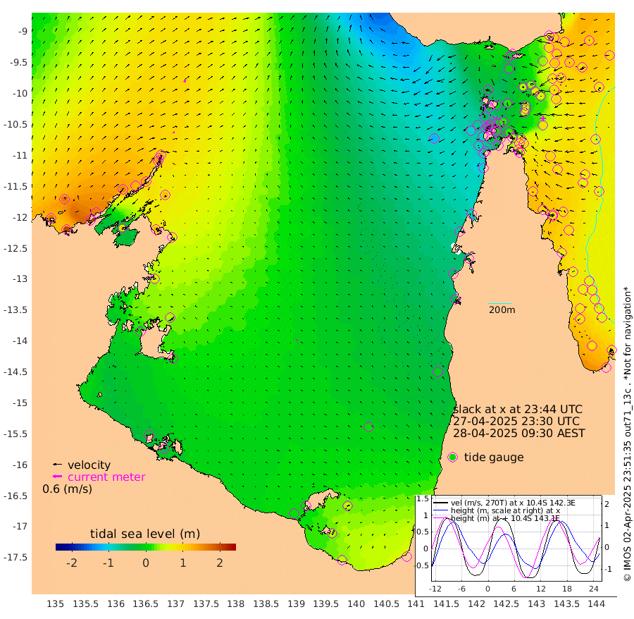 14cm/s 79T +3cm/s rms + 7cm/s -42T. ARA-GOC87 57m 9cm/s -126T +3cm/s rms + 2cm/s -2T. ARA-GOC87 60m 18cm/s 63T +2cm/s rms + 3cm/s 61T. ARA-GOC87 47m 92cm Daru 103cm Bobo Island 80cm Meer Island Barge 102cm Bramble Cay 102cm Unnamed Cay 109cm Pearce Cay 105cm Stephens Island 105cm Merrie England Shoals 95cm Mutacomal Reef 95cm Darnley Island Barge 92cm East Cay 90cm Yorke Island Barge 94cm Rennel Island 90cm Aureed Island 76cm Dungeness Reef 33cm Zagai Island 38cm Yam Island -17cm Dauan Island -21cm Saibai Island 1cm Phipi Reef 37cm Warrior Reef - West -33cm Mabuiag Island Barge 92cm Half Way Island 72cm Coconut Island 87cm Dugong Islet 54cm Poll Island 57cm Kirkcaldie Reef 21cm Suarji Island 42cm Sue Islet -51cm Hawkesbury Island 4cm Alert Patches 16cm Twin Island -56cm Badu Island 7cm St Pauls (Moa Island) -29cm Kubin (Moa Island) -13cm Ince Point -30cm Thursday Island -25cm Nardana Patches -38cm Turtle Head -46cm Round Island -59cm Goods Island -92cm Booby Island -73cm White Rocks Area -118cm Carpentaria 11cm Papou Point -93cm Bampfield Head -90cm Crab Island -84cm Red Wallis Island -44cm Packe Island 89cm Harrington Reef -65cm Herald Camp -5cm Sharp Point -30cm Red Island Point -12cm Possession Island 22cm Alpha Rock 48cm Frederick Point 87cm Wyborn Reef Light 77cm Tetley Island 64cm Triangle Reef 93cm Turtle Head Island 75cm Maclennan Cay 59cm Raine Island 93cm Mcsweeny Reef 86cm Collette Reef 67cm Shadwell Reef 100cm Hannibal Island 104cm Round Point -104cm Vrilya Point 88cm Cape Grenville 89cm Hicks Island 86cm Sir Charles Hardy Island 28cm Harvey Island 84cm Kay Reef 74cm Rocky Island 65cm Chapman Island 62cm Ham Reef 68cm Jubilee Reef 64cm Night Island 62cm Unnamed Reef No. 3 78cm Morris Island 60cm 1st 3 Mile Opening 67cm Creech Reef 79cm Fife Island 89cm Eden Reef 75cm Stanley Island 98cm Normanby River 165cm Yabooma Island 201cm Hutchison River 163cm Elcho Island 162cm North West Crocodile Island 117cm Cape Wessel 154cm Stevens Island 126cm Guluwuru Island 137cm Hopeful Bay 123cm Auster Point 135cm Two Island Bay 188cm Cadell Strait 104cm Mallison Island 115cm Melville Bay (Gove Harbour) 115cm Truant Island 72cm Cape Arnhem 55cm Cape Grey 44cm Hawk Island 12cm Milner Bay (Groote Eylandt) 13cm Cape Beatrice -18cm West Island -31cm Centre Island 12cm Mornington Island 8cm West Wellesley Islands 47cm Bountiful Island 49cm Albert River Mouth 50cm Sweers Island 47cm Karumba 13cm Nassau River Offshore -7cm Christmas Creek -38cm Archer River -51cm Boyd Point -47cm Weipa (Humbug Point) -75cm Pennefather River -87cm Cullen Point