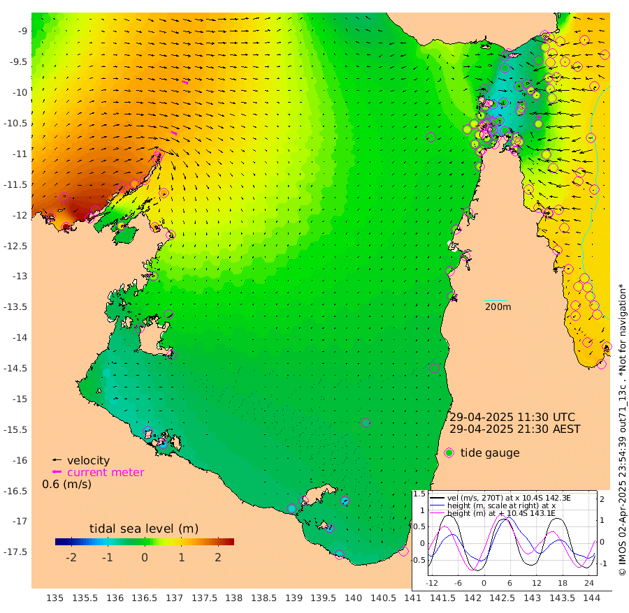 44cm/s 118T +3cm/s rms + 7cm/s -42T. ARA-GOC87 57m 1cm/s -90T +3cm/s rms + 2cm/s -2T. ARA-GOC87 60m 44cm/s 110T +2cm/s rms + 3cm/s 61T. ARA-GOC87 47m 50cm Daru 68cm Bobo Island 80cm Meer Island Barge 87cm Bramble Cay 67cm Unnamed Cay 84cm Pearce Cay 80cm Stephens Island 74cm Merrie England Shoals 48cm Mutacomal Reef 71cm Darnley Island Barge 90cm East Cay 55cm Yorke Island Barge 64cm Rennel Island 58cm Aureed Island 43cm Dungeness Reef 0cm Zagai Island -2cm Yam Island -32cm Dauan Island -45cm Saibai Island -14cm Phipi Reef -4cm Warrior Reef - West -23cm Mabuiag Island Barge 59cm Half Way Island 51cm Coconut Island 44cm Dugong Islet 23cm Poll Island 27cm Kirkcaldie Reef -2cm Suarji Island 4cm Sue Islet 45cm Hawkesbury Island 7cm Alert Patches 10cm Twin Island 41cm Badu Island -7cm St Pauls (Moa Island) 33cm Kubin (Moa Island) 6cm Ince Point 10cm Thursday Island 8cm Nardana Patches 30cm Turtle Head 34cm Round Island 54cm Goods Island 51cm Booby Island 55cm White Rocks Area 15cm Carpentaria 9cm Papou Point 61cm Bampfield Head 48cm Crab Island 45cm Red Wallis Island 42cm Packe Island 52cm Harrington Reef 30cm Herald Camp -22cm Sharp Point 32cm Red Island Point 19cm Possession Island -3cm Alpha Rock 27cm Frederick Point 51cm Wyborn Reef Light 42cm Tetley Island 65cm Triangle Reef 73cm Turtle Head Island 74cm Maclennan Cay 85cm Raine Island 66cm Mcsweeny Reef 67cm Collette Reef 69cm Shadwell Reef 77cm Hannibal Island 94cm Round Point 34cm Vrilya Point 77cm Cape Grenville 85cm Hicks Island 76cm Sir Charles Hardy Island 24cm Harvey Island 84cm Kay Reef 81cm Rocky Island 85cm Chapman Island 77cm Ham Reef 80cm Jubilee Reef 74cm Night Island 82cm Unnamed Reef No. 3 89cm Morris Island 84cm 1st 3 Mile Opening 83cm Creech Reef 88cm Fife Island 106cm Eden Reef 86cm Stanley Island 98cm Normanby River 205cm Yabooma Island 253cm Hutchison River 209cm Elcho Island 194cm North West Crocodile Island 139cm Cape Wessel 188cm Stevens Island 136cm Guluwuru Island 168cm Hopeful Bay 156cm Auster Point 153cm Two Island Bay 219cm Cadell Strait 88cm Mallison Island 122cm Melville Bay (Gove Harbour) 132cm Truant Island 78cm Cape Arnhem 34cm Cape Grey 12cm Hawk Island -37cm Milner Bay (Groote Eylandt) -46cm Cape Beatrice -111cm West Island -109cm Centre Island -86cm Mornington Island -94cm West Wellesley Islands -99cm Bountiful Island -89cm Albert River Mouth -105cm Sweers Island -89cm Karumba -54cm Nassau River Offshore -23cm Christmas Creek 16cm Archer River 15cm Boyd Point 26cm Weipa (Humbug Point) 27cm Pennefather River 19cm Cullen Point