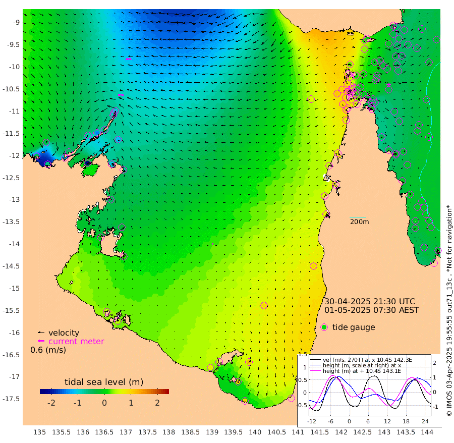 52cm/s -88T +3cm/s rms + 7cm/s -42T. ARA-GOC87 57m 14cm/s -137T +3cm/s rms + 2cm/s -2T. ARA-GOC87 60m 51cm/s -98T +2cm/s rms + 3cm/s 61T. ARA-GOC87 47m -39cm Daru -54cm Bobo Island -28cm Meer Island Barge -32cm Bramble Cay -35cm Unnamed Cay -47cm Pearce Cay -41cm Stephens Island -34cm Merrie England Shoals -32cm Mutacomal Reef -45cm Darnley Island Barge -23cm East Cay -47cm Yorke Island Barge -33cm Rennel Island -46cm Aureed Island -26cm Dungeness Reef -30cm Zagai Island -13cm Yam Island 20cm Dauan Island 6cm Saibai Island 31cm Phipi Reef -15cm Warrior Reef - West 30cm Mabuiag Island Barge -39cm Half Way Island -36cm Coconut Island -34cm Dugong Islet -23cm Poll Island -19cm Kirkcaldie Reef 5cm Suarji Island -28cm Sue Islet 86cm Hawkesbury Island 14cm Alert Patches 0cm Twin Island 77cm Badu Island 2cm St Pauls (Moa Island) 59cm Kubin (Moa Island) 28cm Ince Point 42cm Thursday Island 39cm Nardana Patches 67cm Turtle Head 74cm Round Island 93cm Goods Island 105cm Booby Island 103cm White Rocks Area 65cm Carpentaria -4cm Papou Point 96cm Bampfield Head 84cm Crab Island 98cm Red Wallis Island 82cm Packe Island -39cm Harrington Reef 103cm Herald Camp -1cm Sharp Point 55cm Red Island Point 27cm Possession Island -8cm Alpha Rock -18cm Frederick Point -41cm Wyborn Reef Light -38cm Tetley Island -20cm Triangle Reef -51cm Turtle Head Island -17cm Maclennan Cay -8cm Raine Island -36cm Mcsweeny Reef -32cm Collette Reef -18cm Shadwell Reef -37cm Hannibal Island -28cm Round Point 71cm Vrilya Point -20cm Cape Grenville -22cm Hicks Island -16cm Sir Charles Hardy Island -8cm Harvey Island -15cm Kay Reef -10cm Rocky Island -6cm Chapman Island -10cm Ham Reef -15cm Jubilee Reef -12cm Night Island -8cm Unnamed Reef No. 3 -12cm Morris Island -8cm 1st 3 Mile Opening -12cm Creech Reef -15cm Fife Island -19cm Eden Reef -12cm Stanley Island -19cm Normanby River -40cm Yabooma Island -66cm Hutchison River -50cm Elcho Island -40cm North West Crocodile Island -101cm Cape Wessel -80cm Stevens Island -137cm Guluwuru Island -59cm Hopeful Bay -85cm Auster Point -96cm Two Island Bay -124cm Cadell Strait -241cm Mallison Island -103cm Melville Bay (Gove Harbour) -118cm Truant Island -82cm Cape Arnhem -48cm Cape Grey -28cm Hawk Island -3cm Milner Bay (Groote Eylandt) 15cm Cape Beatrice 48cm West Island 45cm Centre Island 76cm Mornington Island 76cm West Wellesley Islands 118cm Bountiful Island 112cm Albert River Mouth 106cm Sweers Island 123cm Karumba 97cm Nassau River Offshore 91cm Christmas Creek 79cm Archer River 65cm Boyd Point 89cm Weipa (Humbug Point) 51cm Pennefather River 78cm Cullen Point
