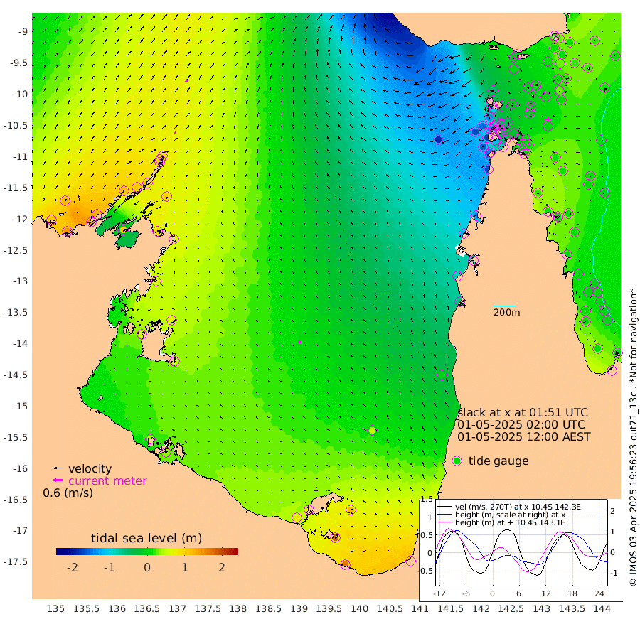 17cm/s 45T +3cm/s rms + 7cm/s -42T. ARA-GOC87 57m 16cm/s -66T +3cm/s rms + 2cm/s -2T. ARA-GOC87 60m 26cm/s 41T +2cm/s rms + 3cm/s 61T. ARA-GOC87 47m 17cm Daru 28cm Bobo Island 11cm Meer Island Barge 18cm Bramble Cay 14cm Unnamed Cay 26cm Pearce Cay 17cm Stephens Island 10cm Merrie England Shoals 11cm Mutacomal Reef 18cm Darnley Island Barge 10cm East Cay 18cm Yorke Island Barge 10cm Rennel Island 24cm Aureed Island 10cm Dungeness Reef 9cm Zagai Island -5cm Yam Island -9cm Dauan Island -12cm Saibai Island 2cm Phipi Reef 14cm Warrior Reef - West -55cm Mabuiag Island Barge 7cm Half Way Island 4cm Coconut Island 5cm Dugong Islet -2cm Poll Island -15cm Kirkcaldie Reef -15cm Suarji Island -8cm Sue Islet -140cm Hawkesbury Island -49cm Alert Patches -39cm Twin Island -117cm Badu Island -36cm St Pauls (Moa Island) -98cm Kubin (Moa Island) -65cm Ince Point -86cm Thursday Island -78cm Nardana Patches -100cm Turtle Head -113cm Round Island -136cm Goods Island -172cm Booby Island -157cm White Rocks Area -181cm Carpentaria -38cm Papou Point -178cm Bampfield Head -156cm Crab Island -162cm Red Wallis Island -119cm Packe Island 1cm Harrington Reef -146cm Herald Camp -7cm Sharp Point -97cm Red Island Point -66cm Possession Island -29cm Alpha Rock -20cm Frederick Point 7cm Wyborn Reef Light 3cm Tetley Island 6cm Triangle Reef -6cm Turtle Head Island 2cm Maclennan Cay -4cm Raine Island 11cm Mcsweeny Reef 10cm Collette Reef 3cm Shadwell Reef 16cm Hannibal Island 13cm Round Point -168cm Vrilya Point 4cm Cape Grenville 8cm Hicks Island 6cm Sir Charles Hardy Island 2cm Harvey Island 1cm Kay Reef 4cm Rocky Island 0cm Chapman Island -4cm Ham Reef 0cm Jubilee Reef 2cm Night Island -6cm Unnamed Reef No. 3 3cm Morris Island -7cm 1st 3 Mile Opening -3cm Creech Reef 6cm Fife Island 11cm Eden Reef -3cm Stanley Island 9cm Normanby River 108cm Yabooma Island 148cm Hutchison River 124cm Elcho Island 121cm North West Crocodile Island 88cm Cape Wessel 116cm Stevens Island 110cm Guluwuru Island 106cm Hopeful Bay 90cm Auster Point 98cm Two Island Bay 146cm Cadell Strait 112cm Mallison Island 103cm Melville Bay (Gove Harbour) 99cm Truant Island 73cm Cape Arnhem 65cm Cape Grey 72cm Hawk Island 58cm Milner Bay (Groote Eylandt) 57cm Cape Beatrice 38cm West Island 33cm Centre Island 86cm Mornington Island 80cm West Wellesley Islands 125cm Bountiful Island 172cm Albert River Mouth 184cm Sweers Island 155cm Karumba 47cm Nassau River Offshore -6cm Christmas Creek -63cm Archer River -86cm Boyd Point -85cm Weipa (Humbug Point) -114cm Pennefather River -138cm Cullen Point