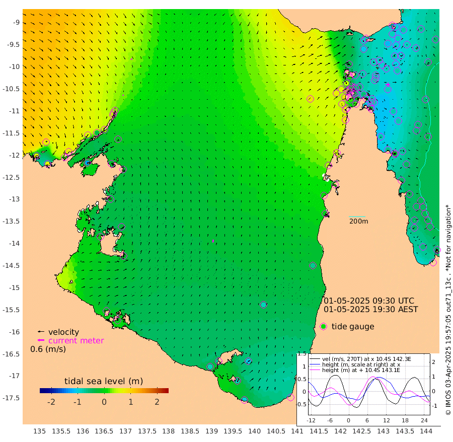 6cm/s -174T +3cm/s rms + 7cm/s -42T. ARA-GOC87 57m 29cm/s 10T +3cm/s rms + 2cm/s -2T. ARA-GOC87 60m 13cm/s 154T +2cm/s rms + 3cm/s 61T. ARA-GOC87 47m -98cm Daru -96cm Bobo Island -60cm Meer Island Barge -70cm Bramble Cay -85cm Unnamed Cay -92cm Pearce Cay -83cm Stephens Island -77cm Merrie England Shoals -89cm Mutacomal Reef -86cm Darnley Island Barge -58cm East Cay -93cm Yorke Island Barge -83cm Rennel Island -99cm Aureed Island -96cm Dungeness Reef -97cm Zagai Island -86cm Yam Island -97cm Dauan Island -88cm Saibai Island -107cm Phipi Reef -114cm Warrior Reef - West -31cm Mabuiag Island Barge -82cm Half Way Island -85cm Coconut Island -90cm Dugong Islet -84cm Poll Island -79cm Kirkcaldie Reef -83cm Suarji Island -84cm Sue Islet 53cm Hawkesbury Island -53cm Alert Patches -58cm Twin Island 26cm Badu Island -65cm St Pauls (Moa Island) 9cm Kubin (Moa Island) -32cm Ince Point -12cm Thursday Island -19cm Nardana Patches 0cm Turtle Head 31cm Round Island 43cm Goods Island 78cm Booby Island 73cm White Rocks Area 87cm Carpentaria -42cm Papou Point 84cm Bampfield Head 76cm Crab Island 69cm Red Wallis Island 20cm Packe Island -86cm Harrington Reef 45cm Herald Camp -24cm Sharp Point 16cm Red Island Point -18cm Possession Island -56cm Alpha Rock -70cm Frederick Point -81cm Wyborn Reef Light -79cm Tetley Island -57cm Triangle Reef -70cm Turtle Head Island -56cm Maclennan Cay -36cm Raine Island -81cm Mcsweeny Reef -75cm Collette Reef -56cm Shadwell Reef -82cm Hannibal Island -65cm Round Point 84cm Vrilya Point -60cm Cape Grenville -60cm Hicks Island -71cm Sir Charles Hardy Island -20cm Harvey Island -50cm Kay Reef -49cm Rocky Island -44cm Chapman Island -39cm Ham Reef -45cm Jubilee Reef -46cm Night Island -39cm Unnamed Reef No. 3 -47cm Morris Island -43cm 1st 3 Mile Opening -47cm Creech Reef -49cm Fife Island -54cm Eden Reef -45cm Stanley Island -49cm Normanby River 85cm Yabooma Island 71cm Hutchison River 79cm Elcho Island 80cm North West Crocodile Island 31cm Cape Wessel 62cm Stevens Island -33cm Guluwuru Island 58cm Hopeful Bay 46cm Auster Point 44cm Two Island Bay 22cm Cadell Strait -132cm Mallison Island -19cm Melville Bay (Gove Harbour) -15cm Truant Island -24cm Cape Arnhem -20cm Cape Grey -25cm Hawk Island -7cm Milner Bay (Groote Eylandt) -17cm Cape Beatrice -19cm West Island -15cm Centre Island -84cm Mornington Island -85cm West Wellesley Islands -110cm Bountiful Island -99cm Albert River Mouth -93cm Sweers Island -96cm Karumba -89cm Nassau River Offshore -73cm Christmas Creek -13cm Archer River 3cm Boyd Point 3cm Weipa (Humbug Point) 43cm Pennefather River 54cm Cullen Point