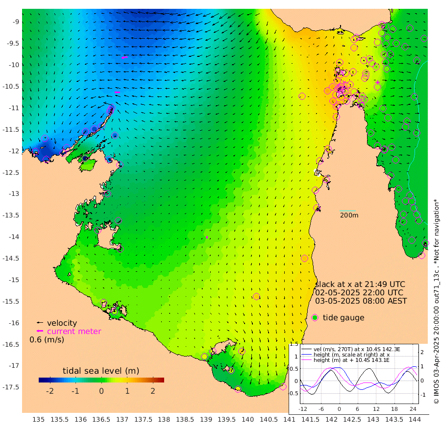 52cm/s -91T +3cm/s rms + 7cm/s -42T. ARA-GOC87 57m 23cm/s -169T +3cm/s rms + 2cm/s -2T. ARA-GOC87 60m 58cm/s -99T +2cm/s rms + 3cm/s 61T. ARA-GOC87 47m 31cm Daru 9cm Bobo Island -9cm Meer Island Barge 0cm Bramble Cay 18cm Unnamed Cay 10cm Pearce Cay 9cm Stephens Island 19cm Merrie England Shoals 35cm Mutacomal Reef -1cm Darnley Island Barge -4cm East Cay 9cm Yorke Island Barge 27cm Rennel Island 13cm Aureed Island 44cm Dungeness Reef 41cm Zagai Island 61cm Yam Island 78cm Dauan Island 61cm Saibai Island 93cm Phipi Reef 59cm Warrior Reef - West 81cm Mabuiag Island Barge 27cm Half Way Island 34cm Coconut Island 38cm Dugong Islet 50cm Poll Island 62cm Kirkcaldie Reef 76cm Suarji Island 45cm Sue Islet 118cm Hawkesbury Island 88cm Alert Patches 75cm Twin Island 113cm Badu Island 81cm St Pauls (Moa Island) 103cm Kubin (Moa Island) 92cm Ince Point 101cm Thursday Island 98cm Nardana Patches 112cm Turtle Head 103cm Round Island 119cm Goods Island 125cm Booby Island 122cm White Rocks Area 86cm Carpentaria 64cm Papou Point 104cm Bampfield Head 107cm Crab Island 122cm Red Wallis Island 120cm Packe Island 40cm Harrington Reef 124cm Herald Camp 27cm Sharp Point 100cm Red Island Point 80cm Possession Island 59cm Alpha Rock 59cm Frederick Point 27cm Wyborn Reef Light 32cm Tetley Island 2cm Triangle Reef 25cm Turtle Head Island 4cm Maclennan Cay -4cm Raine Island 16cm Mcsweeny Reef 10cm Collette Reef 1cm Shadwell Reef 7cm Hannibal Island 3cm Round Point 100cm Vrilya Point 8cm Cape Grenville 1cm Hicks Island 3cm Sir Charles Hardy Island 2cm Harvey Island 1cm Kay Reef -2cm Rocky Island -7cm Chapman Island -8cm Ham Reef -6cm Jubilee Reef 0cm Night Island -4cm Unnamed Reef No. 3 -3cm Morris Island -1cm 1st 3 Mile Opening -2cm Creech Reef -5cm Fife Island -17cm Eden Reef -3cm Stanley Island -10cm Normanby River -131cm Yabooma Island -161cm Hutchison River -140cm Elcho Island -124cm North West Crocodile Island -154cm Cape Wessel -155cm Stevens Island -167cm Guluwuru Island -139cm Hopeful Bay -146cm Auster Point -152cm Two Island Bay -186cm Cadell Strait -252cm Mallison Island -140cm Melville Bay (Gove Harbour) -155cm Truant Island -104cm Cape Arnhem -66cm Cape Grey -47cm Hawk Island -23cm Milner Bay (Groote Eylandt) 2cm Cape Beatrice 46cm West Island 42cm Centre Island 71cm Mornington Island 70cm West Wellesley Islands 90cm Bountiful Island 71cm Albert River Mouth 55cm Sweers Island 91cm Karumba 103cm Nassau River Offshore 106cm Christmas Creek 90cm Archer River 80cm Boyd Point 95cm Weipa (Humbug Point) 78cm Pennefather River 95cm Cullen Point