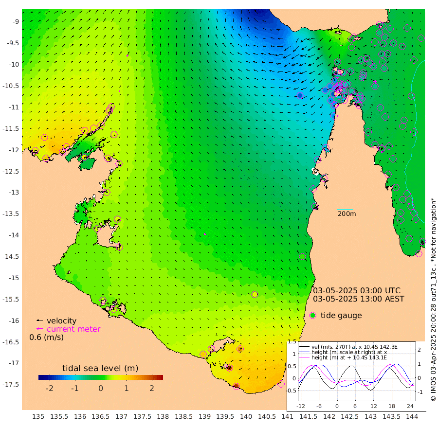 11cm/s 23T +3cm/s rms + 7cm/s -42T. ARA-GOC87 57m 19cm/s -69T +3cm/s rms + 2cm/s -2T. ARA-GOC87 60m 19cm/s 32T +2cm/s rms + 3cm/s 61T. ARA-GOC87 47m -48cm Daru -40cm Bobo Island -27cm Meer Island Barge -33cm Bramble Cay -49cm Unnamed Cay -39cm Pearce Cay -45cm Stephens Island -52cm Merrie England Shoals -55cm Mutacomal Reef -38cm Darnley Island Barge -33cm East Cay -42cm Yorke Island Barge -53cm Rennel Island -37cm Aureed Island -48cm Dungeness Reef -35cm Zagai Island -54cm Yam Island -18cm Dauan Island -23cm Saibai Island -13cm Phipi Reef -28cm Warrior Reef - West -65cm Mabuiag Island Barge -58cm Half Way Island -56cm Coconut Island -61cm Dugong Islet -56cm Poll Island -72cm Kirkcaldie Reef -57cm Suarji Island -58cm Sue Islet -136cm Hawkesbury Island -84cm Alert Patches -81cm Twin Island -105cm Badu Island -76cm St Pauls (Moa Island) -107cm Kubin (Moa Island) -89cm Ince Point -101cm Thursday Island -95cm Nardana Patches -101cm Turtle Head -117cm Round Island -121cm Goods Island -145cm Booby Island -138cm White Rocks Area -158cm Carpentaria -76cm Papou Point -165cm Bampfield Head -129cm Crab Island -139cm Red Wallis Island -117cm Packe Island -72cm Harrington Reef -142cm Herald Camp -17cm Sharp Point -102cm Red Island Point -94cm Possession Island -73cm Alpha Rock -75cm Frederick Point -60cm Wyborn Reef Light -63cm Tetley Island -27cm Triangle Reef -80cm Turtle Head Island -35cm Maclennan Cay -25cm Raine Island -47cm Mcsweeny Reef -41cm Collette Reef -29cm Shadwell Reef -41cm Hannibal Island -39cm Round Point -139cm Vrilya Point -42cm Cape Grenville -36cm Hicks Island -35cm Sir Charles Hardy Island -13cm Harvey Island -38cm Kay Reef -26cm Rocky Island -21cm Chapman Island -27cm Ham Reef -28cm Jubilee Reef -25cm Night Island -28cm Unnamed Reef No. 3 -28cm Morris Island -31cm 1st 3 Mile Opening -31cm Creech Reef -25cm Fife Island -20cm Eden Reef -34cm Stanley Island -32cm Normanby River 77cm Yabooma Island 108cm Hutchison River 97cm Elcho Island 92cm North West Crocodile Island 50cm Cape Wessel 81cm Stevens Island 69cm Guluwuru Island 79cm Hopeful Bay 56cm Auster Point 56cm Two Island Bay 100cm Cadell Strait 77cm Mallison Island 69cm Melville Bay (Gove Harbour) 61cm Truant Island 50cm Cape Arnhem 49cm Cape Grey 62cm Hawk Island 60cm Milner Bay (Groote Eylandt) 63cm Cape Beatrice 51cm West Island 49cm Centre Island 109cm Mornington Island 105cm West Wellesley Islands 151cm Bountiful Island 215cm Albert River Mouth 222cm Sweers Island 192cm Karumba 71cm Nassau River Offshore 17cm Christmas Creek -35cm Archer River -64cm Boyd Point -56cm Weipa (Humbug Point) -88cm Pennefather River -112cm Cullen Point