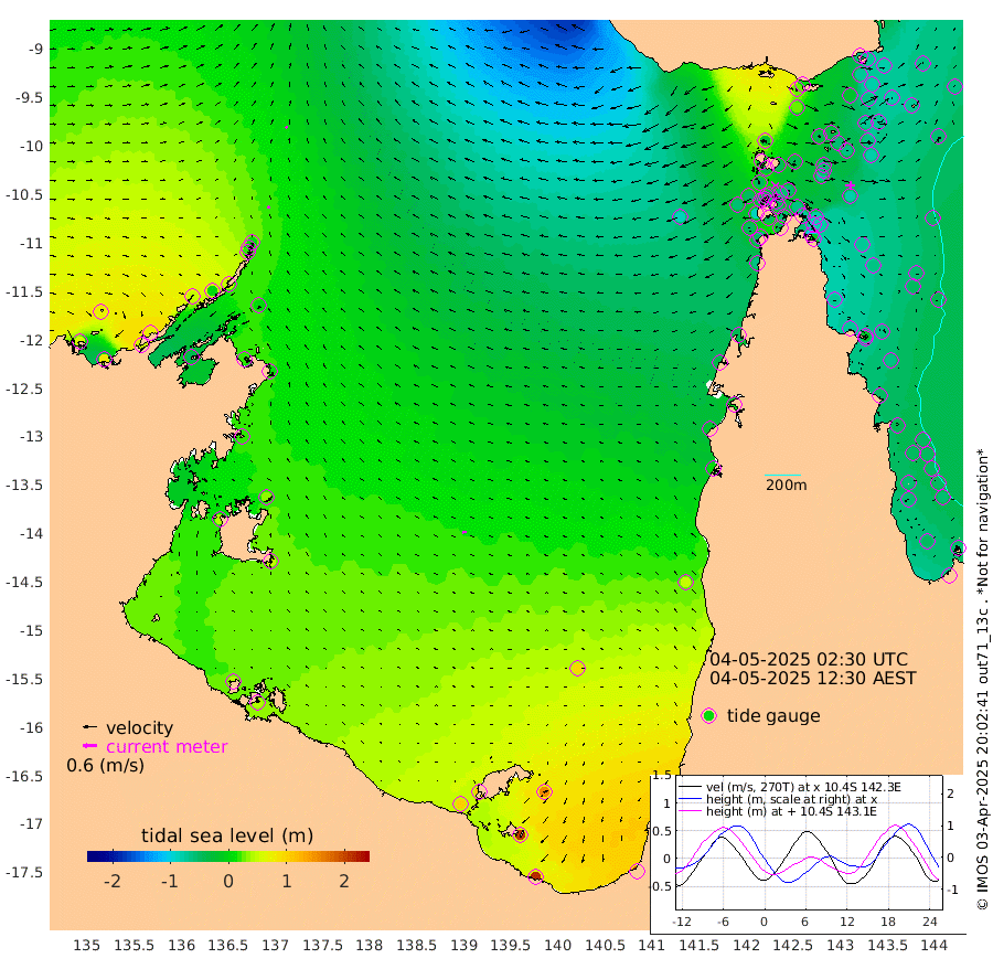 11cm/s -72T +3cm/s rms + 7cm/s -42T. ARA-GOC87 57m 18cm/s -90T +3cm/s rms + 2cm/s -2T. ARA-GOC87 60m 9cm/s -43T +2cm/s rms + 3cm/s 61T. ARA-GOC87 47m -67cm Daru -69cm Bobo Island -55cm Meer Island Barge -63cm Bramble Cay -75cm Unnamed Cay -67cm Pearce Cay -76cm Stephens Island -79cm Merrie England Shoals -73cm Mutacomal Reef -71cm Darnley Island Barge -62cm East Cay -70cm Yorke Island Barge -74cm Rennel Island -64cm Aureed Island -56cm Dungeness Reef -31cm Zagai Island -41cm Yam Island 23cm Dauan Island 9cm Saibai Island 29cm Phipi Reef -16cm Warrior Reef - West -17cm Mabuiag Island Barge -79cm Half Way Island -67cm Coconut Island -78cm Dugong Islet -55cm Poll Island -68cm Kirkcaldie Reef -39cm Suarji Island -58cm Sue Islet -51cm Hawkesbury Island -53cm Alert Patches -57cm Twin Island -21cm Badu Island -47cm St Pauls (Moa Island) -44cm Kubin (Moa Island) -46cm Ince Point -48cm Thursday Island -44cm Nardana Patches -36cm Turtle Head -50cm Round Island -39cm Goods Island -53cm Booby Island -51cm White Rocks Area -89cm Carpentaria -52cm Papou Point -85cm Bampfield Head -46cm Crab Island -52cm Red Wallis Island -45cm Packe Island -89cm Harrington Reef -63cm Herald Camp -9cm Sharp Point -41cm Red Island Point -56cm Possession Island -61cm Alpha Rock -69cm Frederick Point -78cm Wyborn Reef Light -75cm Tetley Island -46cm Triangle Reef -98cm Turtle Head Island -58cm Maclennan Cay -43cm Raine Island -73cm Mcsweeny Reef -66cm Collette Reef -50cm Shadwell Reef -72cm Hannibal Island -69cm Round Point -61cm Vrilya Point -69cm Cape Grenville -63cm Hicks Island -62cm Sir Charles Hardy Island -22cm Harvey Island -64cm Kay Reef -49cm Rocky Island -42cm Chapman Island -48cm Ham Reef -50cm Jubilee Reef -47cm Night Island -49cm Unnamed Reef No. 3 -53cm Morris Island -49cm 1st 3 Mile Opening -53cm Creech Reef -54cm Fife Island -51cm Eden Reef -59cm Stanley Island -64cm Normanby River 56cm Yabooma Island 79cm Hutchison River 73cm Elcho Island 75cm North West Crocodile Island 2cm Cape Wessel 45cm Stevens Island 7cm Guluwuru Island 46cm Hopeful Bay 16cm Auster Point 12cm Two Island Bay 50cm Cadell Strait -41cm Mallison Island 18cm Melville Bay (Gove Harbour) 6cm Truant Island 10cm Cape Arnhem 19cm Cape Grey 36cm Hawk Island 39cm Milner Bay (Groote Eylandt) 49cm Cape Beatrice 44cm West Island 43cm Centre Island 107cm Mornington Island 101cm West Wellesley Islands 151cm Bountiful Island 215cm Albert River Mouth 210cm Sweers Island 199cm Karumba 90cm Nassau River Offshore 48cm Christmas Creek 10cm Archer River -18cm Boyd Point -2cm Weipa (Humbug Point) -33cm Pennefather River -45cm Cullen Point