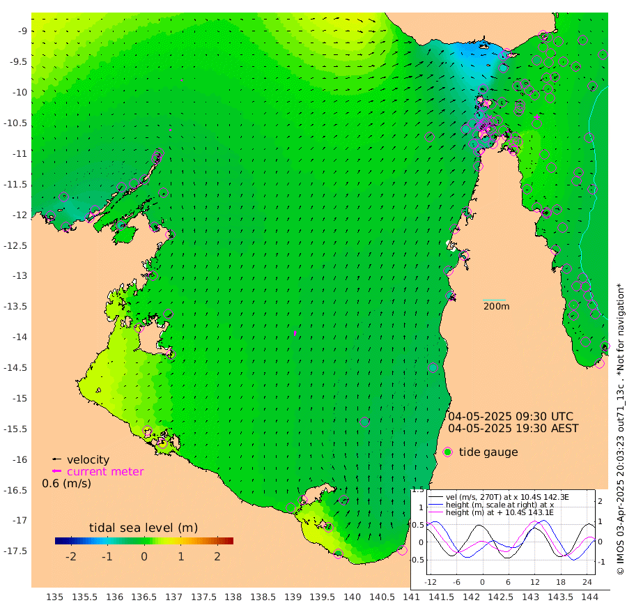 13cm/s -14T +3cm/s rms + 7cm/s -42T. ARA-GOC87 57m 35cm/s 10T +3cm/s rms + 2cm/s -2T. ARA-GOC87 60m 9cm/s 18T +2cm/s rms + 3cm/s 61T. ARA-GOC87 47m -3cm Daru 0cm Bobo Island -15cm Meer Island Barge -9cm Bramble Cay 1cm Unnamed Cay -9cm Pearce Cay 1cm Stephens Island 7cm Merrie England Shoals 3cm Mutacomal Reef -6cm Darnley Island Barge -13cm East Cay -4cm Yorke Island Barge 2cm Rennel Island -5cm Aureed Island -13cm Dungeness Reef -26cm Zagai Island -25cm Yam Island -92cm Dauan Island -78cm Saibai Island -85cm Phipi Reef -49cm Warrior Reef - West -51cm Mabuiag Island Barge 6cm Half Way Island 0cm Coconut Island 3cm Dugong Islet -10cm Poll Island -4cm Kirkcaldie Reef -15cm Suarji Island -11cm Sue Islet -79cm Hawkesbury Island -19cm Alert Patches -15cm Twin Island -85cm Badu Island -22cm St Pauls (Moa Island) -60cm Kubin (Moa Island) -32cm Ince Point -38cm Thursday Island -38cm Nardana Patches -60cm Turtle Head -49cm Round Island -76cm Goods Island -70cm Booby Island -60cm White Rocks Area -21cm Carpentaria -14cm Papou Point -43cm Bampfield Head -55cm Crab Island -67cm Red Wallis Island -69cm Packe Island 17cm Harrington Reef -67cm Herald Camp -2cm Sharp Point -50cm Red Island Point -18cm Possession Island -3cm Alpha Rock -4cm Frederick Point 7cm Wyborn Reef Light 4cm Tetley Island -22cm Triangle Reef 16cm Turtle Head Island -14cm Maclennan Cay -23cm Raine Island 1cm Mcsweeny Reef -4cm Collette Reef -17cm Shadwell Reef -2cm Hannibal Island -8cm Round Point -40cm Vrilya Point -3cm Cape Grenville -10cm Hicks Island -26cm Sir Charles Hardy Island 0cm Harvey Island -10cm Kay Reef -21cm Rocky Island -32cm Chapman Island -24cm Ham Reef -21cm Jubilee Reef -15cm Night Island -23cm Unnamed Reef No. 3 -18cm Morris Island -19cm 1st 3 Mile Opening -19cm Creech Reef -15cm Fife Island -28cm Eden Reef -14cm Stanley Island -11cm Normanby River -39cm Yabooma Island -52cm Hutchison River -35cm Elcho Island -35cm North West Crocodile Island -10cm Cape Wessel -25cm Stevens Island -30cm Guluwuru Island -27cm Hopeful Bay -12cm Auster Point -14cm Two Island Bay -58cm Cadell Strait -70cm Mallison Island -25cm Melville Bay (Gove Harbour) -21cm Truant Island -14cm Cape Arnhem 8cm Cape Grey 9cm Hawk Island 46cm Milner Bay (Groote Eylandt) 37cm Cape Beatrice 65cm West Island 68cm Centre Island 1cm Mornington Island 4cm West Wellesley Islands -27cm Bountiful Island -17cm Albert River Mouth 8cm Sweers Island -22cm Karumba -54cm Nassau River Offshore -73cm Christmas Creek -70cm Archer River -60cm Boyd Point -78cm Weipa (Humbug Point) -36cm Pennefather River -52cm Cullen Point
