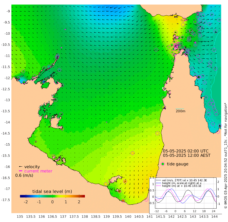 24cm/s -92T +3cm/s rms + 7cm/s -42T. ARA-GOC87 57m 16cm/s -115T +3cm/s rms + 2cm/s -2T. ARA-GOC87 60m 22cm/s -94T +2cm/s rms + 3cm/s 61T. ARA-GOC87 47m -56cm Daru -69cm Bobo Island -72cm Meer Island Barge -77cm Bramble Cay -76cm Unnamed Cay -69cm Pearce Cay -82cm Stephens Island -81cm Merrie England Shoals -63cm Mutacomal Reef -80cm Darnley Island Barge -80cm East Cay -70cm Yorke Island Barge -67cm Rennel Island -64cm Aureed Island -38cm Dungeness Reef -3cm Zagai Island -4cm Yam Island 68cm Dauan Island 50cm Saibai Island 75cm Phipi Reef 15cm Warrior Reef - West 39cm Mabuiag Island Barge -69cm Half Way Island -50cm Coconut Island -62cm Dugong Islet -26cm Poll Island -33cm Kirkcaldie Reef 1cm Suarji Island -28cm Sue Islet 29cm Hawkesbury Island 0cm Alert Patches -10cm Twin Island 52cm Badu Island 6cm St Pauls (Moa Island) 22cm Kubin (Moa Island) 12cm Ince Point 16cm Thursday Island 18cm Nardana Patches 29cm Turtle Head 17cm Round Island 32cm Goods Island 27cm Booby Island 22cm White Rocks Area -19cm Carpentaria -4cm Papou Point -13cm Bampfield Head 26cm Crab Island 24cm Red Wallis Island 23cm Packe Island -70cm Harrington Reef 13cm Herald Camp 8cm Sharp Point 23cm Red Island Point -2cm Possession Island -23cm Alpha Rock -34cm Frederick Point -65cm Wyborn Reef Light -57cm Tetley Island -55cm Triangle Reef -78cm Turtle Head Island -68cm Maclennan Cay -59cm Raine Island -74cm Mcsweeny Reef -72cm Collette Reef -62cm Shadwell Reef -81cm Hannibal Island -82cm Round Point 13cm Vrilya Point -80cm Cape Grenville -76cm Hicks Island -77cm Sir Charles Hardy Island -25cm Harvey Island -81cm Kay Reef -67cm Rocky Island -64cm Chapman Island -67cm Ham Reef -67cm Jubilee Reef -61cm Night Island -67cm Unnamed Reef No. 3 -71cm Morris Island -64cm 1st 3 Mile Opening -69cm Creech Reef -76cm Fife Island -80cm Eden Reef -77cm Stanley Island -88cm Normanby River -3cm Yabooma Island 5cm Hutchison River 9cm Elcho Island 18cm North West Crocodile Island -59cm Cape Wessel -22cm Stevens Island -61cm Guluwuru Island -18cm Hopeful Bay -41cm Auster Point -45cm Two Island Bay -25cm Cadell Strait -153cm Mallison Island -43cm Melville Bay (Gove Harbour) -58cm Truant Island -36cm Cape Arnhem -14cm Cape Grey 5cm Hawk Island 16cm Milner Bay (Groote Eylandt) 31cm Cape Beatrice 41cm West Island 41cm Centre Island 92cm Mornington Island 84cm West Wellesley Islands 126cm Bountiful Island 173cm Albert River Mouth 161cm Sweers Island 170cm Karumba 92cm Nassau River Offshore 65cm Christmas Creek 40cm Archer River 19cm Boyd Point 36cm Weipa (Humbug Point) 18cm Pennefather River 15cm Cullen Point
