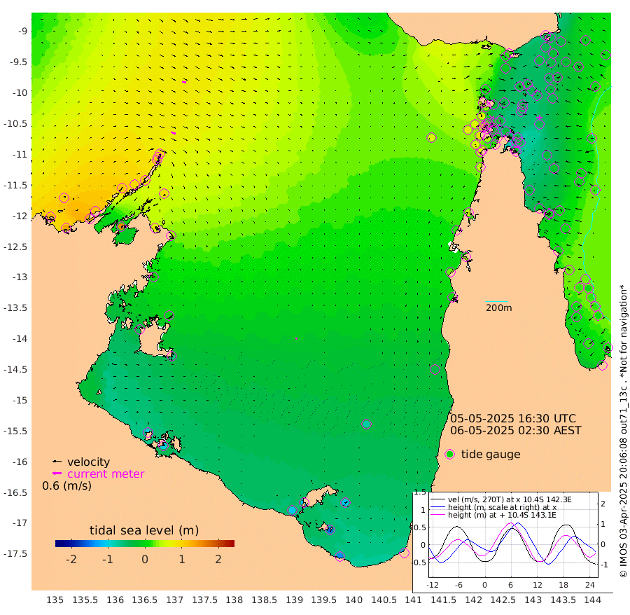 30cm/s 116T +3cm/s rms + 7cm/s -42T. ARA-GOC87 57m 9cm/s 139T +3cm/s rms + 2cm/s -2T. ARA-GOC87 60m 28cm/s 110T +2cm/s rms + 3cm/s 61T. ARA-GOC87 47m -42cm Daru -38cm Bobo Island 5cm Meer Island Barge -10cm Bramble Cay -28cm Unnamed Cay -32cm Pearce Cay -28cm Stephens Island -33cm Merrie England Shoals -41cm Mutacomal Reef -17cm Darnley Island Barge 1cm East Cay -27cm Yorke Island Barge -38cm Rennel Island -35cm Aureed Island -40cm Dungeness Reef -25cm Zagai Island -27cm Yam Island 13cm Dauan Island 18cm Saibai Island -15cm Phipi Reef -26cm Warrior Reef - West 14cm Mabuiag Island Barge -41cm Half Way Island -41cm Coconut Island -44cm Dugong Islet -38cm Poll Island -46cm Kirkcaldie Reef -39cm Suarji Island -30cm Sue Islet 68cm Hawkesbury Island -28cm Alert Patches -28cm Twin Island 54cm Badu Island -28cm St Pauls (Moa Island) 37cm Kubin (Moa Island) -8cm Ince Point 5cm Thursday Island 2cm Nardana Patches 24cm Turtle Head 48cm Round Island 59cm Goods Island 72cm Booby Island 62cm White Rocks Area 63cm Carpentaria -19cm Papou Point 92cm Bampfield Head 54cm Crab Island 63cm Red Wallis Island 42cm Packe Island -57cm Harrington Reef 73cm Herald Camp -18cm Sharp Point 17cm Red Island Point -2cm Possession Island -25cm Alpha Rock -38cm Frederick Point -35cm Wyborn Reef Light -34cm Tetley Island 6cm Triangle Reef -39cm Turtle Head Island 2cm Maclennan Cay 17cm Raine Island -29cm Mcsweeny Reef -20cm Collette Reef 4cm Shadwell Reef -23cm Hannibal Island -11cm Round Point 47cm Vrilya Point -10cm Cape Grenville -2cm Hicks Island 14cm Sir Charles Hardy Island -4cm Harvey Island 4cm Kay Reef 13cm Rocky Island 26cm Chapman Island 23cm Ham Reef 16cm Jubilee Reef 5cm Night Island 18cm Unnamed Reef No. 3 10cm Morris Island 16cm 1st 3 Mile Opening 12cm Creech Reef 4cm Fife Island 21cm Eden Reef 11cm Stanley Island 8cm Normanby River 124cm Yabooma Island 129cm Hutchison River 110cm Elcho Island 99cm North West Crocodile Island 100cm Cape Wessel 111cm Stevens Island 93cm Guluwuru Island 107cm Hopeful Bay 99cm Auster Point 103cm Two Island Bay 123cm Cadell Strait 157cm Mallison Island 79cm Melville Bay (Gove Harbour) 91cm Truant Island 52cm Cape Arnhem 11cm Cape Grey -7cm Hawk Island -43cm Milner Bay (Groote Eylandt) -60cm Cape Beatrice -105cm West Island -103cm Centre Island -115cm Mornington Island -112cm West Wellesley Islands -111cm Bountiful Island -139cm Albert River Mouth -150cm Sweers Island -142cm Karumba -77cm Nassau River Offshore -33cm Christmas Creek 11cm Archer River 30cm Boyd Point 37cm Weipa (Humbug Point) 19cm Pennefather River 52cm Cullen Point