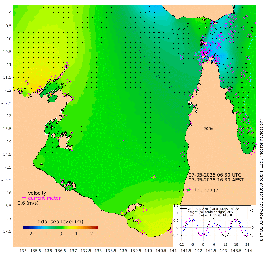 11cm/s 67T +3cm/s rms + 7cm/s -42T. ARA-GOC87 57m 13cm/s -45T +3cm/s rms + 2cm/s -2T. ARA-GOC87 60m 16cm/s 61T +2cm/s rms + 3cm/s 61T. ARA-GOC87 47m -86cm Daru -76cm Bobo Island -12cm Meer Island Barge -28cm Bramble Cay -63cm Unnamed Cay -64cm Pearce Cay -54cm Stephens Island -54cm Merrie England Shoals -86cm Mutacomal Reef -43cm Darnley Island Barge -15cm East Cay -66cm Yorke Island Barge -76cm Rennel Island -73cm Aureed Island -96cm Dungeness Reef -113cm Zagai Island -127cm Yam Island -108cm Dauan Island -102cm Saibai Island -104cm Phipi Reef -115cm Warrior Reef - West -108cm Mabuiag Island Barge -81cm Half Way Island -96cm Coconut Island -96cm Dugong Islet -113cm Poll Island -115cm Kirkcaldie Reef -132cm Suarji Island -106cm Sue Islet -107cm Hawkesbury Island -124cm Alert Patches -129cm Twin Island -97cm Badu Island -139cm St Pauls (Moa Island) -118cm Kubin (Moa Island) -123cm Ince Point -121cm Thursday Island -121cm Nardana Patches -106cm Turtle Head -113cm Round Island -92cm Goods Island -88cm Booby Island -91cm White Rocks Area -87cm Carpentaria -124cm Papou Point -109cm Bampfield Head -68cm Crab Island -93cm Red Wallis Island -111cm Packe Island -108cm Harrington Reef -121cm Herald Camp -41cm Sharp Point -93cm Red Island Point -119cm Possession Island -117cm Alpha Rock -119cm Frederick Point -95cm Wyborn Reef Light -103cm Tetley Island -25cm Triangle Reef -99cm Turtle Head Island -25cm Maclennan Cay 7cm Raine Island -57cm Mcsweeny Reef -42cm Collette Reef -12cm Shadwell Reef -42cm Hannibal Island -29cm Round Point -60cm Vrilya Point -28cm Cape Grenville -23cm Hicks Island -27cm Sir Charles Hardy Island -10cm Harvey Island -8cm Kay Reef 0cm Rocky Island 11cm Chapman Island 7cm Ham Reef 2cm Jubilee Reef -5cm Night Island 7cm Unnamed Reef No. 3 1cm Morris Island 0cm 1st 3 Mile Opening 0cm Creech Reef 7cm Fife Island 15cm Eden Reef 3cm Stanley Island 1cm Normanby River 54cm Yabooma Island 65cm Hutchison River 65cm Elcho Island 58cm North West Crocodile Island 32cm Cape Wessel 60cm Stevens Island 38cm Guluwuru Island 63cm Hopeful Bay 42cm Auster Point 32cm Two Island Bay 66cm Cadell Strait 103cm Mallison Island 38cm Melville Bay (Gove Harbour) 34cm Truant Island 27cm Cape Arnhem 29cm Cape Grey 30cm Hawk Island 33cm Milner Bay (Groote Eylandt) 34cm Cape Beatrice 22cm West Island 22cm Centre Island 54cm Mornington Island 57cm West Wellesley Islands 69cm Bountiful Island 114cm Albert River Mouth 128cm Sweers Island 100cm Karumba 33cm Nassau River Offshore 5cm Christmas Creek -4cm Archer River -30cm Boyd Point -23cm Weipa (Humbug Point) -25cm Pennefather River -60cm Cullen Point