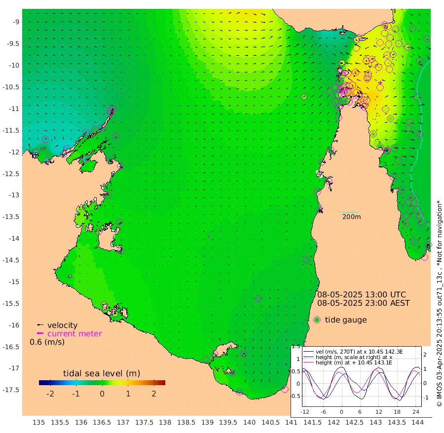 4cm/s 56T +3cm/s rms + 7cm/s -42T. ARA-GOC87 57m 15cm/s 24T +3cm/s rms + 2cm/s -2T. ARA-GOC87 60m 5cm/s 85T +2cm/s rms + 3cm/s 61T. ARA-GOC87 47m 64cm Daru 66cm Bobo Island 4cm Meer Island Barge 14cm Bramble Cay 41cm Unnamed Cay 50cm Pearce Cay 39cm Stephens Island 34cm Merrie England Shoals 57cm Mutacomal Reef 32cm Darnley Island Barge 4cm East Cay 51cm Yorke Island Barge 55cm Rennel Island 64cm Aureed Island 71cm Dungeness Reef 91cm Zagai Island 84cm Yam Island 57cm Dauan Island 59cm Saibai Island 66cm Phipi Reef 81cm Warrior Reef - West 56cm Mabuiag Island Barge 57cm Half Way Island 80cm Coconut Island 67cm Dugong Islet 82cm Poll Island 80cm Kirkcaldie Reef 106cm Suarji Island 77cm Sue Islet -3cm Hawkesbury Island 82cm Alert Patches 87cm Twin Island 20cm Badu Island 94cm St Pauls (Moa Island) 31cm Kubin (Moa Island) 68cm Ince Point 58cm Thursday Island 61cm Nardana Patches 36cm Turtle Head 27cm Round Island 7cm Goods Island -1cm Booby Island 8cm White Rocks Area 23cm Carpentaria 84cm Papou Point 22cm Bampfield Head -2cm Crab Island 1cm Red Wallis Island 17cm Packe Island 86cm Harrington Reef 5cm Herald Camp 31cm Sharp Point 32cm Red Island Point 69cm Possession Island 75cm Alpha Rock 84cm Frederick Point 67cm Wyborn Reef Light 72cm Tetley Island 11cm Triangle Reef 72cm Turtle Head Island 10cm Maclennan Cay -12cm Raine Island 41cm Mcsweeny Reef 29cm Collette Reef 2cm Shadwell Reef 29cm Hannibal Island 11cm Round Point -5cm Vrilya Point 11cm Cape Grenville 9cm Hicks Island 4cm Sir Charles Hardy Island 5cm Harvey Island -6cm Kay Reef -10cm Rocky Island -20cm Chapman Island -17cm Ham Reef -10cm Jubilee Reef -5cm Night Island -15cm Unnamed Reef No. 3 -10cm Morris Island -5cm 1st 3 Mile Opening -8cm Creech Reef -15cm Fife Island -21cm Eden Reef -14cm Stanley Island -14cm Normanby River -80cm Yabooma Island -72cm Hutchison River -70cm Elcho Island -71cm North West Crocodile Island -26cm Cape Wessel -64cm Stevens Island -13cm Guluwuru Island -70cm Hopeful Bay -37cm Auster Point -46cm Two Island Bay -68cm Cadell Strait -82cm Mallison Island -19cm Melville Bay (Gove Harbour) -15cm Truant Island -4cm Cape Arnhem 6cm Cape Grey 0cm Hawk Island 16cm Milner Bay (Groote Eylandt) 10cm Cape Beatrice 25cm West Island 32cm Centre Island -3cm Mornington Island -4cm West Wellesley Islands -21cm Bountiful Island -31cm Albert River Mouth -30cm Sweers Island -35cm Karumba -29cm Nassau River Offshore -28cm Christmas Creek -30cm Archer River -15cm Boyd Point -28cm Weipa (Humbug Point) -12cm Pennefather River -11cm Cullen Point