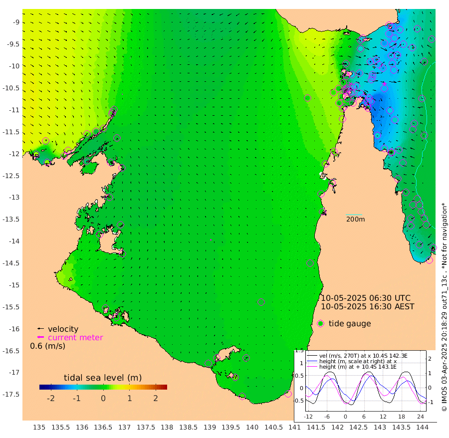 3cm/s -162T +3cm/s rms + 7cm/s -42T. ARA-GOC87 57m 11cm/s -21T +3cm/s rms + 2cm/s -2T. ARA-GOC87 60m 4cm/s 147T +2cm/s rms + 3cm/s 61T. ARA-GOC87 47m -122cm Daru -125cm Bobo Island -52cm Meer Island Barge -79cm Bramble Cay -106cm Unnamed Cay -112cm Pearce Cay -99cm Stephens Island -101cm Merrie England Shoals -125cm Mutacomal Reef -89cm Darnley Island Barge -62cm East Cay -105cm Yorke Island Barge -111cm Rennel Island -120cm Aureed Island -118cm Dungeness Reef -124cm Zagai Island -124cm Yam Island -88cm Dauan Island -92cm Saibai Island -94cm Phipi Reef -128cm Warrior Reef - West -67cm Mabuiag Island Barge -109cm Half Way Island -126cm Coconut Island -120cm Dugong Islet -123cm Poll Island -119cm Kirkcaldie Reef -130cm Suarji Island -114cm Sue Islet -4cm Hawkesbury Island -100cm Alert Patches -112cm Twin Island -21cm Badu Island -112cm St Pauls (Moa Island) -42cm Kubin (Moa Island) -82cm Ince Point -65cm Thursday Island -70cm Nardana Patches -44cm Turtle Head -26cm Round Island -7cm Goods Island 19cm Booby Island 1cm White Rocks Area 14cm Carpentaria -98cm Papou Point 5cm Bampfield Head 27cm Crab Island 5cm Red Wallis Island -35cm Packe Island -134cm Harrington Reef -9cm Herald Camp -34cm Sharp Point -36cm Red Island Point -70cm Possession Island -109cm Alpha Rock -121cm Frederick Point -126cm Wyborn Reef Light -127cm Tetley Island -61cm Triangle Reef -112cm Turtle Head Island -59cm Maclennan Cay -29cm Raine Island -99cm Mcsweeny Reef -87cm Collette Reef -51cm Shadwell Reef -93cm Hannibal Island -79cm Round Point 40cm Vrilya Point -71cm Cape Grenville -64cm Hicks Island -72cm Sir Charles Hardy Island -22cm Harvey Island -55cm Kay Reef -43cm Rocky Island -37cm Chapman Island -34cm Ham Reef -38cm Jubilee Reef -40cm Night Island -37cm Unnamed Reef No. 3 -43cm Morris Island -32cm 1st 3 Mile Opening -39cm Creech Reef -43cm Fife Island -39cm Eden Reef -38cm Stanley Island -48cm Normanby River 45cm Yabooma Island 32cm Hutchison River 42cm Elcho Island 41cm North West Crocodile Island -7cm Cape Wessel 26cm Stevens Island -28cm Guluwuru Island 33cm Hopeful Bay 16cm Auster Point 18cm Two Island Bay 18cm Cadell Strait -55cm Mallison Island -17cm Melville Bay (Gove Harbour) -20cm Truant Island -18cm Cape Arnhem -10cm Cape Grey -6cm Hawk Island 4cm Milner Bay (Groote Eylandt) 2cm Cape Beatrice 0cm West Island 4cm Centre Island -7cm Mornington Island -8cm West Wellesley Islands -13cm Bountiful Island 16cm Albert River Mouth 30cm Sweers Island 18cm Karumba -12cm Nassau River Offshore -15cm Christmas Creek 12cm Archer River 7cm Boyd Point 13cm Weipa (Humbug Point) 35cm Pennefather River 23cm Cullen Point