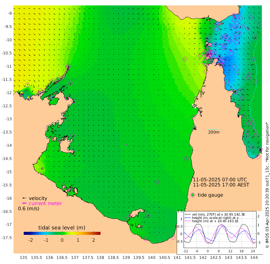 4cm/s -178T +3cm/s rms + 7cm/s -42T. ARA-GOC87 57m 13cm/s -9T +3cm/s rms + 2cm/s -2T. ARA-GOC87 60m 6cm/s 146T +2cm/s rms + 3cm/s 61T. ARA-GOC87 47m -117cm Daru -118cm Bobo Island -45cm Meer Island Barge -71cm Bramble Cay -98cm Unnamed Cay -104cm Pearce Cay -89cm Stephens Island -92cm Merrie England Shoals -119cm Mutacomal Reef -81cm Darnley Island Barge -53cm East Cay -99cm Yorke Island Barge -103cm Rennel Island -113cm Aureed Island -114cm Dungeness Reef -126cm Zagai Island -124cm Yam Island -102cm Dauan Island -107cm Saibai Island -108cm Phipi Reef -134cm Warrior Reef - West -73cm Mabuiag Island Barge -99cm Half Way Island -121cm Coconut Island -111cm Dugong Islet -119cm Poll Island -114cm Kirkcaldie Reef -129cm Suarji Island -114cm Sue Islet 1cm Hawkesbury Island -99cm Alert Patches -108cm Twin Island -23cm Badu Island -111cm St Pauls (Moa Island) -36cm Kubin (Moa Island) -80cm Ince Point -62cm Thursday Island -67cm Nardana Patches -41cm Turtle Head -18cm Round Island -1cm Goods Island 28cm Booby Island 11cm White Rocks Area 28cm Carpentaria -95cm Papou Point 21cm Bampfield Head 34cm Crab Island 13cm Red Wallis Island -27cm Packe Island -123cm Harrington Reef 2cm Herald Camp -36cm Sharp Point -35cm Red Island Point -64cm Possession Island -105cm Alpha Rock -115cm Frederick Point -118cm Wyborn Reef Light -121cm Tetley Island -56cm Triangle Reef -99cm Turtle Head Island -51cm Maclennan Cay -22cm Raine Island -91cm Mcsweeny Reef -80cm Collette Reef -45cm Shadwell Reef -86cm Hannibal Island -70cm Round Point 47cm Vrilya Point -61cm Cape Grenville -55cm Hicks Island -65cm Sir Charles Hardy Island -18cm Harvey Island -47cm Kay Reef -36cm Rocky Island -32cm Chapman Island -28cm Ham Reef -32cm Jubilee Reef -33cm Night Island -31cm Unnamed Reef No. 3 -34cm Morris Island -23cm 1st 3 Mile Opening -31cm Creech Reef -34cm Fife Island -31cm Eden Reef -29cm Stanley Island -38cm Normanby River 55cm Yabooma Island 41cm Hutchison River 51cm Elcho Island 49cm North West Crocodile Island 2cm Cape Wessel 34cm Stevens Island -26cm Guluwuru Island 39cm Hopeful Bay 25cm Auster Point 30cm Two Island Bay 23cm Cadell Strait -70cm Mallison Island -15cm Melville Bay (Gove Harbour) -15cm Truant Island -17cm Cape Arnhem -12cm Cape Grey -9cm Hawk Island 0cm Milner Bay (Groote Eylandt) -3cm Cape Beatrice -6cm West Island -2cm Centre Island -25cm Mornington Island -26cm West Wellesley Islands -39cm Bountiful Island -14cm Albert River Mouth 0cm Sweers Island -11cm Karumba -30cm Nassau River Offshore -28cm Christmas Creek 5cm Archer River 6cm Boyd Point 11cm Weipa (Humbug Point) 37cm Pennefather River 29cm Cullen Point