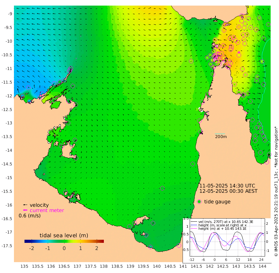 6cm/s 100T +3cm/s rms + 7cm/s -42T. ARA-GOC87 57m 11cm/s 130T +3cm/s rms + 2cm/s -2T. ARA-GOC87 60m 2cm/s 99T +2cm/s rms + 3cm/s 61T. ARA-GOC87 47m 72cm Daru 76cm Bobo Island 18cm Meer Island Barge 25cm Bramble Cay 48cm Unnamed Cay 64cm Pearce Cay 46cm Stephens Island 39cm Merrie England Shoals 65cm Mutacomal Reef 46cm Darnley Island Barge 19cm East Cay 64cm Yorke Island Barge 61cm Rennel Island 78cm Aureed Island 81cm Dungeness Reef 110cm Zagai Island 99cm Yam Island 103cm Dauan Island 110cm Saibai Island 106cm Phipi Reef 111cm Warrior Reef - West 86cm Mabuiag Island Barge 59cm Half Way Island 89cm Coconut Island 72cm Dugong Islet 92cm Poll Island 86cm Kirkcaldie Reef 119cm Suarji Island 95cm Sue Islet 33cm Hawkesbury Island 99cm Alert Patches 101cm Twin Island 54cm Badu Island 108cm St Pauls (Moa Island) 53cm Kubin (Moa Island) 86cm Ince Point 77cm Thursday Island 80cm Nardana Patches 61cm Turtle Head 48cm Round Island 35cm Goods Island 26cm Booby Island 28cm White Rocks Area 42cm Carpentaria 93cm Papou Point 45cm Bampfield Head 20cm Crab Island 29cm Red Wallis Island 44cm Packe Island 86cm Harrington Reef 37cm Herald Camp 35cm Sharp Point 58cm Red Island Point 83cm Possession Island 86cm Alpha Rock 94cm Frederick Point 74cm Wyborn Reef Light 80cm Tetley Island 31cm Triangle Reef 71cm Turtle Head Island 23cm Maclennan Cay 3cm Raine Island 51cm Mcsweeny Reef 43cm Collette Reef 19cm Shadwell Reef 41cm Hannibal Island 24cm Round Point 16cm Vrilya Point 22cm Cape Grenville 21cm Hicks Island 26cm Sir Charles Hardy Island 8cm Harvey Island 10cm Kay Reef 8cm Rocky Island 8cm Chapman Island 7cm Ham Reef 7cm Jubilee Reef 9cm Night Island 7cm Unnamed Reef No. 3 5cm Morris Island 7cm 1st 3 Mile Opening 9cm Creech Reef 3cm Fife Island -1cm Eden Reef 1cm Stanley Island -1cm Normanby River -127cm Yabooma Island -125cm Hutchison River -122cm Elcho Island -122cm North West Crocodile Island -44cm Cape Wessel -102cm Stevens Island -16cm Guluwuru Island -98cm Hopeful Bay -65cm Auster Point -76cm Two Island Bay -90cm Cadell Strait 6cm Mallison Island -27cm Melville Bay (Gove Harbour) -22cm Truant Island -6cm Cape Arnhem -5cm Cape Grey -10cm Hawk Island -14cm Milner Bay (Groote Eylandt) -18cm Cape Beatrice -9cm West Island -1cm Centre Island -11cm Mornington Island -11cm West Wellesley Islands -26cm Bountiful Island -65cm Albert River Mouth -64cm Sweers Island -57cm Karumba -10cm Nassau River Offshore 8cm Christmas Creek 9cm Archer River 20cm Boyd Point 9cm Weipa (Humbug Point) 10cm Pennefather River 18cm Cullen Point