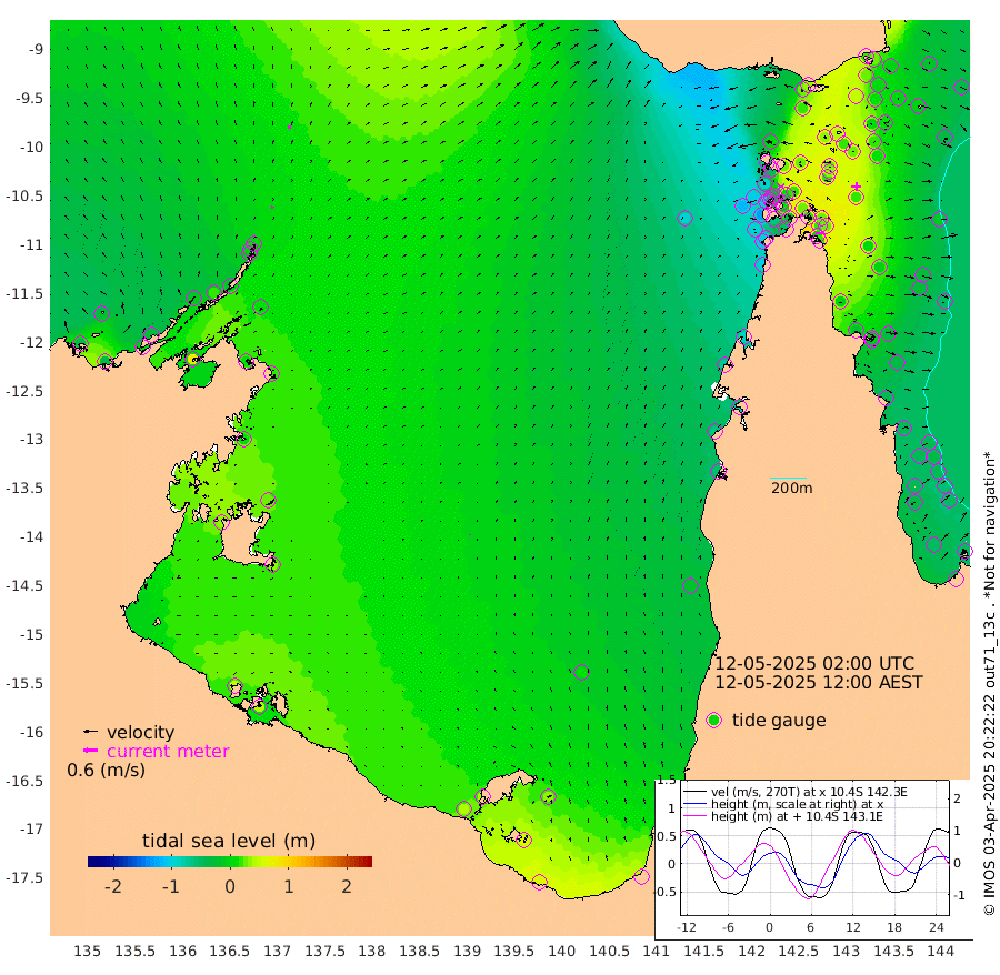 11cm/s 17T +3cm/s rms + 7cm/s -42T. ARA-GOC87 57m 2cm/s -41T +3cm/s rms + 2cm/s -2T. ARA-GOC87 60m 13cm/s 11T +2cm/s rms + 3cm/s 61T. ARA-GOC87 47m 21cm Daru 24cm Bobo Island -31cm Meer Island Barge -15cm Bramble Cay 1cm Unnamed Cay 10cm Pearce Cay -5cm Stephens Island -1cm Merrie England Shoals 24cm Mutacomal Reef -7cm Darnley Island Barge -32cm East Cay 9cm Yorke Island Barge 7cm Rennel Island 21cm Aureed Island 17cm Dungeness Reef 45cm Zagai Island 37cm Yam Island 29cm Dauan Island 35cm Saibai Island 18cm Phipi Reef 47cm Warrior Reef - West 2cm Mabuiag Island Barge 10cm Half Way Island 23cm Coconut Island 17cm Dugong Islet 32cm Poll Island 17cm Kirkcaldie Reef 29cm Suarji Island 28cm Sue Islet -91cm Hawkesbury Island 5cm Alert Patches 18cm Twin Island -71cm Badu Island 25cm St Pauls (Moa Island) -50cm Kubin (Moa Island) -6cm Ince Point -24cm Thursday Island -18cm Nardana Patches -53cm Turtle Head -73cm Round Island -94cm Goods Island -117cm Booby Island -103cm White Rocks Area -92cm Carpentaria 13cm Papou Point -134cm Bampfield Head -103cm Crab Island -94cm Red Wallis Island -61cm Packe Island 22cm Harrington Reef -103cm Herald Camp 19cm Sharp Point -53cm Red Island Point -26cm Possession Island 29cm Alpha Rock 22cm Frederick Point 25cm Wyborn Reef Light 29cm Tetley Island -15cm Triangle Reef 0cm Turtle Head Island -29cm Maclennan Cay -48cm Raine Island 1cm Mcsweeny Reef -7cm Collette Reef -29cm Shadwell Reef -7cm Hannibal Island -19cm Round Point -99cm Vrilya Point -24cm Cape Grenville -31cm Hicks Island -31cm Sir Charles Hardy Island -8cm Harvey Island -36cm Kay Reef -42cm Rocky Island -44cm Chapman Island -44cm Ham Reef -43cm Jubilee Reef -32cm Night Island -42cm Unnamed Reef No. 3 -44cm Morris Island -54cm 1st 3 Mile Opening -45cm Creech Reef -36cm Fife Island -51cm Eden Reef -48cm Stanley Island -43cm Normanby River -42cm Yabooma Island -35cm Hutchison River -27cm Elcho Island -23cm North West Crocodile Island 9cm Cape Wessel -8cm Stevens Island 19cm Guluwuru Island -17cm Hopeful Bay -12cm Auster Point -4cm Two Island Bay -3cm Cadell Strait 82cm Mallison Island 14cm Melville Bay (Gove Harbour) 14cm Truant Island 17cm Cape Arnhem 11cm Cape Grey 26cm Hawk Island 32cm Milner Bay (Groote Eylandt) 35cm Cape Beatrice 45cm West Island 41cm Centre Island 43cm Mornington Island 43cm West Wellesley Islands 34cm Bountiful Island 64cm Albert River Mouth 63cm Sweers Island 49cm Karumba 15cm Nassau River Offshore -18cm Christmas Creek -58cm Archer River -62cm Boyd Point -76cm Weipa (Humbug Point) -72cm Pennefather River -83cm Cullen Point