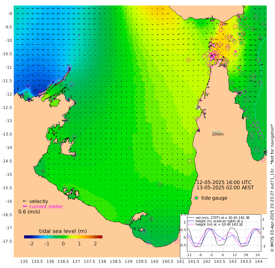 9cm/s -87T +3cm/s rms + 7cm/s -42T. ARA-GOC87 57m 16cm/s 149T +3cm/s rms + 2cm/s -2T. ARA-GOC87 60m 14cm/s -95T +2cm/s rms + 3cm/s 61T. ARA-GOC87 47m 28cm Daru 26cm Bobo Island -4cm Meer Island Barge -9cm Bramble Cay 7cm Unnamed Cay 18cm Pearce Cay 6cm Stephens Island -5cm Merrie England Shoals 19cm Mutacomal Reef 12cm Darnley Island Barge -6cm East Cay 26cm Yorke Island Barge 19cm Rennel Island 36cm Aureed Island 43cm Dungeness Reef 76cm Zagai Island 70cm Yam Island 100cm Dauan Island 106cm Saibai Island 92cm Phipi Reef 82cm Warrior Reef - West 85cm Mabuiag Island Barge 19cm Half Way Island 43cm Coconut Island 33cm Dugong Islet 56cm Poll Island 51cm Kirkcaldie Reef 89cm Suarji Island 64cm Sue Islet 55cm Hawkesbury Island 77cm Alert Patches 75cm Twin Island 65cm Badu Island 84cm St Pauls (Moa Island) 59cm Kubin (Moa Island) 74cm Ince Point 74cm Thursday Island 74cm Nardana Patches 67cm Turtle Head 58cm Round Island 55cm Goods Island 59cm Booby Island 52cm White Rocks Area 74cm Carpentaria 70cm Papou Point 70cm Bampfield Head 47cm Crab Island 58cm Red Wallis Island 57cm Packe Island 38cm Harrington Reef 69cm Herald Camp 30cm Sharp Point 62cm Red Island Point 70cm Possession Island 60cm Alpha Rock 58cm Frederick Point 26cm Wyborn Reef Light 34cm Tetley Island 11cm Triangle Reef 22cm Turtle Head Island 4cm Maclennan Cay -9cm Raine Island 13cm Mcsweeny Reef 9cm Collette Reef 0cm Shadwell Reef 2cm Hannibal Island -11cm Round Point 47cm Vrilya Point -5cm Cape Grenville -4cm Hicks Island 7cm Sir Charles Hardy Island 0cm Harvey Island -12cm Kay Reef -7cm Rocky Island -4cm Chapman Island -3cm Ham Reef -7cm Jubilee Reef -6cm Night Island -4cm Unnamed Reef No. 3 -12cm Morris Island -6cm 1st 3 Mile Opening -5cm Creech Reef -13cm Fife Island -19cm Eden Reef -14cm Stanley Island -21cm Normanby River -171cm Yabooma Island -193cm Hutchison River -176cm Elcho Island -172cm North West Crocodile Island -89cm Cape Wessel -158cm Stevens Island -71cm Guluwuru Island -142cm Hopeful Bay -110cm Auster Point -120cm Two Island Bay -152cm Cadell Strait -44cm Mallison Island -73cm Melville Bay (Gove Harbour) -71cm Truant Island -40cm Cape Arnhem -30cm Cape Grey -30cm Hawk Island -23cm Milner Bay (Groote Eylandt) -23cm Cape Beatrice 2cm West Island 9cm Centre Island -2cm Mornington Island 2cm West Wellesley Islands -10cm Bountiful Island -61cm Albert River Mouth -60cm Sweers Island -49cm Karumba 11cm Nassau River Offshore 33cm Christmas Creek 34cm Archer River 46cm Boyd Point 40cm Weipa (Humbug Point) 31cm Pennefather River 52cm Cullen Point