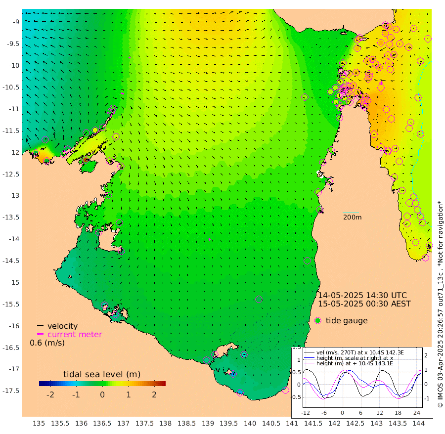 27cm/s 110T +3cm/s rms + 7cm/s -42T. ARA-GOC87 57m 20cm/s 155T +3cm/s rms + 2cm/s -2T. ARA-GOC87 60m 18cm/s 100T +2cm/s rms + 3cm/s 61T. ARA-GOC87 47m 117cm Daru 114cm Bobo Island 60cm Meer Island Barge 81cm Bramble Cay 105cm Unnamed Cay 103cm Pearce Cay 91cm Stephens Island 101cm Merrie England Shoals 119cm Mutacomal Reef 91cm Darnley Island Barge 63cm East Cay 104cm Yorke Island Barge 102cm Rennel Island 107cm Aureed Island 110cm Dungeness Reef 124cm Zagai Island 115cm Yam Island 115cm Dauan Island 118cm Saibai Island 119cm Phipi Reef 127cm Warrior Reef - West 94cm Mabuiag Island Barge 96cm Half Way Island 121cm Coconut Island 104cm Dugong Islet 114cm Poll Island 109cm Kirkcaldie Reef 118cm Suarji Island 117cm Sue Islet 70cm Hawkesbury Island 114cm Alert Patches 114cm Twin Island 79cm Badu Island 115cm St Pauls (Moa Island) 79cm Kubin (Moa Island) 98cm Ince Point 88cm Thursday Island 91cm Nardana Patches 80cm Turtle Head 81cm Round Island 59cm Goods Island 44cm Booby Island 43cm White Rocks Area 37cm Carpentaria 100cm Papou Point 81cm Bampfield Head 34cm Crab Island 45cm Red Wallis Island 73cm Packe Island 114cm Harrington Reef 69cm Herald Camp 32cm Sharp Point 66cm Red Island Point 98cm Possession Island 110cm Alpha Rock 116cm Frederick Point 126cm Wyborn Reef Light 128cm Tetley Island 70cm Triangle Reef 118cm Turtle Head Island 58cm Maclennan Cay 42cm Raine Island 96cm Mcsweeny Reef 92cm Collette Reef 66cm Shadwell Reef 97cm Hannibal Island 83cm Round Point 25cm Vrilya Point 72cm Cape Grenville 66cm Hicks Island 74cm Sir Charles Hardy Island 21cm Harvey Island 63cm Kay Reef 51cm Rocky Island 52cm Chapman Island 47cm Ham Reef 49cm Jubilee Reef 47cm Night Island 47cm Unnamed Reef No. 3 50cm Morris Island 46cm 1st 3 Mile Opening 48cm Creech Reef 45cm Fife Island 51cm Eden Reef 49cm Stanley Island 48cm Normanby River -34cm Yabooma Island -19cm Hutchison River -34cm Elcho Island -44cm North West Crocodile Island 22cm Cape Wessel -2cm Stevens Island 62cm Guluwuru Island -6cm Hopeful Bay 10cm Auster Point 2cm Two Island Bay 13cm Cadell Strait 197cm Mallison Island 44cm Melville Bay (Gove Harbour) 54cm Truant Island 39cm Cape Arnhem 8cm Cape Grey 2cm Hawk Island -41cm Milner Bay (Groote Eylandt) -50cm Cape Beatrice -80cm West Island -73cm Centre Island -62cm Mornington Island -66cm West Wellesley Islands -86cm Bountiful Island -127cm Albert River Mouth -131cm Sweers Island -117cm Karumba -37cm Nassau River Offshore 2cm Christmas Creek 18cm Archer River 30cm Boyd Point 23cm Weipa (Humbug Point) 23cm Pennefather River 30cm Cullen Point