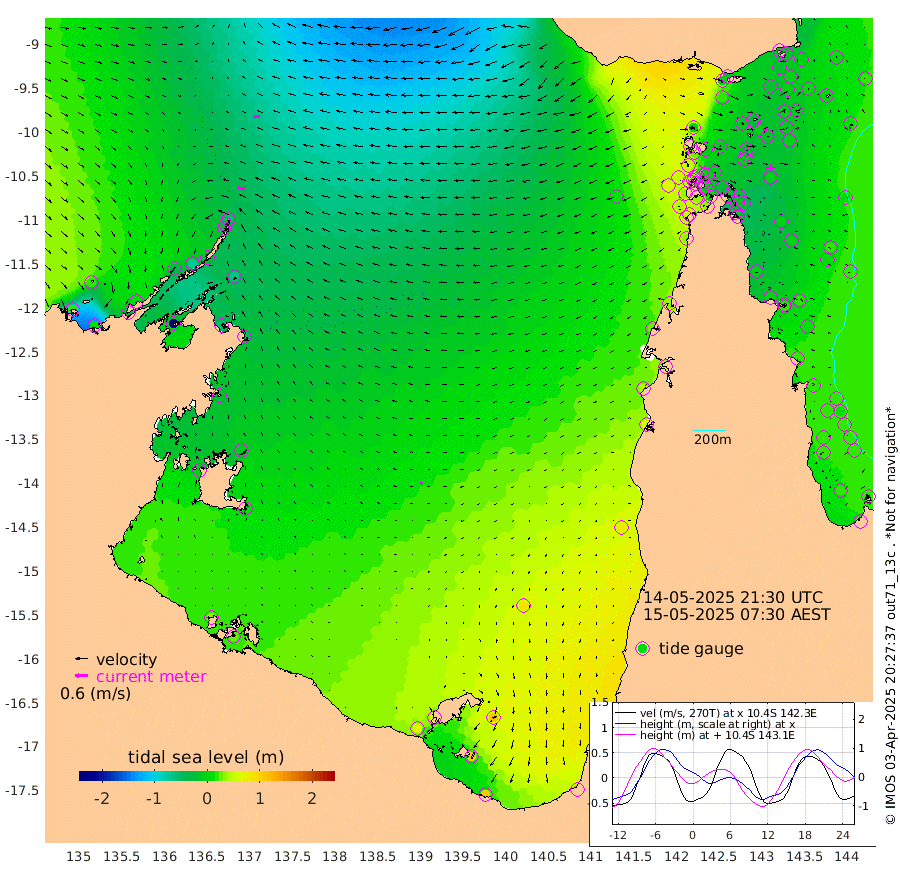 35cm/s -88T +3cm/s rms + 7cm/s -42T. ARA-GOC87 57m 14cm/s -132T +3cm/s rms + 2cm/s -2T. ARA-GOC87 60m 33cm/s -96T +2cm/s rms + 3cm/s 61T. ARA-GOC87 47m -13cm Daru -18cm Bobo Island 10cm Meer Island Barge 3cm Bramble Cay -6cm Unnamed Cay -6cm Pearce Cay 1cm Stephens Island -7cm Merrie England Shoals -17cm Mutacomal Reef -4cm Darnley Island Barge 16cm East Cay -12cm Yorke Island Barge -5cm Rennel Island -13cm Aureed Island -3cm Dungeness Reef -29cm Zagai Island -12cm Yam Island -5cm Dauan Island -19cm Saibai Island 17cm Phipi Reef -16cm Warrior Reef - West -3cm Mabuiag Island Barge -5cm Half Way Island -20cm Coconut Island -6cm Dugong Islet -16cm Poll Island -3cm Kirkcaldie Reef -8cm Suarji Island -21cm Sue Islet 49cm Hawkesbury Island -5cm Alert Patches -12cm Twin Island 35cm Badu Island -13cm St Pauls (Moa Island) 29cm Kubin (Moa Island) 3cm Ince Point 12cm Thursday Island 9cm Nardana Patches 32cm Turtle Head 34cm Round Island 50cm Goods Island 53cm Booby Island 51cm White Rocks Area 12cm Carpentaria -9cm Papou Point 37cm Bampfield Head 43cm Crab Island 44cm Red Wallis Island 37cm Packe Island -12cm Harrington Reef 60cm Herald Camp -8cm Sharp Point 37cm Red Island Point 10cm Possession Island -25cm Alpha Rock -14cm Frederick Point -27cm Wyborn Reef Light -30cm Tetley Island 1cm Triangle Reef -15cm Turtle Head Island 16cm Maclennan Cay 20cm Raine Island -7cm Mcsweeny Reef -5cm Collette Reef 7cm Shadwell Reef -5cm Hannibal Island 5cm Round Point 31cm Vrilya Point 9cm Cape Grenville 16cm Hicks Island 16cm Sir Charles Hardy Island 4cm Harvey Island 13cm Kay Reef 21cm Rocky Island 17cm Chapman Island 17cm Ham Reef 17cm Jubilee Reef 15cm Night Island 16cm Unnamed Reef No. 3 21cm Morris Island 22cm 1st 3 Mile Opening 20cm Creech Reef 17cm Fife Island 22cm Eden Reef 20cm Stanley Island 24cm Normanby River 17cm Yabooma Island 8cm Hutchison River 6cm Elcho Island 17cm North West Crocodile Island -55cm Cape Wessel -31cm Stevens Island -74cm Guluwuru Island -17cm Hopeful Bay -35cm Auster Point -33cm Two Island Bay -33cm Cadell Strait -218cm Mallison Island -54cm Melville Bay (Gove Harbour) -67cm Truant Island -49cm Cape Arnhem -20cm Cape Grey -14cm Hawk Island -2cm Milner Bay (Groote Eylandt) 14cm Cape Beatrice 33cm West Island 28cm Centre Island 69cm Mornington Island 65cm West Wellesley Islands 118cm Bountiful Island 109cm Albert River Mouth 106cm Sweers Island 125cm Karumba 88cm Nassau River Offshore 77cm Christmas Creek 57cm Archer River 39cm Boyd Point 60cm Weipa (Humbug Point) 24cm Pennefather River 36cm Cullen Point