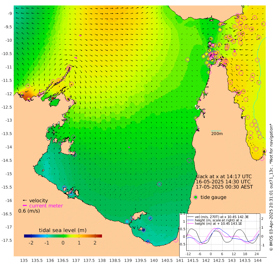 41cm/s 113T +3cm/s rms + 7cm/s -42T. ARA-GOC87 57m 19cm/s 156T +3cm/s rms + 2cm/s -2T. ARA-GOC87 60m 32cm/s 106T +2cm/s rms + 3cm/s 61T. ARA-GOC87 47m 105cm Daru 101cm Bobo Island 73cm Meer Island Barge 88cm Bramble Cay 104cm Unnamed Cay 98cm Pearce Cay 94cm Stephens Island 100cm Merrie England Shoals 105cm Mutacomal Reef 93cm Darnley Island Barge 72cm East Cay 98cm Yorke Island Barge 97cm Rennel Island 93cm Aureed Island 99cm Dungeness Reef 98cm Zagai Island 95cm Yam Island 92cm Dauan Island 83cm Saibai Island 88cm Phipi Reef 98cm Warrior Reef - West 71cm Mabuiag Island Barge 95cm Half Way Island 101cm Coconut Island 98cm Dugong Islet 96cm Poll Island 95cm Kirkcaldie Reef 85cm Suarji Island 93cm Sue Islet 82cm Hawkesbury Island 89cm Alert Patches 91cm Twin Island 84cm Badu Island 91cm St Pauls (Moa Island) 87cm Kubin (Moa Island) 82cm Ince Point 79cm Thursday Island 80cm Nardana Patches 80cm Turtle Head 84cm Round Island 76cm Goods Island 65cm Booby Island 62cm White Rocks Area 47cm Carpentaria 82cm Papou Point 94cm Bampfield Head 52cm Crab Island 61cm Red Wallis Island 80cm Packe Island 98cm Harrington Reef 81cm Herald Camp 18cm Sharp Point 58cm Red Island Point 82cm Possession Island 87cm Alpha Rock 95cm Frederick Point 111cm Wyborn Reef Light 110cm Tetley Island 71cm Triangle Reef 117cm Turtle Head Island 69cm Maclennan Cay 59cm Raine Island 93cm Mcsweeny Reef 89cm Collette Reef 73cm Shadwell Reef 97cm Hannibal Island 88cm Round Point 41cm Vrilya Point 78cm Cape Grenville 77cm Hicks Island 84cm Sir Charles Hardy Island 24cm Harvey Island 71cm Kay Reef 63cm Rocky Island 60cm Chapman Island 57cm Ham Reef 64cm Jubilee Reef 58cm Night Island 56cm Unnamed Reef No. 3 64cm Morris Island 67cm 1st 3 Mile Opening 63cm Creech Reef 56cm Fife Island 73cm Eden Reef 66cm Stanley Island 66cm Normanby River 65cm Yabooma Island 90cm Hutchison River 60cm Elcho Island 47cm North West Crocodile Island 76cm Cape Wessel 79cm Stevens Island 115cm Guluwuru Island 62cm Hopeful Bay 73cm Auster Point 76cm Two Island Bay 106cm Cadell Strait 211cm Mallison Island 88cm Melville Bay (Gove Harbour) 101cm Truant Island 65cm Cape Arnhem 19cm Cape Grey 0cm Hawk Island -51cm Milner Bay (Groote Eylandt) -63cm Cape Beatrice -114cm West Island -110cm Centre Island -103cm Mornington Island -104cm West Wellesley Islands -126cm Bountiful Island -153cm Albert River Mouth -175cm Sweers Island -154cm Karumba -66cm Nassau River Offshore -17cm Christmas Creek 13cm Archer River 31cm Boyd Point 29cm Weipa (Humbug Point) 29cm Pennefather River 39cm Cullen Point