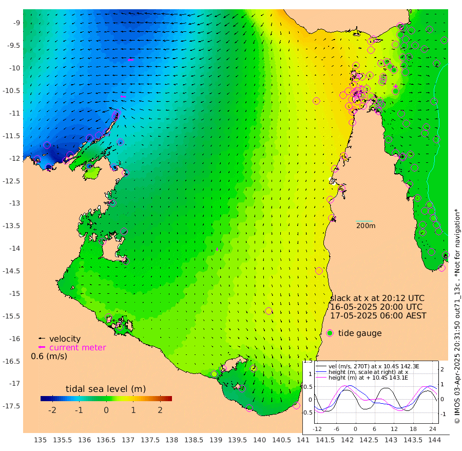 46cm/s -87T +3cm/s rms + 7cm/s -42T. ARA-GOC87 57m 25cm/s 178T +3cm/s rms + 2cm/s -2T. ARA-GOC87 60m 52cm/s -95T +2cm/s rms + 3cm/s 61T. ARA-GOC87 47m 8cm Daru -2cm Bobo Island 1cm Meer Island Barge -2cm Bramble Cay 2cm Unnamed Cay 0cm Pearce Cay 2cm Stephens Island 2cm Merrie England Shoals 10cm Mutacomal Reef 1cm Darnley Island Barge 9cm East Cay 3cm Yorke Island Barge 10cm Rennel Island 9cm Aureed Island 18cm Dungeness Reef 18cm Zagai Island 31cm Yam Island 53cm Dauan Island 49cm Saibai Island 55cm Phipi Reef 35cm Warrior Reef - West 54cm Mabuiag Island Barge 7cm Half Way Island 13cm Coconut Island 15cm Dugong Islet 23cm Poll Island 28cm Kirkcaldie Reef 46cm Suarji Island 23cm Sue Islet 92cm Hawkesbury Island 52cm Alert Patches 44cm Twin Island 75cm Badu Island 45cm St Pauls (Moa Island) 74cm Kubin (Moa Island) 59cm Ince Point 68cm Thursday Island 65cm Nardana Patches 80cm Turtle Head 84cm Round Island 90cm Goods Island 102cm Booby Island 94cm White Rocks Area 91cm Carpentaria 34cm Papou Point 104cm Bampfield Head 86cm Crab Island 103cm Red Wallis Island 96cm Packe Island 16cm Harrington Reef 120cm Herald Camp 15cm Sharp Point 73cm Red Island Point 59cm Possession Island 35cm Alpha Rock 32cm Frederick Point 6cm Wyborn Reef Light 10cm Tetley Island 12cm Triangle Reef -2cm Turtle Head Island 13cm Maclennan Cay 9cm Raine Island 7cm Mcsweeny Reef 7cm Collette Reef 8cm Shadwell Reef 1cm Hannibal Island 4cm Round Point 84cm Vrilya Point 11cm Cape Grenville 8cm Hicks Island 18cm Sir Charles Hardy Island 4cm Harvey Island 11cm Kay Reef 12cm Rocky Island 17cm Chapman Island 15cm Ham Reef 8cm Jubilee Reef 13cm Night Island 17cm Unnamed Reef No. 3 9cm Morris Island 8cm 1st 3 Mile Opening 12cm Creech Reef 16cm Fife Island 2cm Eden Reef 11cm Stanley Island 6cm Normanby River -167cm Yabooma Island -209cm Hutchison River -181cm Elcho Island -169cm North West Crocodile Island -140cm Cape Wessel -179cm Stevens Island -155cm Guluwuru Island -148cm Hopeful Bay -148cm Auster Point -153cm Two Island Bay -202cm Cadell Strait -152cm Mallison Island -132cm Melville Bay (Gove Harbour) -140cm Truant Island -92cm Cape Arnhem -69cm Cape Grey -48cm Hawk Island -35cm Milner Bay (Groote Eylandt) -18cm Cape Beatrice 22cm West Island 23cm Centre Island 43cm Mornington Island 42cm West Wellesley Islands 49cm Bountiful Island -1cm Albert River Mouth -2cm Sweers Island 29cm Karumba 78cm Nassau River Offshore 94cm Christmas Creek 84cm Archer River 81cm Boyd Point 90cm Weipa (Humbug Point) 64cm Pennefather River 94cm Cullen Point