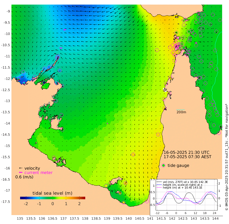 48cm/s -88T +3cm/s rms + 7cm/s -42T. ARA-GOC87 57m 19cm/s -156T +3cm/s rms + 2cm/s -2T. ARA-GOC87 60m 49cm/s -96T +2cm/s rms + 3cm/s 61T. ARA-GOC87 47m -11cm Daru -17cm Bobo Island -5cm Meer Island Barge -11cm Bramble Cay -14cm Unnamed Cay -9cm Pearce Cay -9cm Stephens Island -15cm Merrie England Shoals -13cm Mutacomal Reef -14cm Darnley Island Barge 3cm East Cay -15cm Yorke Island Barge -5cm Rennel Island -8cm Aureed Island 4cm Dungeness Reef -7cm Zagai Island 9cm Yam Island 27cm Dauan Island 14cm Saibai Island 45cm Phipi Reef 11cm Warrior Reef - West 28cm Mabuiag Island Barge -7cm Half Way Island -7cm Coconut Island -3cm Dugong Islet 2cm Poll Island 9cm Kirkcaldie Reef 24cm Suarji Island -5cm Sue Islet 79cm Hawkesbury Island 27cm Alert Patches 19cm Twin Island 63cm Badu Island 20cm St Pauls (Moa Island) 61cm Kubin (Moa Island) 36cm Ince Point 46cm Thursday Island 43cm Nardana Patches 64cm Turtle Head 70cm Round Island 80cm Goods Island 88cm Booby Island 83cm White Rocks Area 55cm Carpentaria 15cm Papou Point 80cm Bampfield Head 73cm Crab Island 85cm Red Wallis Island 80cm Packe Island -3cm Harrington Reef 103cm Herald Camp 5cm Sharp Point 63cm Red Island Point 42cm Possession Island 3cm Alpha Rock 8cm Frederick Point -19cm Wyborn Reef Light -17cm Tetley Island 0cm Triangle Reef -18cm Turtle Head Island 6cm Maclennan Cay 5cm Raine Island -10cm Mcsweeny Reef -10cm Collette Reef -4cm Shadwell Reef -14cm Hannibal Island -6cm Round Point 63cm Vrilya Point 0cm Cape Grenville 2cm Hicks Island 5cm Sir Charles Hardy Island 1cm Harvey Island 0cm Kay Reef 7cm Rocky Island 7cm Chapman Island 6cm Ham Reef 1cm Jubilee Reef 7cm Night Island 8cm Unnamed Reef No. 3 5cm Morris Island 4cm 1st 3 Mile Opening 6cm Creech Reef 7cm Fife Island 0cm Eden Reef 4cm Stanley Island 3cm Normanby River -77cm Yabooma Island -101cm Hutchison River -87cm Elcho Island -73cm North West Crocodile Island -110cm Cape Wessel -113cm Stevens Island -138cm Guluwuru Island -88cm Hopeful Bay -101cm Auster Point -102cm Two Island Bay -130cm Cadell Strait -252cm Mallison Island -109cm Melville Bay (Gove Harbour) -122cm Truant Island -83cm Cape Arnhem -54cm Cape Grey -31cm Hawk Island -17cm Milner Bay (Groote Eylandt) 3cm Cape Beatrice 36cm West Island 36cm Centre Island 73cm Mornington Island 65cm West Wellesley Islands 101cm Bountiful Island 78cm Albert River Mouth 77cm Sweers Island 105cm Karumba 99cm Nassau River Offshore 96cm Christmas Creek 78cm Archer River 64cm Boyd Point 82cm Weipa (Humbug Point) 49cm Pennefather River 73cm Cullen Point