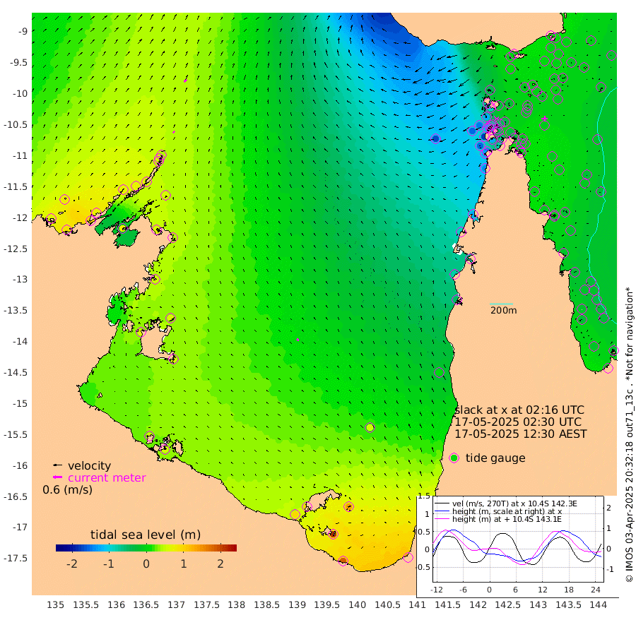 15cm/s 45T +3cm/s rms + 7cm/s -42T. ARA-GOC87 57m 15cm/s -55T +3cm/s rms + 2cm/s -2T. ARA-GOC87 60m 24cm/s 40T +2cm/s rms + 3cm/s 61T. ARA-GOC87 47m 0cm Daru 1cm Bobo Island -12cm Meer Island Barge -6cm Bramble Cay -4cm Unnamed Cay -2cm Pearce Cay -9cm Stephens Island -7cm Merrie England Shoals -5cm Mutacomal Reef -5cm Darnley Island Barge -19cm East Cay -1cm Yorke Island Barge -12cm Rennel Island -5cm Aureed Island -6cm Dungeness Reef -1cm Zagai Island -14cm Yam Island -7cm Dauan Island -7cm Saibai Island 10cm Phipi Reef 2cm Warrior Reef - West -42cm Mabuiag Island Barge -11cm Half Way Island -15cm Coconut Island -13cm Dugong Islet -15cm Poll Island -20cm Kirkcaldie Reef -27cm Suarji Island -10cm Sue Islet -123cm Hawkesbury Island -45cm Alert Patches -43cm Twin Island -98cm Badu Island -37cm St Pauls (Moa Island) -97cm Kubin (Moa Island) -61cm Ince Point -78cm Thursday Island -72cm Nardana Patches -93cm Turtle Head -109cm Round Island -126cm Goods Island -156cm Booby Island -148cm White Rocks Area -169cm Carpentaria -39cm Papou Point -177cm Bampfield Head -135cm Crab Island -154cm Red Wallis Island -122cm Packe Island -20cm Harrington Reef -145cm Herald Camp -2cm Sharp Point -82cm Red Island Point -66cm Possession Island -35cm Alpha Rock -32cm Frederick Point -12cm Wyborn Reef Light -15cm Tetley Island -18cm Triangle Reef -18cm Turtle Head Island -23cm Maclennan Cay -25cm Raine Island -10cm Mcsweeny Reef -8cm Collette Reef -14cm Shadwell Reef -5cm Hannibal Island -14cm Round Point -138cm Vrilya Point -19cm Cape Grenville -17cm Hicks Island -25cm Sir Charles Hardy Island -5cm Harvey Island -22cm Kay Reef -20cm Rocky Island -26cm Chapman Island -27cm Ham Reef -22cm Jubilee Reef -22cm Night Island -31cm Unnamed Reef No. 3 -22cm Morris Island -26cm 1st 3 Mile Opening -26cm Creech Reef -25cm Fife Island -19cm Eden Reef -25cm Stanley Island -20cm Normanby River 63cm Yabooma Island 88cm Hutchison River 75cm Elcho Island 77cm North West Crocodile Island 38cm Cape Wessel 72cm Stevens Island 69cm Guluwuru Island 63cm Hopeful Bay 50cm Auster Point 53cm Two Island Bay 98cm Cadell Strait 81cm Mallison Island 64cm Melville Bay (Gove Harbour) 56cm Truant Island 45cm Cape Arnhem 56cm Cape Grey 61cm Hawk Island 62cm Milner Bay (Groote Eylandt) 63cm Cape Beatrice 58cm West Island 54cm Centre Island 98cm Mornington Island 94cm West Wellesley Islands 139cm Bountiful Island 187cm Albert River Mouth 205cm Sweers Island 173cm Karumba 57cm Nassau River Offshore 1cm Christmas Creek -49cm Archer River -78cm Boyd Point -77cm Weipa (Humbug Point) -85cm Pennefather River -124cm Cullen Point