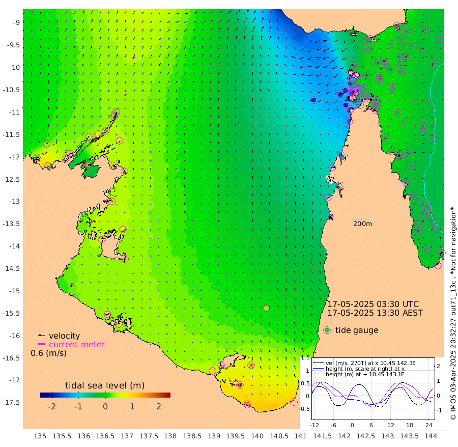 21cm/s 45T +3cm/s rms + 7cm/s -42T. ARA-GOC87 57m 16cm/s -30T +3cm/s rms + 2cm/s -2T. ARA-GOC87 60m 29cm/s 41T +2cm/s rms + 3cm/s 61T. ARA-GOC87 47m -12cm Daru -10cm Bobo Island -25cm Meer Island Barge -19cm Bramble Cay -16cm Unnamed Cay -19cm Pearce Cay -23cm Stephens Island -16cm Merrie England Shoals -14cm Mutacomal Reef -15cm Darnley Island Barge -33cm East Cay -11cm Yorke Island Barge -25cm Rennel Island -16cm Aureed Island -23cm Dungeness Reef -11cm Zagai Island -28cm Yam Island -26cm Dauan Island -15cm Saibai Island -20cm Phipi Reef -14cm Warrior Reef - West -54cm Mabuiag Island Barge -24cm Half Way Island -26cm Coconut Island -26cm Dugong Islet -28cm Poll Island -35cm Kirkcaldie Reef -43cm Suarji Island -17cm Sue Islet -157cm Hawkesbury Island -60cm Alert Patches -57cm Twin Island -129cm Badu Island -51cm St Pauls (Moa Island) -127cm Kubin (Moa Island) -79cm Ince Point -98cm Thursday Island -92cm Nardana Patches -121cm Turtle Head -140cm Round Island -160cm Goods Island -187cm Booby Island -179cm White Rocks Area -175cm Carpentaria -53cm Papou Point -207cm Bampfield Head -159cm Crab Island -181cm Red Wallis Island -153cm Packe Island -32cm Harrington Reef -182cm Herald Camp -2cm Sharp Point -107cm Red Island Point -87cm Possession Island -40cm Alpha Rock -44cm Frederick Point -19cm Wyborn Reef Light -22cm Tetley Island -29cm Triangle Reef -32cm Turtle Head Island -37cm Maclennan Cay -38cm Raine Island -20cm Mcsweeny Reef -17cm Collette Reef -24cm Shadwell Reef -15cm Hannibal Island -27cm Round Point -153cm Vrilya Point -30cm Cape Grenville -32cm Hicks Island -38cm Sir Charles Hardy Island -10cm Harvey Island -32cm Kay Reef -33cm Rocky Island -37cm Chapman Island -37cm Ham Reef -33cm Jubilee Reef -34cm Night Island -40cm Unnamed Reef No. 3 -36cm Morris Island -40cm 1st 3 Mile Opening -38cm Creech Reef -35cm Fife Island -35cm Eden Reef -36cm Stanley Island -34cm Normanby River 19cm Yabooma Island 35cm Hutchison River 33cm Elcho Island 33cm North West Crocodile Island 32cm Cape Wessel 47cm Stevens Island 66cm Guluwuru Island 39cm Hopeful Bay 33cm Auster Point 34cm Two Island Bay 66cm Cadell Strait 146cm Mallison Island 57cm Melville Bay (Gove Harbour) 52cm Truant Island 45cm Cape Arnhem 57cm Cape Grey 60cm Hawk Island 70cm Milner Bay (Groote Eylandt) 67cm Cape Beatrice 70cm West Island 65cm Centre Island 89cm Mornington Island 91cm West Wellesley Islands 116cm Bountiful Island 163cm Albert River Mouth 187cm Sweers Island 143cm Karumba 36cm Nassau River Offshore -21cm Christmas Creek -69cm Archer River -93cm Boyd Point -102cm Weipa (Humbug Point) -96cm Pennefather River -142cm Cullen Point