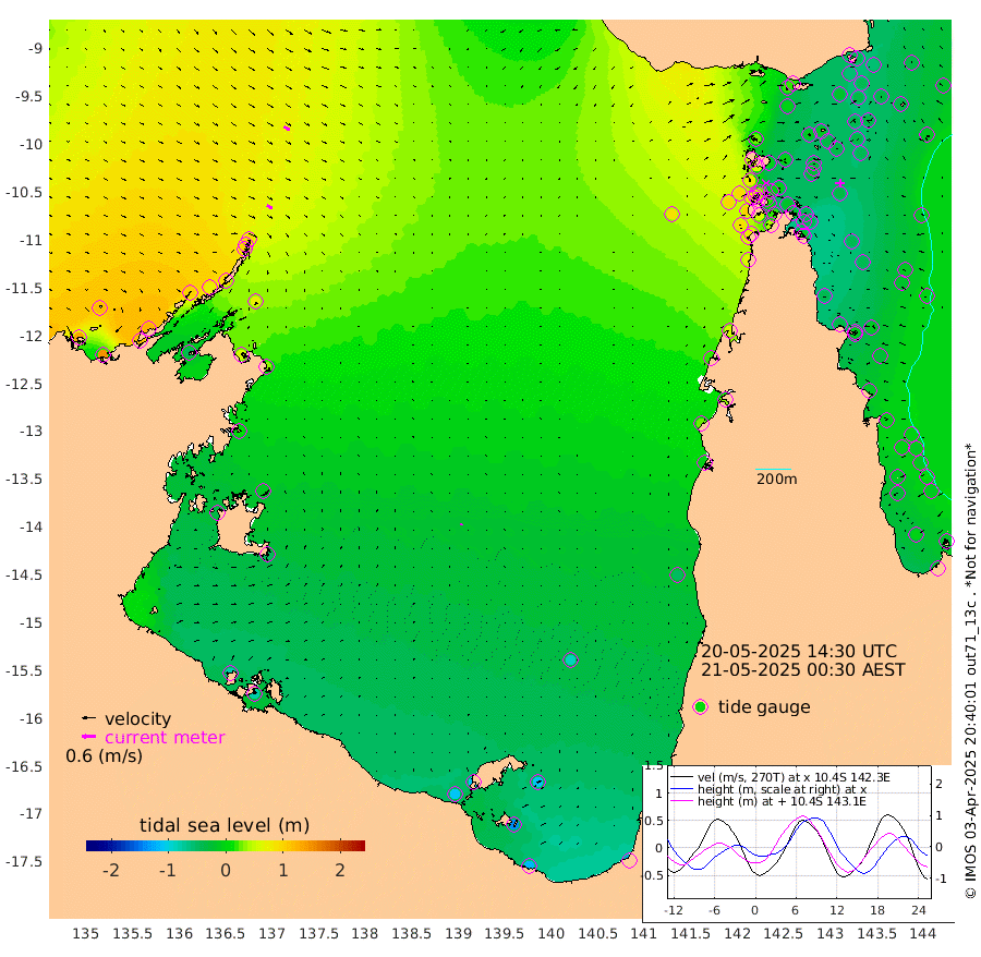 26cm/s 123T +3cm/s rms + 7cm/s -42T. ARA-GOC87 57m 8cm/s 30T +3cm/s rms + 2cm/s -2T. ARA-GOC87 60m 29cm/s 118T +2cm/s rms + 3cm/s 61T. ARA-GOC87 47m -48cm Daru -38cm Bobo Island -13cm Meer Island Barge -32cm Bramble Cay -45cm Unnamed Cay -31cm Pearce Cay -36cm Stephens Island -56cm Merrie England Shoals -55cm Mutacomal Reef -32cm Darnley Island Barge -18cm East Cay -35cm Yorke Island Barge -39cm Rennel Island -32cm Aureed Island -30cm Dungeness Reef -11cm Zagai Island -11cm Yam Island 19cm Dauan Island 16cm Saibai Island -3cm Phipi Reef -16cm Warrior Reef - West 28cm Mabuiag Island Barge -38cm Half Way Island -33cm Coconut Island -36cm Dugong Islet -23cm Poll Island -30cm Kirkcaldie Reef -7cm Suarji Island -25cm Sue Islet 80cm Hawkesbury Island -7cm Alert Patches -5cm Twin Island 74cm Badu Island -1cm St Pauls (Moa Island) 57cm Kubin (Moa Island) 16cm Ince Point 30cm Thursday Island 27cm Nardana Patches 46cm Turtle Head 60cm Round Island 80cm Goods Island 96cm Booby Island 91cm White Rocks Area 85cm Carpentaria 11cm Papou Point 105cm Bampfield Head 74cm Crab Island 85cm Red Wallis Island 55cm Packe Island -42cm Harrington Reef 79cm Herald Camp -12cm Sharp Point 43cm Red Island Point 21cm Possession Island -19cm Alpha Rock -22cm Frederick Point -43cm Wyborn Reef Light -40cm Tetley Island -11cm Triangle Reef -31cm Turtle Head Island -10cm Maclennan Cay -2cm Raine Island -40cm Mcsweeny Reef -40cm Collette Reef -21cm Shadwell Reef -45cm Hannibal Island -35cm Round Point 62cm Vrilya Point -33cm Cape Grenville -19cm Hicks Island -10cm Sir Charles Hardy Island -9cm Harvey Island -26cm Kay Reef -11cm Rocky Island -4cm Chapman Island -4cm Ham Reef -7cm Jubilee Reef -15cm Night Island -8cm Unnamed Reef No. 3 -12cm Morris Island 0cm 1st 3 Mile Opening -8cm Creech Reef -23cm Fife Island -7cm Eden Reef -17cm Stanley Island -17cm Normanby River 134cm Yabooma Island 149cm Hutchison River 126cm Elcho Island 120cm North West Crocodile Island 92cm Cape Wessel 101cm Stevens Island 70cm Guluwuru Island 90cm Hopeful Bay 96cm Auster Point 99cm Two Island Bay 117cm Cadell Strait -41cm Mallison Island 59cm Melville Bay (Gove Harbour) 69cm Truant Island 36cm Cape Arnhem 11cm Cape Grey -14cm Hawk Island -31cm Milner Bay (Groote Eylandt) -46cm Cape Beatrice -80cm West Island -77cm Centre Island -109cm Mornington Island -105cm West Wellesley Islands -105cm Bountiful Island -119cm Albert River Mouth -138cm Sweers Island -128cm Karumba -86cm Nassau River Offshore -49cm Christmas Creek -1cm Archer River 24cm Boyd Point 30cm Weipa (Humbug Point) 20cm Pennefather River 55cm Cullen Point