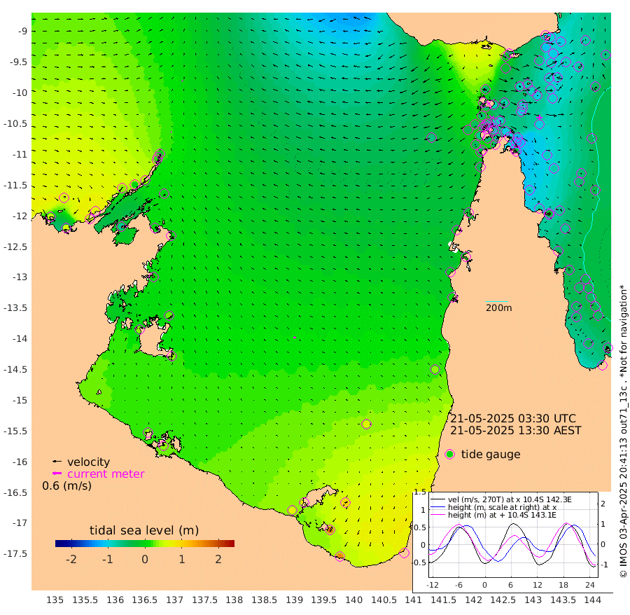 4cm/s -86T +3cm/s rms + 7cm/s -42T. ARA-GOC87 57m 15cm/s -82T +3cm/s rms + 2cm/s -2T. ARA-GOC87 60m 4cm/s 0T +2cm/s rms + 3cm/s 61T. ARA-GOC87 47m -100cm Daru -96cm Bobo Island -51cm Meer Island Barge -75cm Bramble Cay -99cm Unnamed Cay -83cm Pearce Cay -88cm Stephens Island -103cm Merrie England Shoals -112cm Mutacomal Reef -78cm Darnley Island Barge -63cm East Cay -87cm Yorke Island Barge -96cm Rennel Island -84cm Aureed Island -84cm Dungeness Reef -76cm Zagai Island -86cm Yam Island -26cm Dauan Island -46cm Saibai Island -23cm Phipi Reef -67cm Warrior Reef - West -57cm Mabuiag Island Barge -95cm Half Way Island -101cm Coconut Island -99cm Dugong Islet -89cm Poll Island -101cm Kirkcaldie Reef -82cm Suarji Island -94cm Sue Islet -56cm Hawkesbury Island -87cm Alert Patches -92cm Twin Island -45cm Badu Island -84cm St Pauls (Moa Island) -57cm Kubin (Moa Island) -75cm Ince Point -70cm Thursday Island -69cm Nardana Patches -53cm Turtle Head -57cm Round Island -43cm Goods Island -42cm Booby Island -50cm White Rocks Area -67cm Carpentaria -84cm Papou Point -71cm Bampfield Head -35cm Crab Island -47cm Red Wallis Island -53cm Packe Island -115cm Harrington Reef -54cm Herald Camp -24cm Sharp Point -60cm Red Island Point -72cm Possession Island -98cm Alpha Rock -102cm Frederick Point -114cm Wyborn Reef Light -113cm Tetley Island -52cm Triangle Reef -112cm Turtle Head Island -57cm Maclennan Cay -37cm Raine Island -90cm Mcsweeny Reef -82cm Collette Reef -54cm Shadwell Reef -88cm Hannibal Island -79cm Round Point -38cm Vrilya Point -75cm Cape Grenville -64cm Hicks Island -69cm Sir Charles Hardy Island -22cm Harvey Island -69cm Kay Reef -47cm Rocky Island -41cm Chapman Island -44cm Ham Reef -47cm Jubilee Reef -41cm Night Island -46cm Unnamed Reef No. 3 -49cm Morris Island -40cm 1st 3 Mile Opening -46cm Creech Reef -46cm Fife Island -42cm Eden Reef -52cm Stanley Island -58cm Normanby River 51cm Yabooma Island 60cm Hutchison River 60cm Elcho Island 59cm North West Crocodile Island -2cm Cape Wessel 32cm Stevens Island -7cm Guluwuru Island 39cm Hopeful Bay 18cm Auster Point 22cm Two Island Bay 46cm Cadell Strait -74cm Mallison Island 7cm Melville Bay (Gove Harbour) -1cm Truant Island 3cm Cape Arnhem 8cm Cape Grey 26cm Hawk Island 30cm Milner Bay (Groote Eylandt) 36cm Cape Beatrice 33cm West Island 36cm Centre Island 78cm Mornington Island 73cm West Wellesley Islands 102cm Bountiful Island 156cm Albert River Mouth 165cm Sweers Island 149cm Karumba 64cm Nassau River Offshore 31cm Christmas Creek 8cm Archer River -13cm Boyd Point 0cm Weipa (Humbug Point) -14cm Pennefather River -28cm Cullen Point