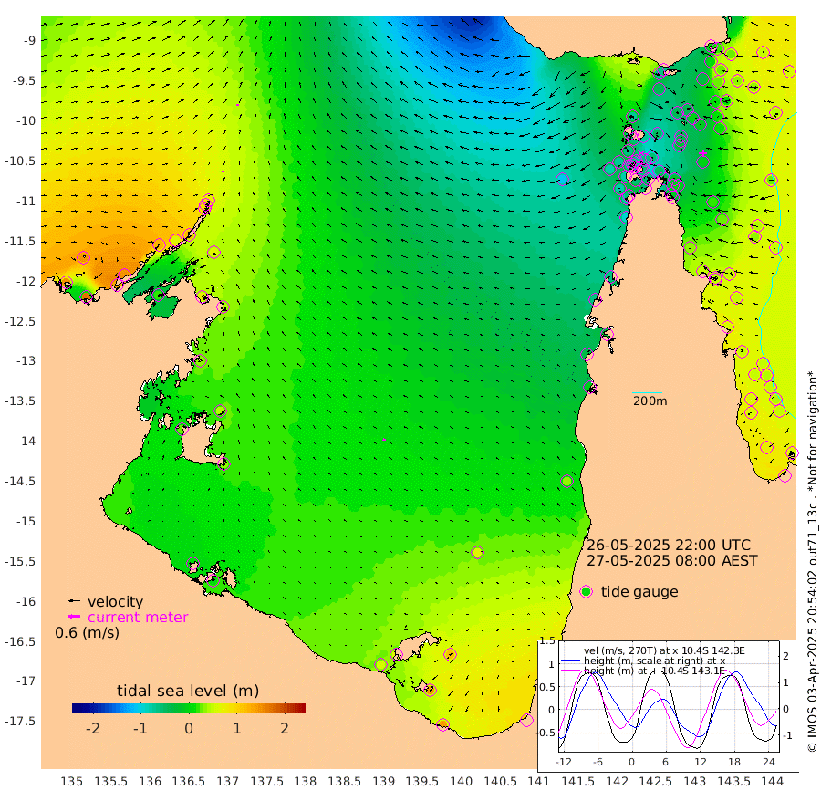 8cm/s -44T +3cm/s rms + 7cm/s -42T. ARA-GOC87 57m 14cm/s -86T +3cm/s rms + 2cm/s -2T. ARA-GOC87 60m 8cm/s 6T +2cm/s rms + 3cm/s 61T. ARA-GOC87 47m 4cm Daru 15cm Bobo Island 44cm Meer Island Barge 47cm Bramble Cay 25cm Unnamed Cay 26cm Pearce Cay 33cm Stephens Island 29cm Merrie England Shoals 6cm Mutacomal Reef 30cm Darnley Island Barge 54cm East Cay 13cm Yorke Island Barge 14cm Rennel Island 11cm Aureed Island -6cm Dungeness Reef -44cm Zagai Island -38cm Yam Island -63cm Dauan Island -66cm Saibai Island -40cm Phipi Reef -37cm Warrior Reef - West -75cm Mabuiag Island Barge 9cm Half Way Island -13cm Coconut Island -2cm Dugong Islet -30cm Poll Island -26cm Kirkcaldie Reef -51cm Suarji Island -39cm Sue Islet -64cm Hawkesbury Island -65cm Alert Patches -59cm Twin Island -71cm Badu Island -70cm St Pauls (Moa Island) -59cm Kubin (Moa Island) -68cm Ince Point -73cm Thursday Island -72cm Nardana Patches -63cm Turtle Head -56cm Round Island -61cm Goods Island -79cm Booby Island -68cm White Rocks Area -108cm Carpentaria -57cm Papou Point -79cm Bampfield Head -75cm Crab Island -77cm Red Wallis Island -58cm Packe Island -9cm Harrington Reef -54cm Herald Camp -27cm Sharp Point -53cm Red Island Point -56cm Possession Island -52cm Alpha Rock -37cm Frederick Point -6cm Wyborn Reef Light -16cm Tetley Island 27cm Triangle Reef -10cm Turtle Head Island 40cm Maclennan Cay 45cm Raine Island 20cm Mcsweeny Reef 25cm Collette Reef 34cm Shadwell Reef 34cm Hannibal Island 48cm Round Point -91cm Vrilya Point 43cm Cape Grenville 48cm Hicks Island 50cm Sir Charles Hardy Island 13cm Harvey Island 52cm Kay Reef 53cm Rocky Island 52cm Chapman Island 47cm Ham Reef 46cm Jubilee Reef 42cm Night Island 46cm Unnamed Reef No. 3 55cm Morris Island 42cm 1st 3 Mile Opening 46cm Creech Reef 54cm Fife Island 69cm Eden Reef 53cm Stanley Island 68cm Normanby River 150cm Yabooma Island 172cm Hutchison River 148cm Elcho Island 148cm North West Crocodile Island 76cm Cape Wessel 121cm Stevens Island 67cm Guluwuru Island 122cm Hopeful Bay 89cm Auster Point 97cm Two Island Bay 134cm Cadell Strait 18cm Mallison Island 71cm Melville Bay (Gove Harbour) 64cm Truant Island 39cm Cape Arnhem 37cm Cape Grey 39cm Hawk Island 26cm Milner Bay (Groote Eylandt) 30cm Cape Beatrice 13cm West Island 6cm Centre Island 64cm Mornington Island 57cm West Wellesley Islands 119cm Bountiful Island 135cm Albert River Mouth 139cm Sweers Island 134cm Karumba 61cm Nassau River Offshore 31cm Christmas Creek -7cm Archer River -33cm Boyd Point -16cm Weipa (Humbug Point) -63cm Pennefather River -65cm Cullen Point