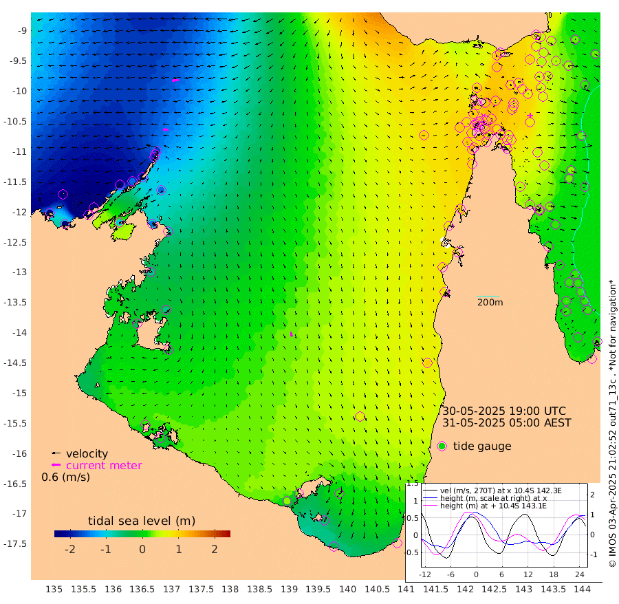 36cm/s -89T +3cm/s rms + 7cm/s -42T. ARA-GOC87 57m 35cm/s 168T +3cm/s rms + 2cm/s -2T. ARA-GOC87 60m 48cm/s -96T +2cm/s rms + 3cm/s 61T. ARA-GOC87 47m 69cm Daru 47cm Bobo Island 20cm Meer Island Barge 24cm Bramble Cay 49cm Unnamed Cay 42cm Pearce Cay 44cm Stephens Island 46cm Merrie England Shoals 65cm Mutacomal Reef 41cm Darnley Island Barge 23cm East Cay 53cm Yorke Island Barge 59cm Rennel Island 53cm Aureed Island 76cm Dungeness Reef 81cm Zagai Island 97cm Yam Island 110cm Dauan Island 102cm Saibai Island 109cm Phipi Reef 99cm Warrior Reef - West 98cm Mabuiag Island Barge 62cm Half Way Island 67cm Coconut Island 76cm Dugong Islet 82cm Poll Island 97cm Kirkcaldie Reef 98cm Suarji Island 88cm Sue Islet 108cm Hawkesbury Island 108cm Alert Patches 101cm Twin Island 101cm Badu Island 109cm St Pauls (Moa Island) 103cm Kubin (Moa Island) 107cm Ince Point 111cm Thursday Island 109cm Nardana Patches 111cm Turtle Head 96cm Round Island 103cm Goods Island 109cm Booby Island 97cm White Rocks Area 103cm Carpentaria 88cm Papou Point 98cm Bampfield Head 98cm Crab Island 110cm Red Wallis Island 113cm Packe Island 77cm Harrington Reef 125cm Herald Camp 38cm Sharp Point 101cm Red Island Point 93cm Possession Island 88cm Alpha Rock 90cm Frederick Point 60cm Wyborn Reef Light 66cm Tetley Island 27cm Triangle Reef 61cm Turtle Head Island 32cm Maclennan Cay 15cm Raine Island 49cm Mcsweeny Reef 42cm Collette Reef 28cm Shadwell Reef 39cm Hannibal Island 26cm Round Point 103cm Vrilya Point 33cm Cape Grenville 28cm Hicks Island 37cm Sir Charles Hardy Island 12cm Harvey Island 22cm Kay Reef 18cm Rocky Island 13cm Chapman Island 17cm Ham Reef 19cm Jubilee Reef 21cm Night Island 18cm Unnamed Reef No. 3 17cm Morris Island 20cm 1st 3 Mile Opening 22cm Creech Reef 21cm Fife Island 5cm Eden Reef 21cm Stanley Island 13cm Normanby River -237cm Yabooma Island -281cm Hutchison River -252cm Elcho Island -238cm North West Crocodile Island -173cm Cape Wessel -233cm Stevens Island -152cm Guluwuru Island -214cm Hopeful Bay -189cm Auster Point -189cm Two Island Bay -235cm Cadell Strait -105cm Mallison Island -144cm Melville Bay (Gove Harbour) -151cm Truant Island -96cm Cape Arnhem -71cm Cape Grey -64cm Hawk Island -49cm Milner Bay (Groote Eylandt) -29cm Cape Beatrice 15cm West Island 12cm Centre Island 29cm Mornington Island 33cm West Wellesley Islands 18cm Bountiful Island -39cm Albert River Mouth -58cm Sweers Island -12cm Karumba 72cm Nassau River Offshore 99cm Christmas Creek 85cm Archer River 89cm Boyd Point 89cm Weipa (Humbug Point) 81cm Pennefather River 100cm Cullen Point
