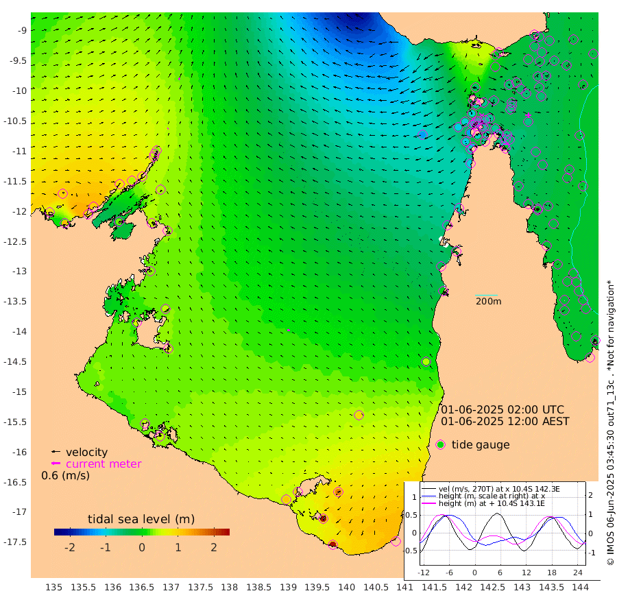 5cm/s 31T +3cm/s rms + 7cm/s -42T. ARA-GOC87 57m 19cm/s -73T +3cm/s rms + 2cm/s -2T. ARA-GOC87 60m 12cm/s 41T +2cm/s rms + 3cm/s 61T. ARA-GOC87 47m -49cm Daru -44cm Bobo Island -29cm Meer Island Barge -31cm Bramble Cay -47cm Unnamed Cay -37cm Pearce Cay -47cm Stephens Island -46cm Merrie England Shoals -51cm Mutacomal Reef -42cm Darnley Island Barge -33cm East Cay -47cm Yorke Island Barge -52cm Rennel Island -42cm Aureed Island -46cm Dungeness Reef -42cm Zagai Island -54cm Yam Island -19cm Dauan Island -29cm Saibai Island -4cm Phipi Reef -32cm Warrior Reef - West -54cm Mabuiag Island Barge -56cm Half Way Island -54cm Coconut Island -61cm Dugong Islet -53cm Poll Island -66cm Kirkcaldie Reef -54cm Suarji Island -60cm Sue Islet -96cm Hawkesbury Island -70cm Alert Patches -71cm Twin Island -66cm Badu Island -68cm St Pauls (Moa Island) -82cm Kubin (Moa Island) -72cm Ince Point -79cm Thursday Island -75cm Nardana Patches -72cm Turtle Head -90cm Round Island -81cm Goods Island -101cm Booby Island -93cm White Rocks Area -133cm Carpentaria -69cm Papou Point -135cm Bampfield Head -88cm Crab Island -98cm Red Wallis Island -83cm Packe Island -70cm Harrington Reef -113cm Herald Camp -17cm Sharp Point -72cm Red Island Point -80cm Possession Island -69cm Alpha Rock -69cm Frederick Point -59cm Wyborn Reef Light -62cm Tetley Island -28cm Triangle Reef -76cm Turtle Head Island -37cm Maclennan Cay -22cm Raine Island -47cm Mcsweeny Reef -40cm Collette Reef -28cm Shadwell Reef -40cm Hannibal Island -35cm Round Point -99cm Vrilya Point -40cm Cape Grenville -36cm Hicks Island -39cm Sir Charles Hardy Island -14cm Harvey Island -34cm Kay Reef -25cm Rocky Island -18cm Chapman Island -27cm Ham Reef -27cm Jubilee Reef -24cm Night Island -26cm Unnamed Reef No. 3 -26cm Morris Island -29cm 1st 3 Mile Opening -29cm Creech Reef -26cm Fife Island -19cm Eden Reef -31cm Stanley Island -30cm Normanby River 90cm Yabooma Island 116cm Hutchison River 105cm Elcho Island 104cm North West Crocodile Island 34cm Cape Wessel 85cm Stevens Island 41cm Guluwuru Island 82cm Hopeful Bay 50cm Auster Point 45cm Two Island Bay 95cm Cadell Strait 23cm Mallison Island 48cm Melville Bay (Gove Harbour) 38cm Truant Island 31cm Cape Arnhem 36cm Cape Grey 51cm Hawk Island 53cm Milner Bay (Groote Eylandt) 59cm Cape Beatrice 49cm West Island 48cm Centre Island 113cm Mornington Island 109cm West Wellesley Islands 159cm Bountiful Island 225cm Albert River Mouth 231cm Sweers Island 207cm Karumba 90cm Nassau River Offshore 38cm Christmas Creek -7cm Archer River -44cm Boyd Point -29cm Weipa (Humbug Point) -55cm Pennefather River -83cm Cullen Point