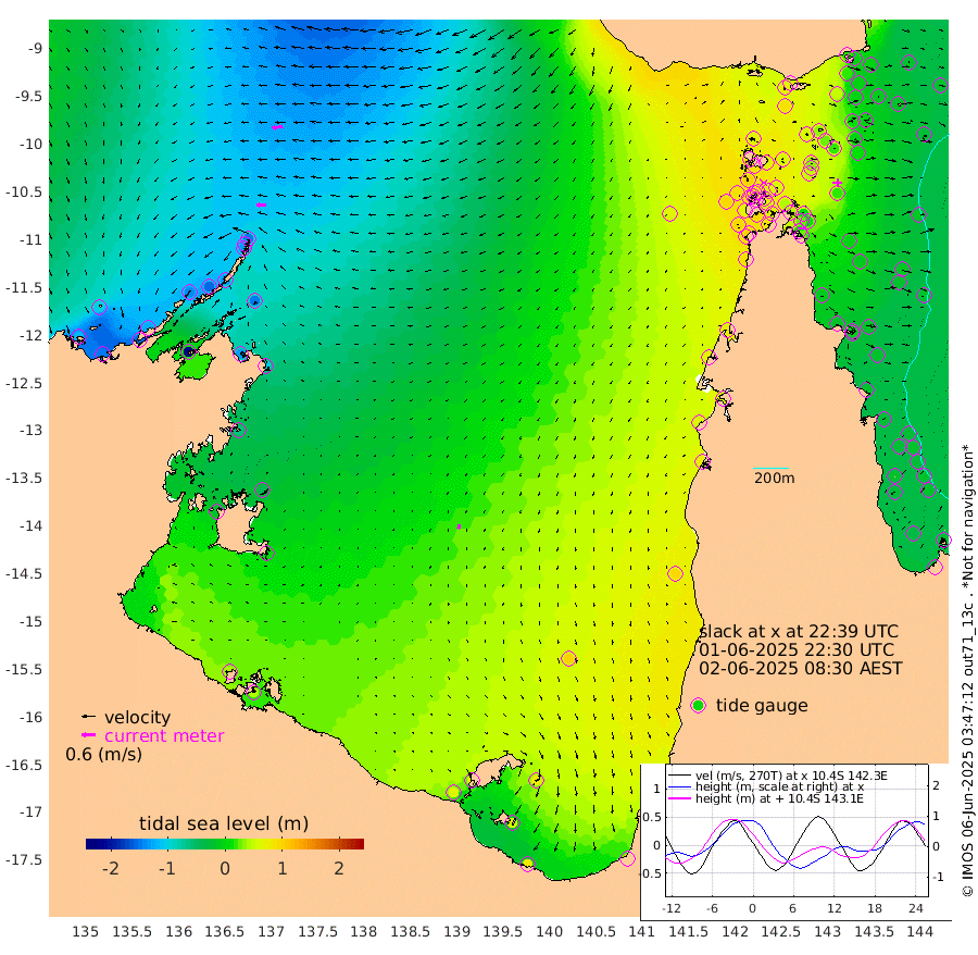 43cm/s -92T +3cm/s rms + 7cm/s -42T. ARA-GOC87 57m 19cm/s -166T +3cm/s rms + 2cm/s -2T. ARA-GOC87 60m 47cm/s -100T +2cm/s rms + 3cm/s 61T. ARA-GOC87 47m 16cm Daru -2cm Bobo Island -23cm Meer Island Barge -17cm Bramble Cay -1cm Unnamed Cay -4cm Pearce Cay -8cm Stephens Island -1cm Merrie England Shoals 16cm Mutacomal Reef -15cm Darnley Island Barge -21cm East Cay -4cm Yorke Island Barge 9cm Rennel Island -1cm Aureed Island 30cm Dungeness Reef 34cm Zagai Island 54cm Yam Island 68cm Dauan Island 54cm Saibai Island 88cm Phipi Reef 51cm Warrior Reef - West 67cm Mabuiag Island Barge 13cm Half Way Island 19cm Coconut Island 22cm Dugong Islet 37cm Poll Island 51cm Kirkcaldie Reef 54cm Suarji Island 33cm Sue Islet 98cm Hawkesbury Island 66cm Alert Patches 59cm Twin Island 92cm Badu Island 67cm St Pauls (Moa Island) 83cm Kubin (Moa Island) 73cm Ince Point 80cm Thursday Island 78cm Nardana Patches 87cm Turtle Head 80cm Round Island 91cm Goods Island 95cm Booby Island 88cm White Rocks Area 61cm Carpentaria 56cm Papou Point 63cm Bampfield Head 88cm Crab Island 94cm Red Wallis Island 95cm Packe Island 23cm Harrington Reef 99cm Herald Camp 26cm Sharp Point 89cm Red Island Point 64cm Possession Island 41cm Alpha Rock 42cm Frederick Point 8cm Wyborn Reef Light 14cm Tetley Island -13cm Triangle Reef 10cm Turtle Head Island -12cm Maclennan Cay -21cm Raine Island -4cm Mcsweeny Reef -9cm Collette Reef -16cm Shadwell Reef -12cm Hannibal Island -17cm Round Point 85cm Vrilya Point -12cm Cape Grenville -15cm Hicks Island -18cm Sir Charles Hardy Island -3cm Harvey Island -20cm Kay Reef -21cm Rocky Island -28cm Chapman Island -26cm Ham Reef -23cm Jubilee Reef -16cm Night Island -23cm Unnamed Reef No. 3 -22cm Morris Island -21cm 1st 3 Mile Opening -21cm Creech Reef -28cm Fife Island -35cm Eden Reef -23cm Stanley Island -28cm Normanby River -120cm Yabooma Island -143cm Hutchison River -124cm Elcho Island -104cm North West Crocodile Island -143cm Cape Wessel -141cm Stevens Island -152cm Guluwuru Island -128cm Hopeful Bay -135cm Auster Point -131cm Two Island Bay -155cm Cadell Strait -247cm Mallison Island -130cm Melville Bay (Gove Harbour) -146cm Truant Island -99cm Cape Arnhem -62cm Cape Grey -42cm Hawk Island -21cm Milner Bay (Groote Eylandt) 3cm Cape Beatrice 42cm West Island 42cm Centre Island 71cm Mornington Island 61cm West Wellesley Islands 82cm Bountiful Island 76cm Albert River Mouth 59cm Sweers Island 100cm Karumba 98cm Nassau River Offshore 94cm Christmas Creek 75cm Archer River 62cm Boyd Point 73cm Weipa (Humbug Point) 69cm Pennefather River 77cm Cullen Point