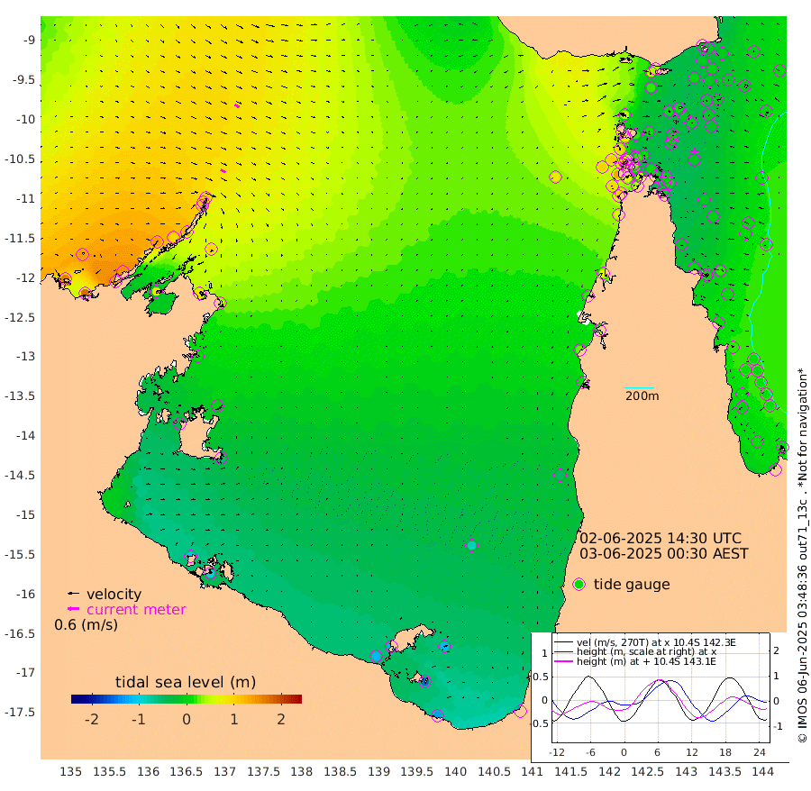 27cm/s 121T +3cm/s rms + 7cm/s -42T. ARA-GOC87 57m 3cm/s 85T +3cm/s rms + 2cm/s -2T. ARA-GOC87 60m 27cm/s 114T +2cm/s rms + 3cm/s 61T. ARA-GOC87 47m -14cm Daru -13cm Bobo Island 4cm Meer Island Barge 0cm Bramble Cay -5cm Unnamed Cay -10cm Pearce Cay -11cm Stephens Island -12cm Merrie England Shoals -10cm Mutacomal Reef -8cm Darnley Island Barge 2cm East Cay -10cm Yorke Island Barge -10cm Rennel Island -14cm Aureed Island -8cm Dungeness Reef 8cm Zagai Island 10cm Yam Island 41cm Dauan Island 38cm Saibai Island 19cm Phipi Reef 6cm Warrior Reef - West 47cm Mabuiag Island Barge -16cm Half Way Island -7cm Coconut Island -14cm Dugong Islet -1cm Poll Island -10cm Kirkcaldie Reef 8cm Suarji Island 0cm Sue Islet 104cm Hawkesbury Island 16cm Alert Patches 14cm Twin Island 91cm Badu Island 16cm St Pauls (Moa Island) 75cm Kubin (Moa Island) 33cm Ince Point 45cm Thursday Island 43cm Nardana Patches 62cm Turtle Head 88cm Round Island 93cm Goods Island 102cm Booby Island 99cm White Rocks Area 78cm Carpentaria 21cm Papou Point 131cm Bampfield Head 77cm Crab Island 93cm Red Wallis Island 76cm Packe Island -20cm Harrington Reef 104cm Herald Camp -7cm Sharp Point 48cm Red Island Point 40cm Possession Island 13cm Alpha Rock 1cm Frederick Point 0cm Wyborn Reef Light 3cm Tetley Island 10cm Triangle Reef -2cm Turtle Head Island 5cm Maclennan Cay 13cm Raine Island -10cm Mcsweeny Reef -6cm Collette Reef 6cm Shadwell Reef -8cm Hannibal Island 1cm Round Point 60cm Vrilya Point -3cm Cape Grenville 3cm Hicks Island 15cm Sir Charles Hardy Island -2cm Harvey Island 5cm Kay Reef 10cm Rocky Island 18cm Chapman Island 15cm Ham Reef 11cm Jubilee Reef 3cm Night Island 11cm Unnamed Reef No. 3 8cm Morris Island 15cm 1st 3 Mile Opening 8cm Creech Reef -3cm Fife Island 14cm Eden Reef 6cm Stanley Island 4cm Normanby River 160cm Yabooma Island 175cm Hutchison River 147cm Elcho Island 137cm North West Crocodile Island 110cm Cape Wessel 138cm Stevens Island 93cm Guluwuru Island 127cm Hopeful Bay 118cm Auster Point 118cm Two Island Bay 137cm Cadell Strait 82cm Mallison Island 83cm Melville Bay (Gove Harbour) 95cm Truant Island 52cm Cape Arnhem 14cm Cape Grey -4cm Hawk Island -39cm Milner Bay (Groote Eylandt) -56cm Cape Beatrice -105cm West Island -102cm Centre Island -120cm Mornington Island -116cm West Wellesley Islands -117cm Bountiful Island -134cm Albert River Mouth -151cm Sweers Island -141cm Karumba -89cm Nassau River Offshore -45cm Christmas Creek 6cm Archer River 30cm Boyd Point 38cm Weipa (Humbug Point) 22cm Pennefather River 61cm Cullen Point