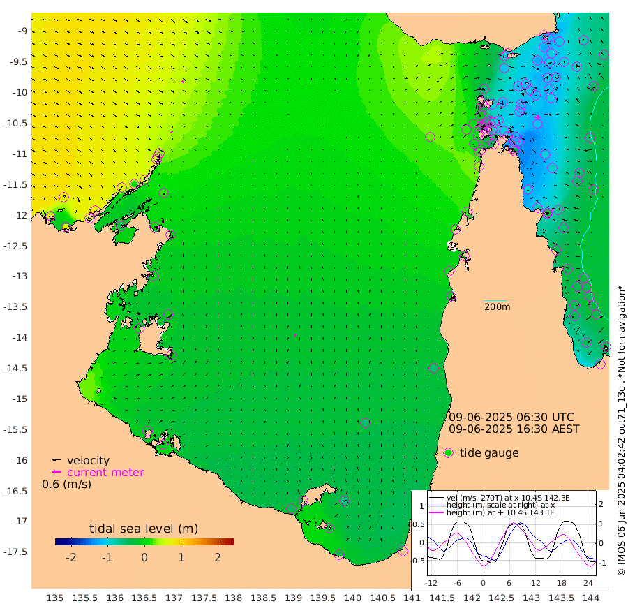11cm/s 124T +3cm/s rms + 7cm/s -42T. ARA-GOC87 57m 15cm/s 5T +3cm/s rms + 2cm/s -2T. ARA-GOC87 60m 14cm/s 119T +2cm/s rms + 3cm/s 61T. ARA-GOC87 47m -114cm Daru -114cm Bobo Island -49cm Meer Island Barge -77cm Bramble Cay -101cm Unnamed Cay -104cm Pearce Cay -90cm Stephens Island -99cm Merrie England Shoals -121cm Mutacomal Reef -83cm Darnley Island Barge -61cm East Cay -98cm Yorke Island Barge -103cm Rennel Island -110cm Aureed Island -111cm Dungeness Reef -116cm Zagai Island -117cm Yam Island -95cm Dauan Island -101cm Saibai Island -109cm Phipi Reef -126cm Warrior Reef - West -70cm Mabuiag Island Barge -99cm Half Way Island -116cm Coconut Island -110cm Dugong Islet -113cm Poll Island -112cm Kirkcaldie Reef -121cm Suarji Island -110cm Sue Islet -13cm Hawkesbury Island -97cm Alert Patches -103cm Twin Island -29cm Badu Island -102cm St Pauls (Moa Island) -37cm Kubin (Moa Island) -77cm Ince Point -61cm Thursday Island -66cm Nardana Patches -45cm Turtle Head -24cm Round Island -10cm Goods Island 17cm Booby Island 1cm White Rocks Area 25cm Carpentaria -88cm Papou Point 14cm Bampfield Head 22cm Crab Island 4cm Red Wallis Island -33cm Packe Island -120cm Harrington Reef -10cm Herald Camp -35cm Sharp Point -46cm Red Island Point -64cm Possession Island -100cm Alpha Rock -110cm Frederick Point -114cm Wyborn Reef Light -115cm Tetley Island -59cm Triangle Reef -95cm Turtle Head Island -56cm Maclennan Cay -30cm Raine Island -92cm Mcsweeny Reef -85cm Collette Reef -52cm Shadwell Reef -91cm Hannibal Island -77cm Round Point 35cm Vrilya Point -69cm Cape Grenville -61cm Hicks Island -71cm Sir Charles Hardy Island -20cm Harvey Island -58cm Kay Reef -45cm Rocky Island -43cm Chapman Island -37cm Ham Reef -40cm Jubilee Reef -39cm Night Island -40cm Unnamed Reef No. 3 -43cm Morris Island -30cm 1st 3 Mile Opening -39cm Creech Reef -39cm Fife Island -41cm Eden Reef -40cm Stanley Island -49cm Normanby River 78cm Yabooma Island 72cm Hutchison River 77cm Elcho Island 72cm North West Crocodile Island 32cm Cape Wessel 62cm Stevens Island 6cm Guluwuru Island 60cm Hopeful Bay 51cm Auster Point 60cm Two Island Bay 56cm Cadell Strait -41cm Mallison Island 14cm Melville Bay (Gove Harbour) 17cm Truant Island 6cm Cape Arnhem 0cm Cape Grey -3cm Hawk Island 3cm Milner Bay (Groote Eylandt) -6cm Cape Beatrice -15cm West Island -14cm Centre Island -49cm Mornington Island -51cm West Wellesley Islands -68cm Bountiful Island -43cm Albert River Mouth -28cm Sweers Island -46cm Karumba -58cm Nassau River Offshore -54cm Christmas Creek -18cm Archer River -7cm Boyd Point -7cm Weipa (Humbug Point) 24cm Pennefather River 18cm Cullen Point